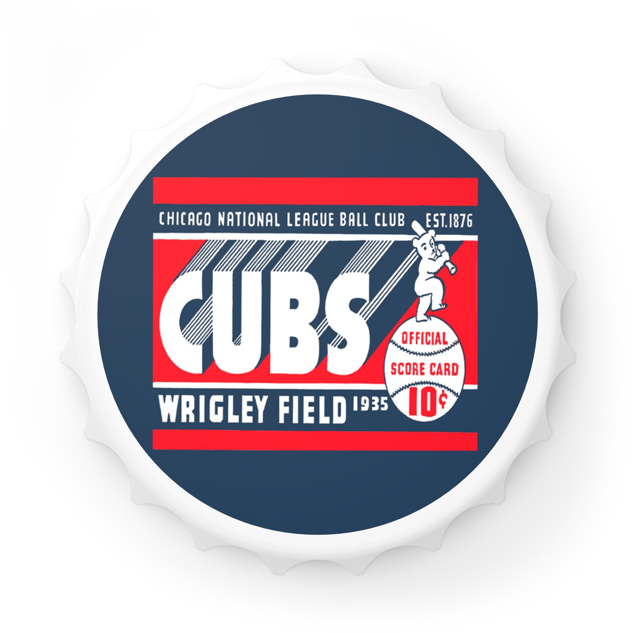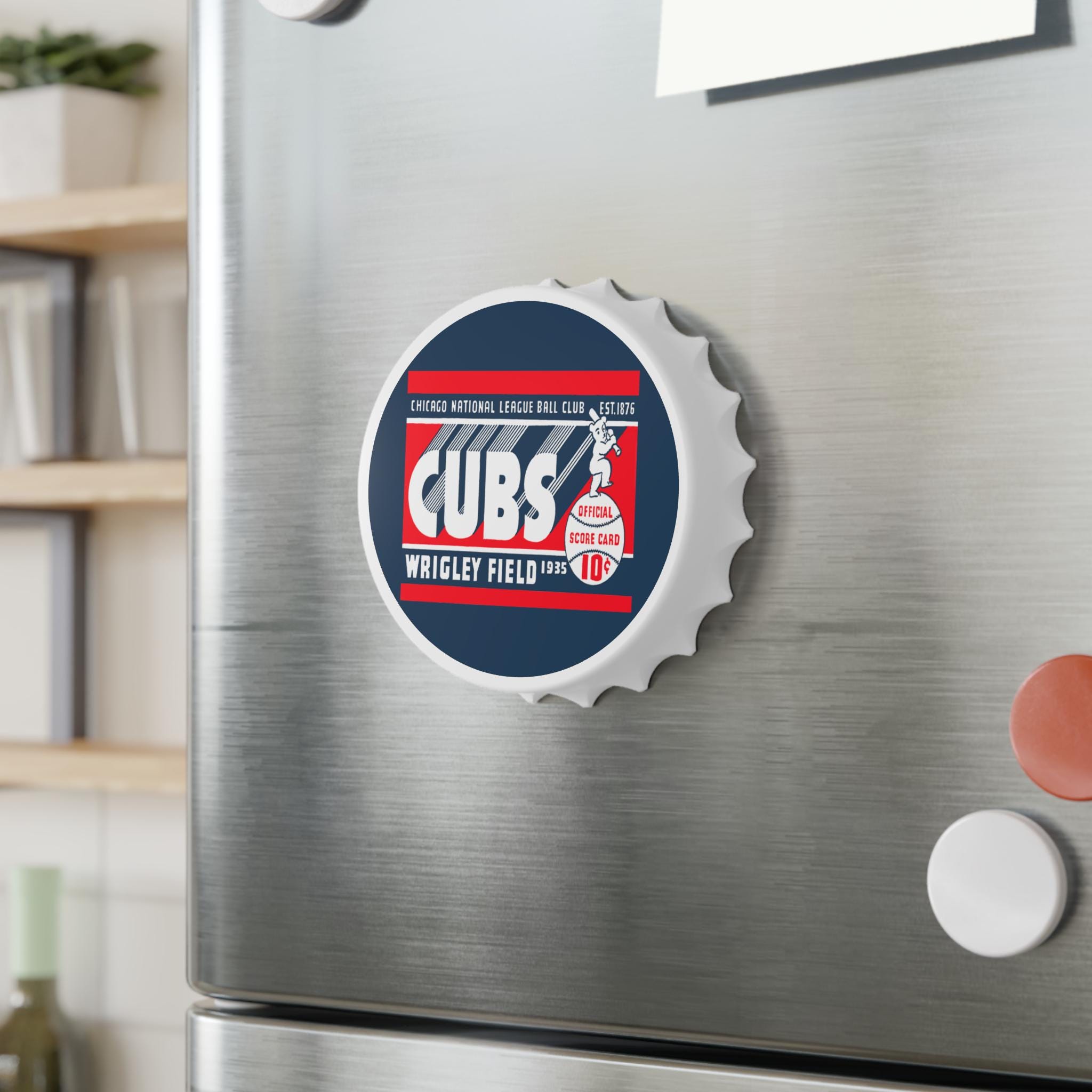 Vintage 1935 Baseball Chicago Cubs bottle opener with vibrant colors, giving a nostalgic and sporty vibe. Perfect for baseball fans, sports enthusiasts, and collectors. Relevant for Father's Day, sports seasons, birthdays, and game nights.