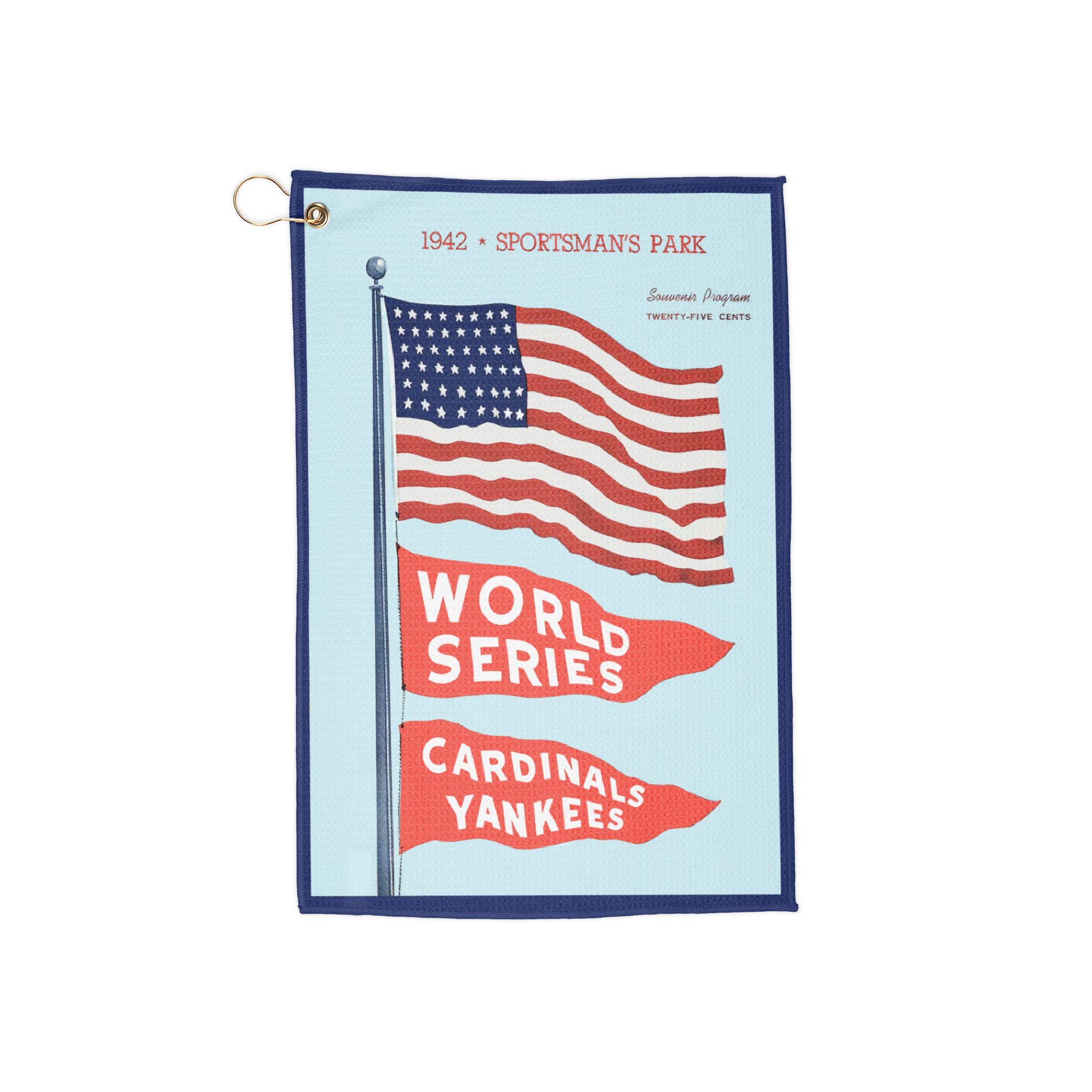 Vintage 1942 Baseball World Series Cardinals-Yankees design on a versatile golf towel. Perfect for sports enthusiasts and history buffs. Ideal for golfers, gym-goers, and travelers. Great gift for Father's Day, sports fans, and history aficionados.