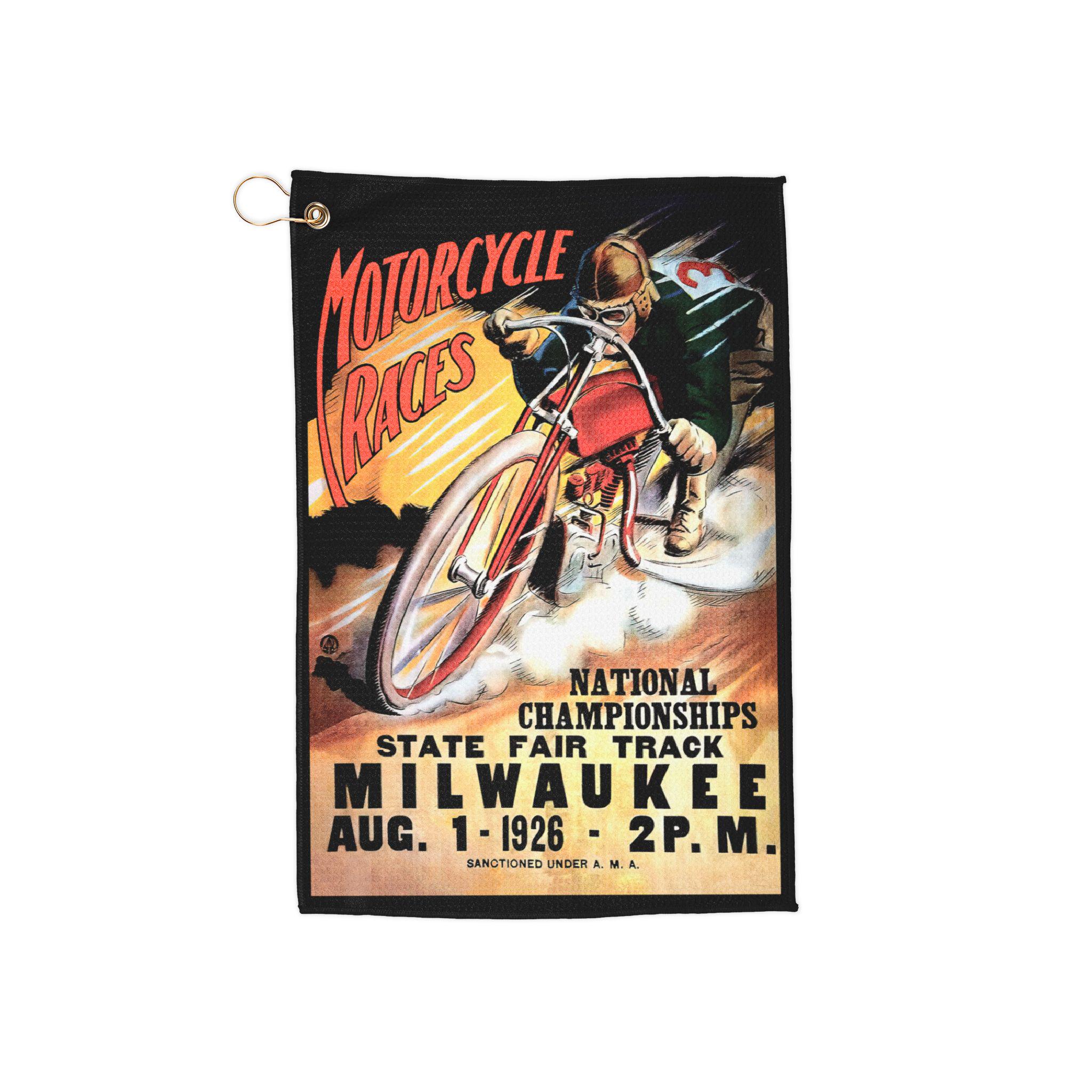 These vintage-inspired golf towels feature a design from 1926 motorcycle racing, giving off a classic and adventurous vibe. Perfect for golf enthusiasts looking to add a unique touch to their gear. Ideal for Father's Day, birthdays, and any golf-related occasions.