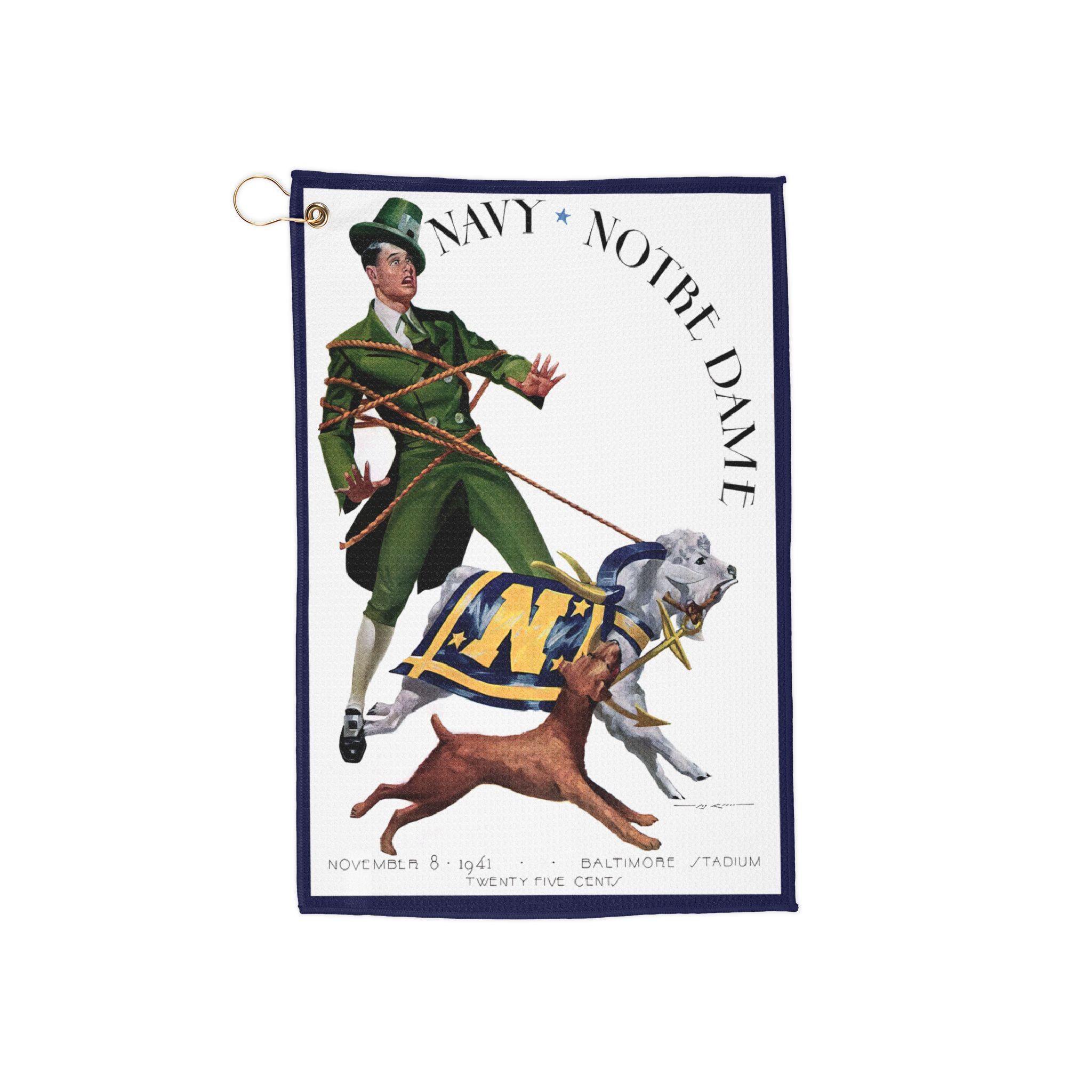 This sports-themed towel featuring the 1941 Football Navy-Notre Dame design is perfect for any sports enthusiast. The absorbent microfiber material makes it ideal for use while traveling, camping, swimming, or at the gym. With a touch of nostalgia and a functional design, this towel is a great addition to your active lifestyle. Perfect for fans of Navy or Notre Dame football, this towel is great for sports events, tailgating parties, and game day celebrations.