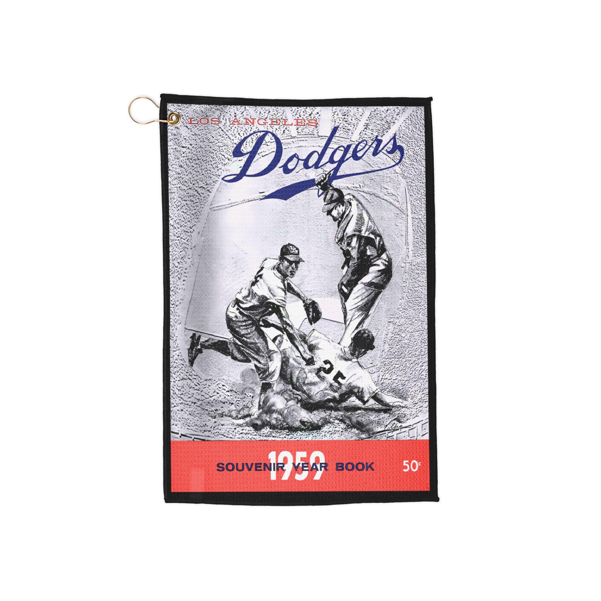 Get a nostalgic feel with this 1959 Baseball Los Angeles Dodgers golf towel, perfect for any baseball fan hitting the links. The absorbent microfiber material makes it ideal for use while traveling, camping, or at the gym. With a gold grommet and ring, this towel is both practical and stylish for any Los Angeles Dodgers supporter.