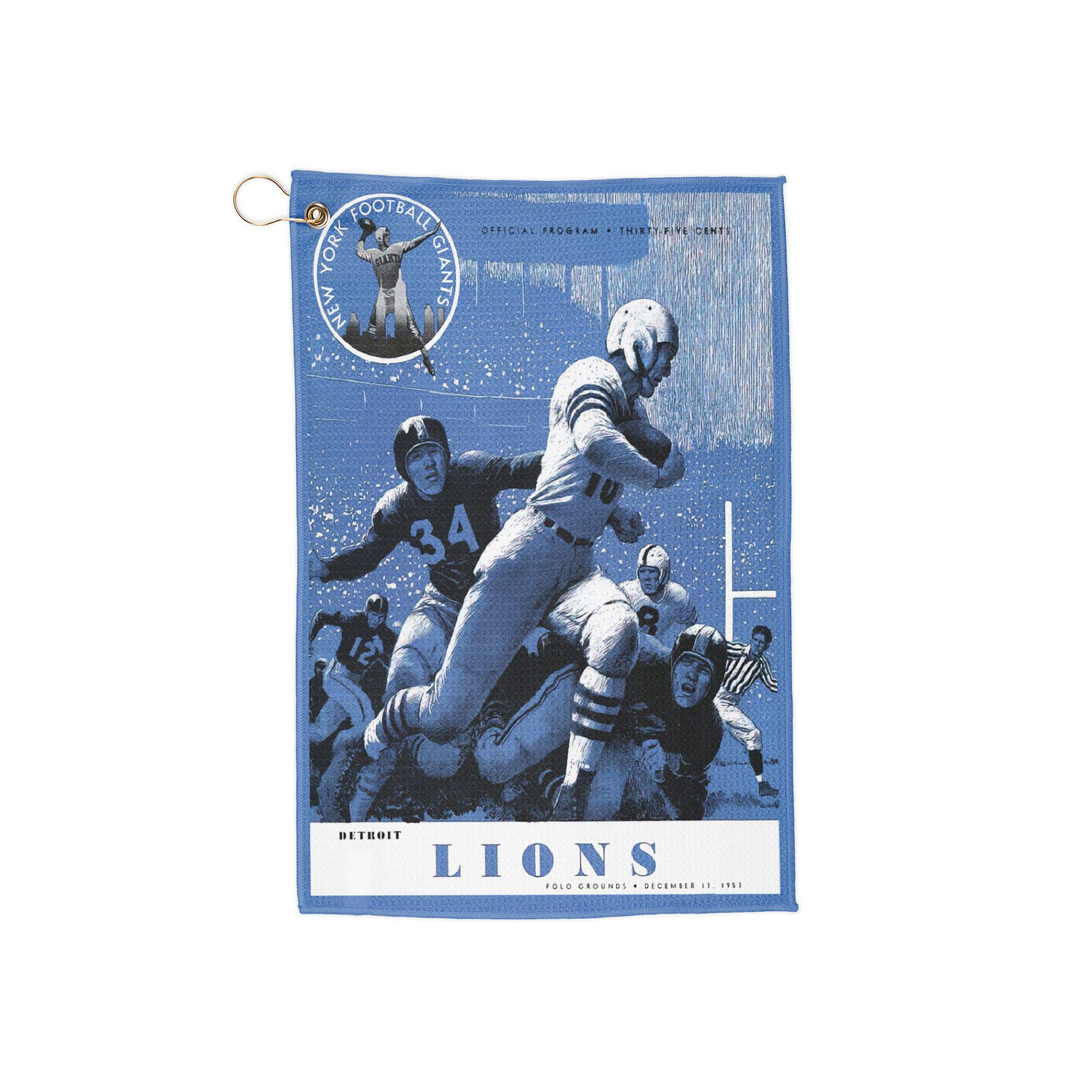 This Golf Towel features a vintage 1953 Football New York Giants-Detroit Lions design, perfect for sports enthusiasts looking to add a touch of nostalgia to their game. Made of a durable 80% polyester, 20% polyamide blend microfiber, this towel is ideal for absorbing liquid and can be used for traveling, camping, the gym, and more. With a convenient size of 16'' × 24'', it comes with a gold grommet and ring for easy hanging.