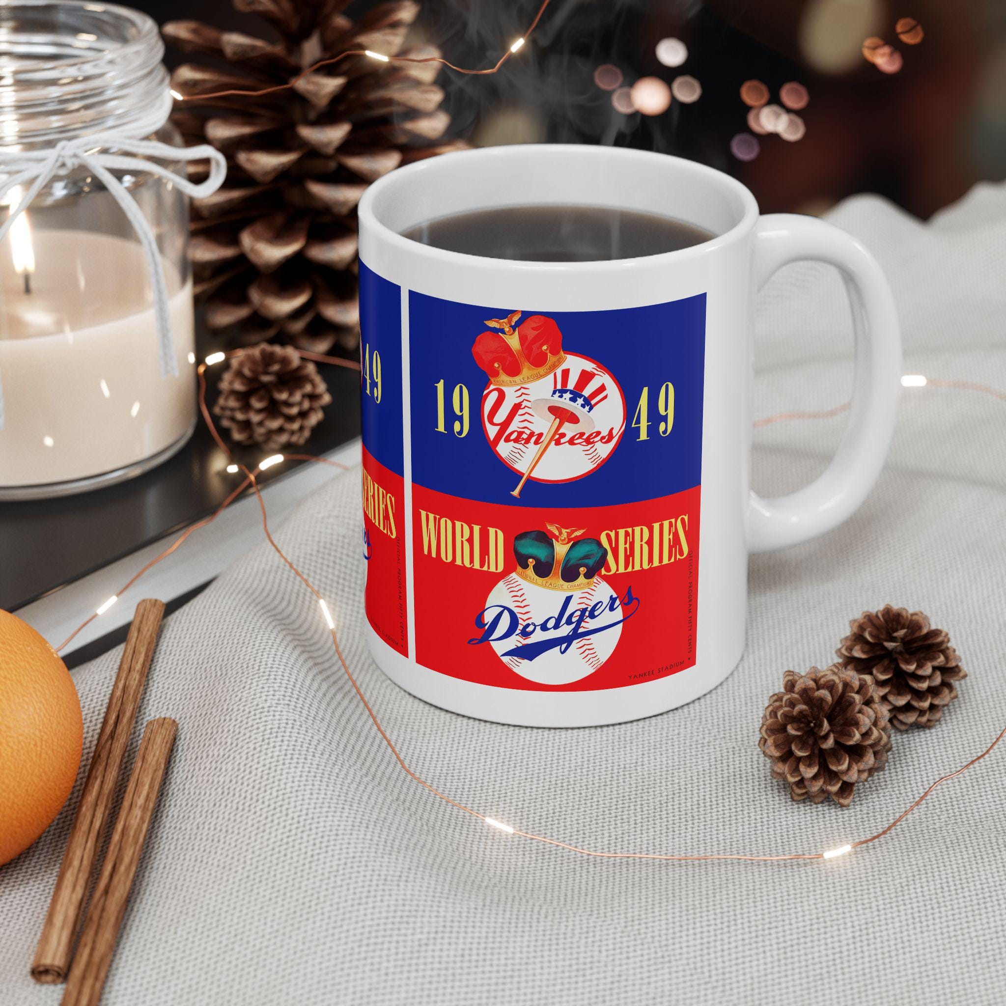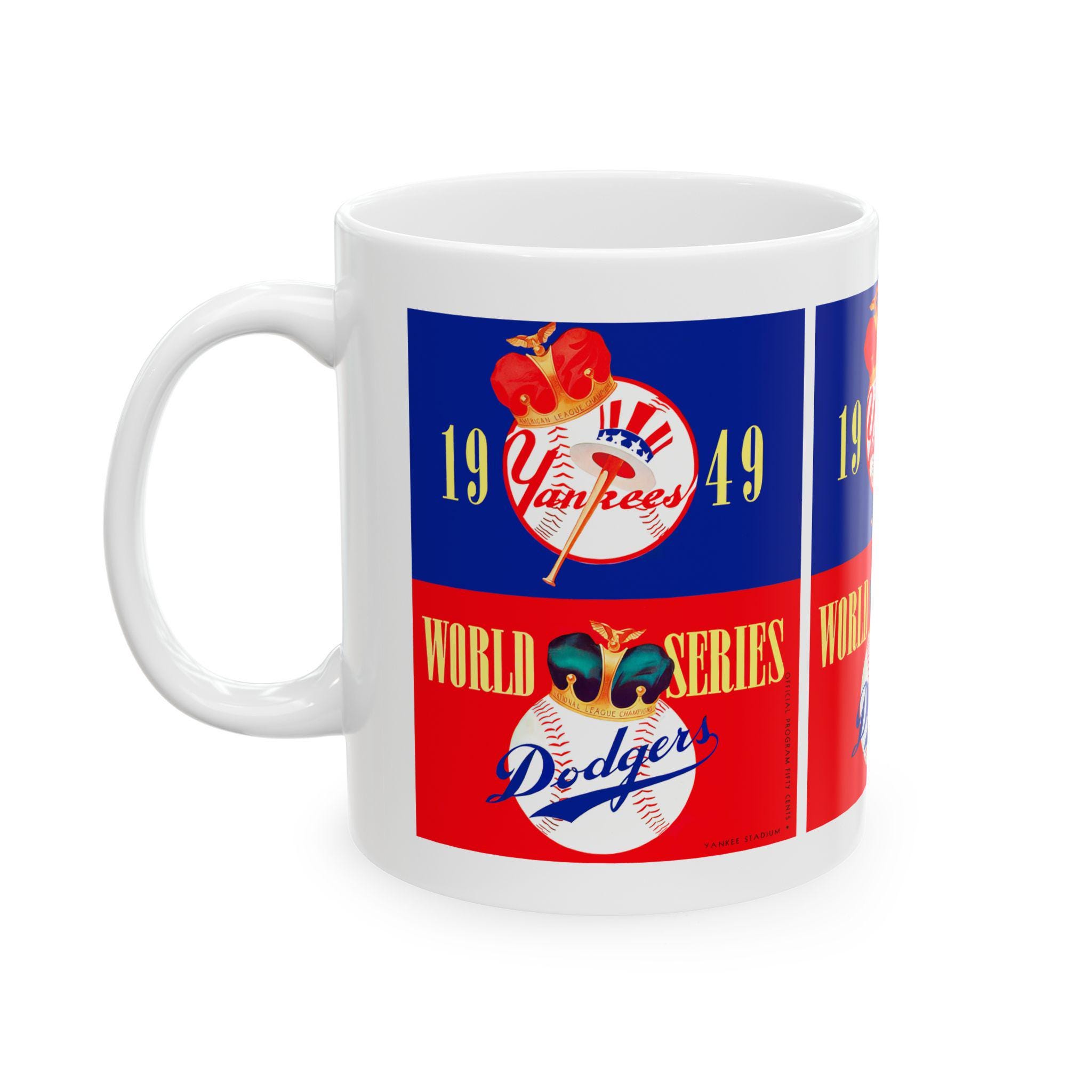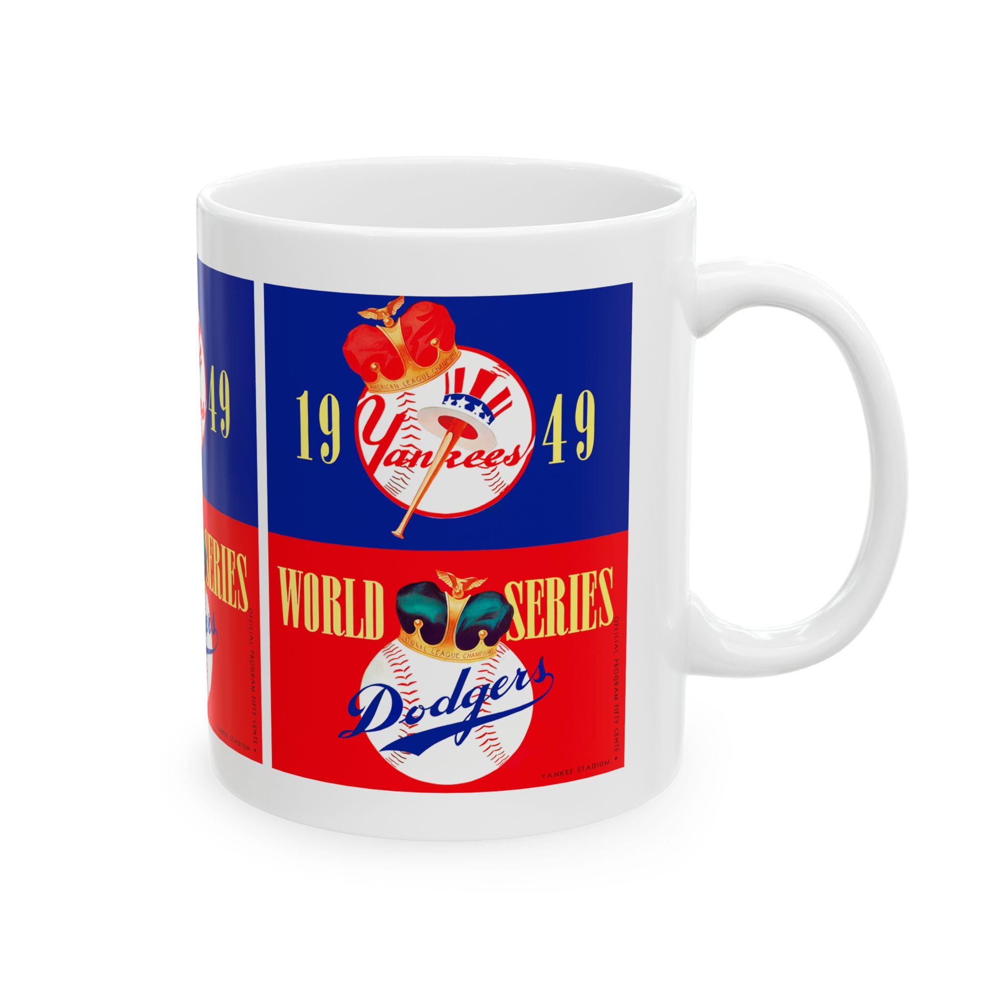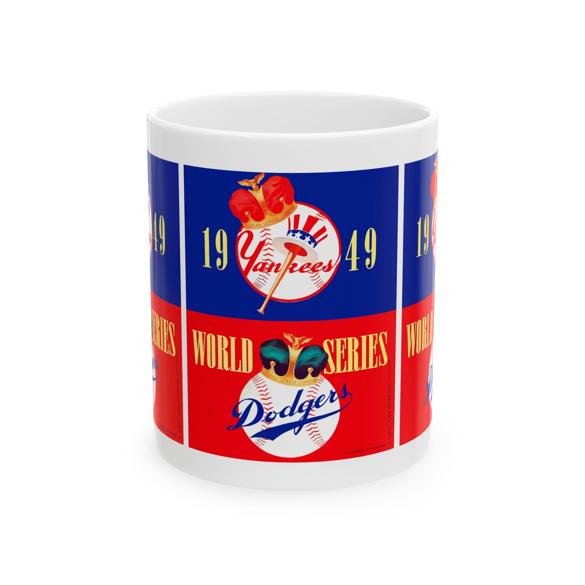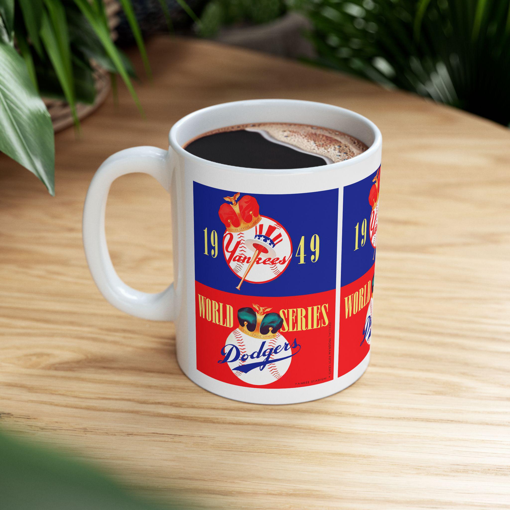 Carry a piece of baseball history into your morning routine. This glossy ceramic mug celebrates the 1949 World Series showdown between the Yankees and Dodgers—an era of leather gloves, radio play-by-plays, and stadium lights humming into the night. Wrap your hands around the C-handle and feel the weight of tradition as you sip coffee, tea, or hot cocoa while remembering cliffhanger innings and timeless rivalries. The bold, vibrant print pops against the durable white ceramic, making the design feel energetic and alive—like the crack of a bat or the crowd’s roar. Use it for quiet pre-game rituals, slow weekend mornings, or to add vintage charm to a sports-themed kitchen. It fits naturally on a collector’s shelf or beside a well-worn scorebook, bringing that nostalgic ballpark atmosphere right to your table.