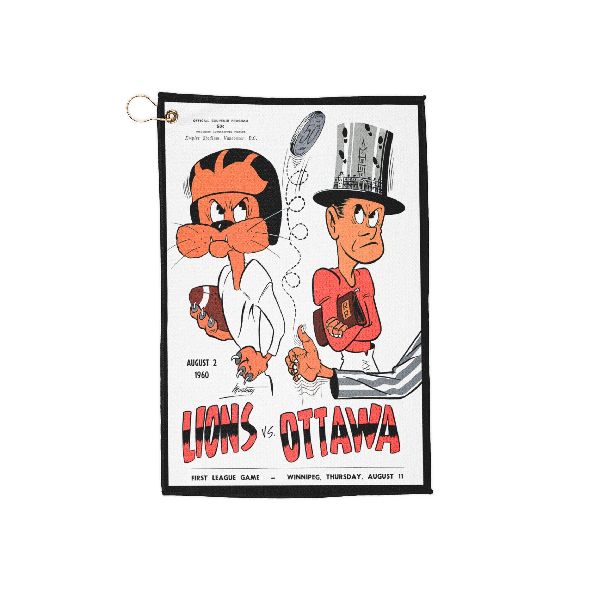 This microfiber towel features a vintage design from a 1960 Football game between Ottawa Rough Riders and BC Lions. Perfect for sports enthusiasts and football fans, it provides a nostalgic and historic vibe. Ideal for traveling, camping, gym workouts, and beach days. A great gift for sports fans and collectors. Relevant for sports events, Father's Day, and birthdays.