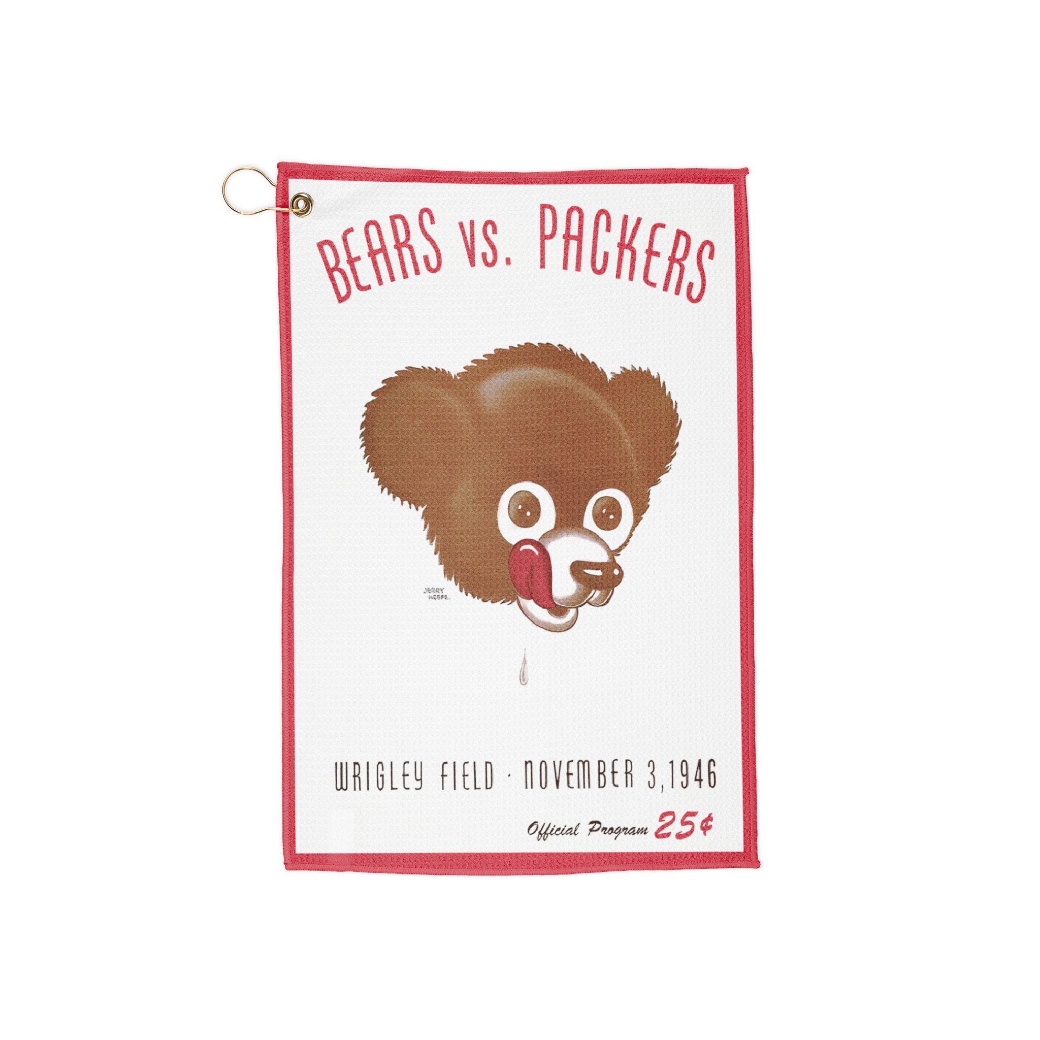 Vintage sports-themed golf towels featuring a 1946 Football Bears-Packers design. These versatile towels are perfect for golfers who love retro sports memorabilia. Ideal for gifting to sports enthusiasts during football season or birthdays.