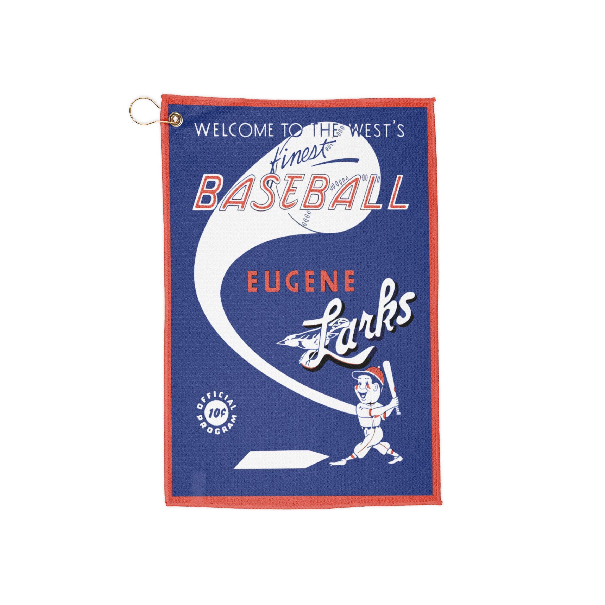 This vintage-inspired golf towel brings a slice of 1950s baseball nostalgia to the green. Printed with the “1950 Baseball Eugene Larks” motif, it feels like a sun-faded pennant draped over a bag — familiar, worn-in, and quietly proud. Lightweight and highly absorbent, it slips through a golf bag pocket or clips to a cart with its gold grommet and ring. Use it after a long walk between holes, to wipe clubs with steady, reliable performance, or tuck it into a travel kit for weekend rounds and road trips. The single-sided print keeps the design crisp while the microfiber weave dries surfaces and hands fast, making it an easy companion for players who like gear with character and a story.