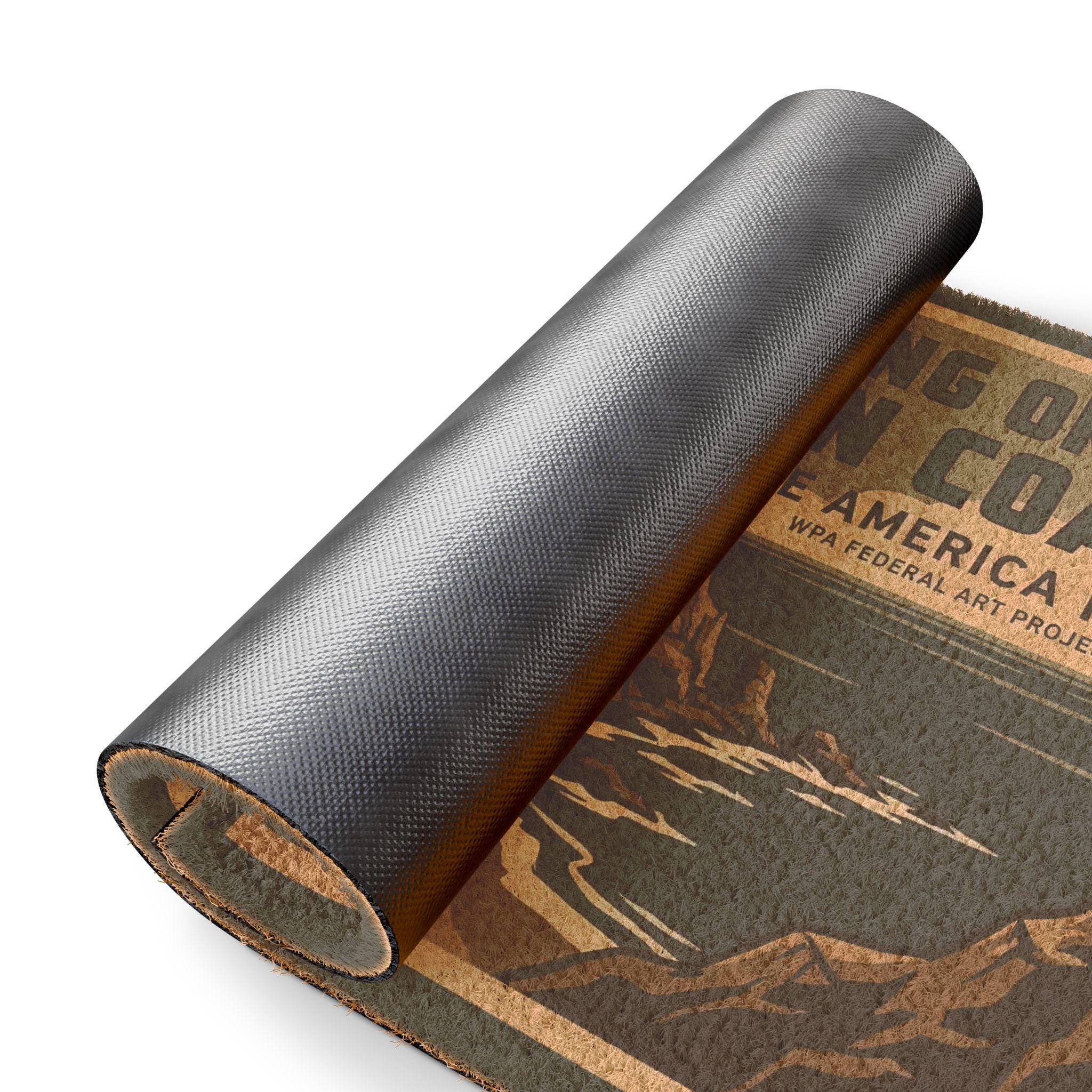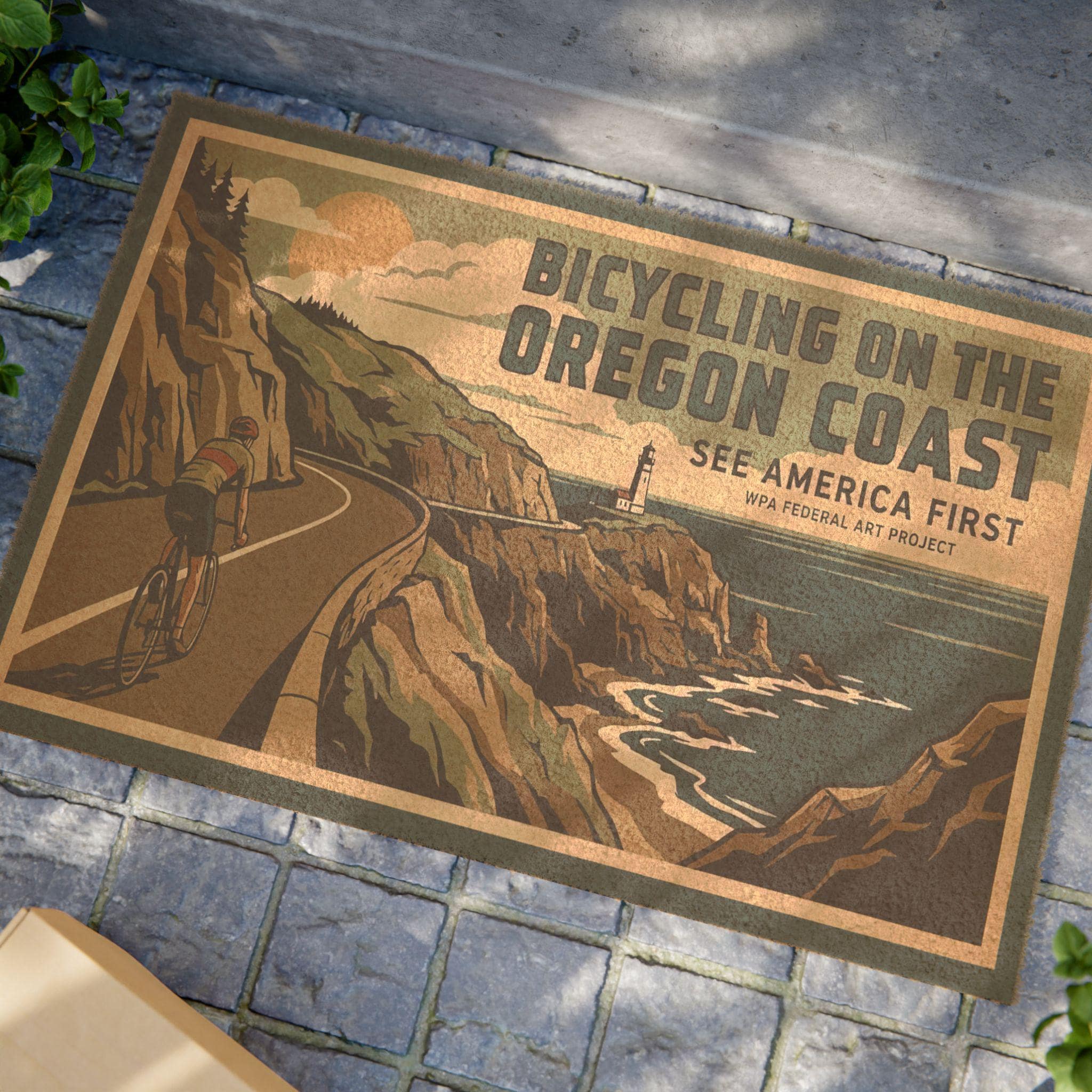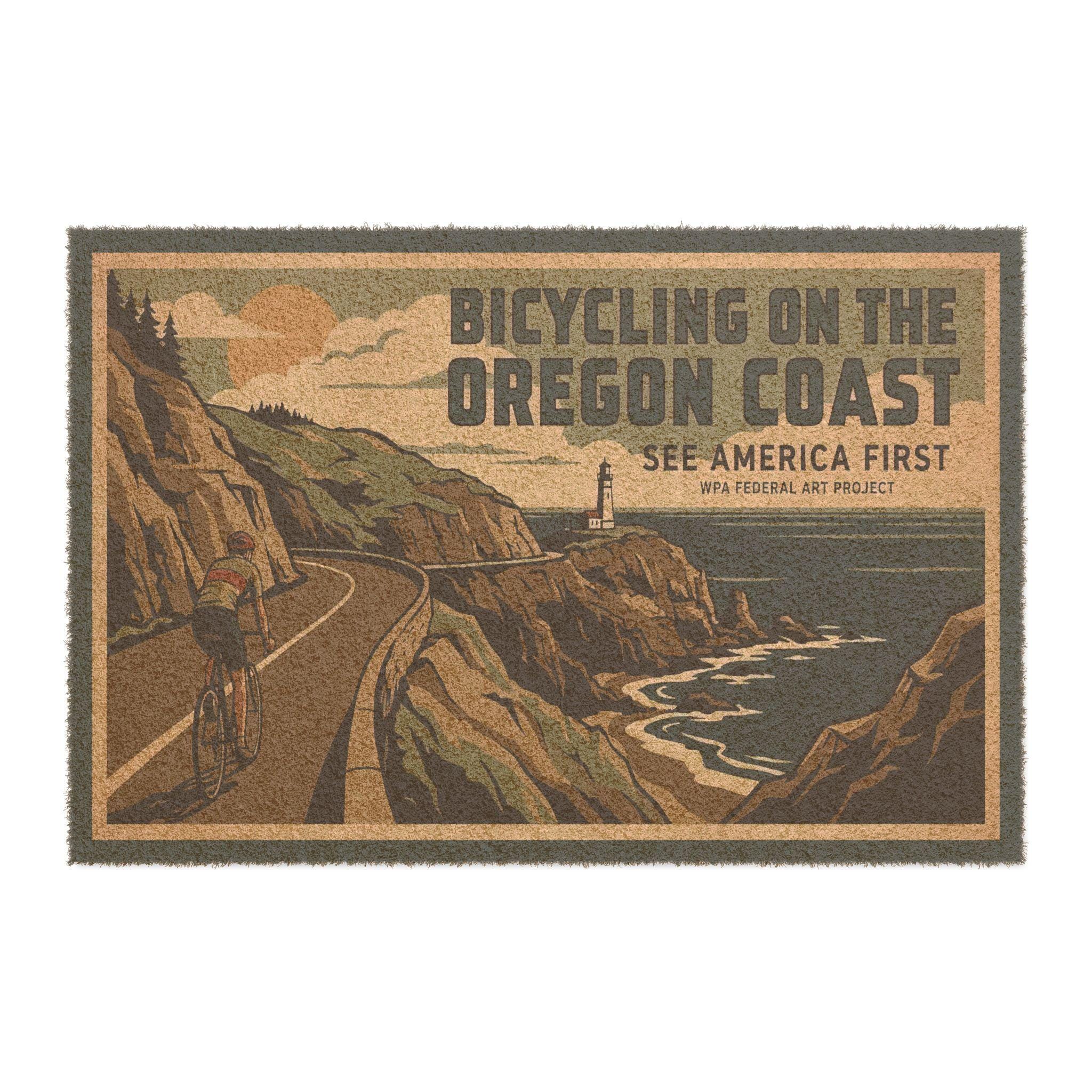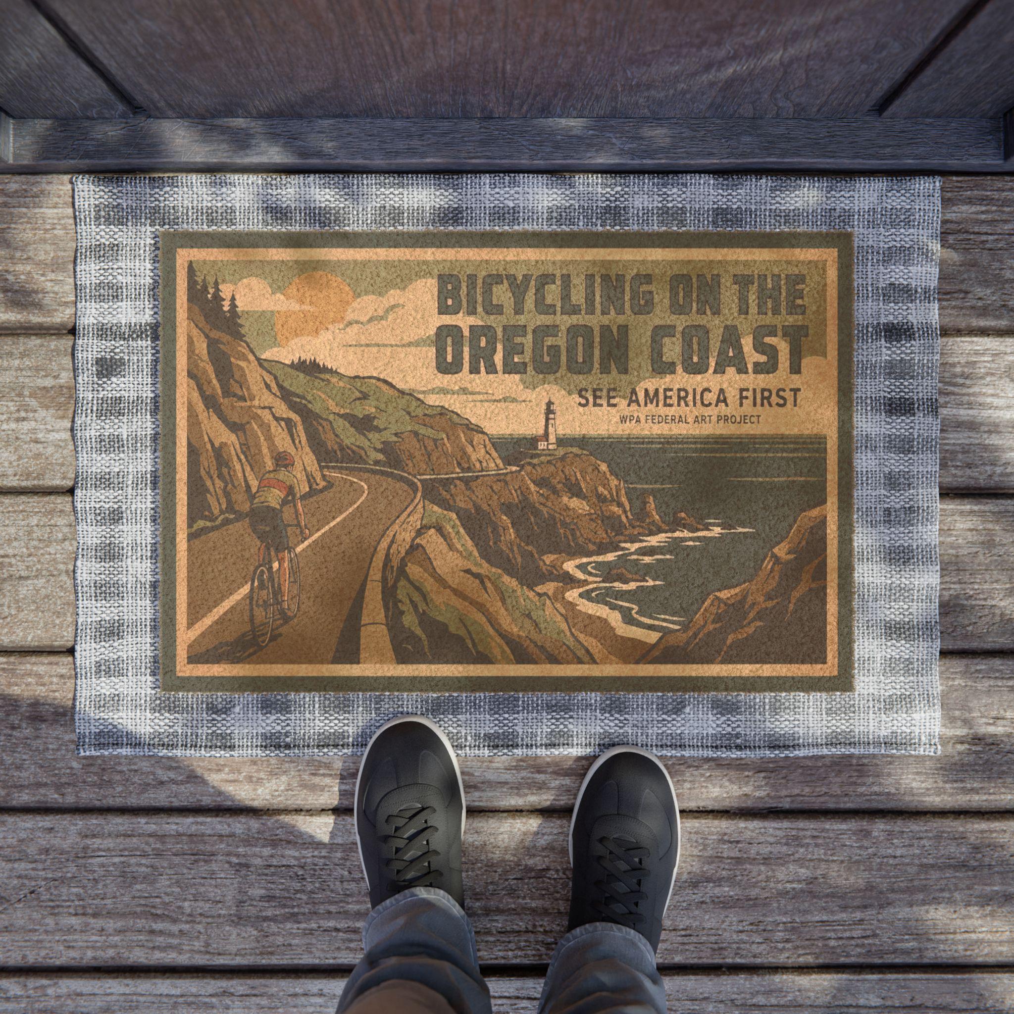 Salt spray on your face. Wind in your spokes. This doormat brings a WPA-inspired bicycling scene from the Oregon Coast right to your doorstep. Hand-tufted coir captures the rough texture of beach paths, while bold, vintage-style graphics nod to classic travel posters. It settles under boots and wet tires, catching sand and grit with a weather-ready presence that feels like a welcome to anyone who lives for coastal rides and open roads. Leave sandy shoes and salty laughter here before stepping into a warm kitchen or cozy mudroom after a long day on the route.