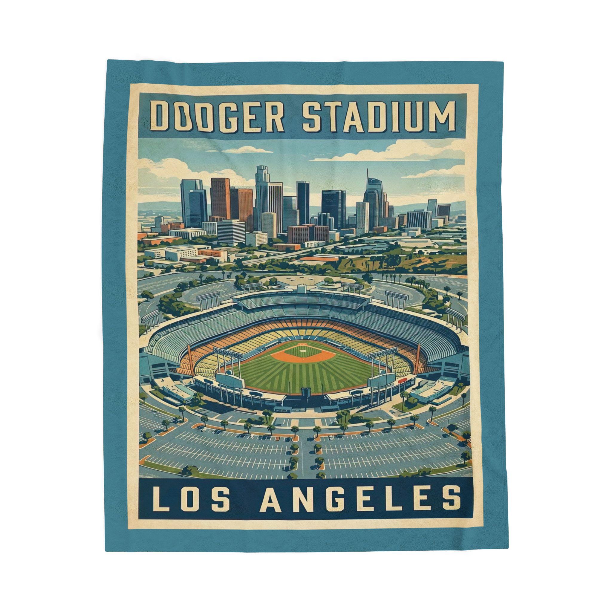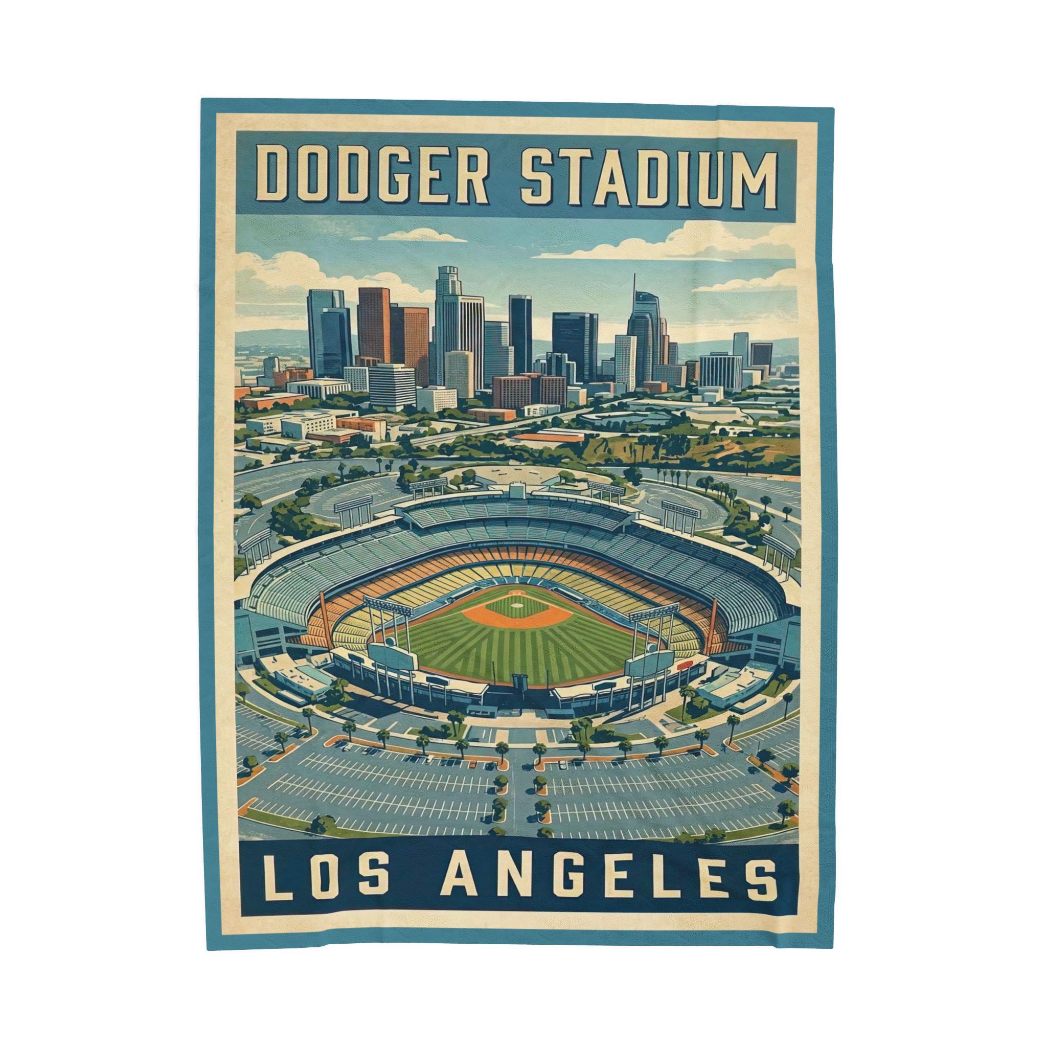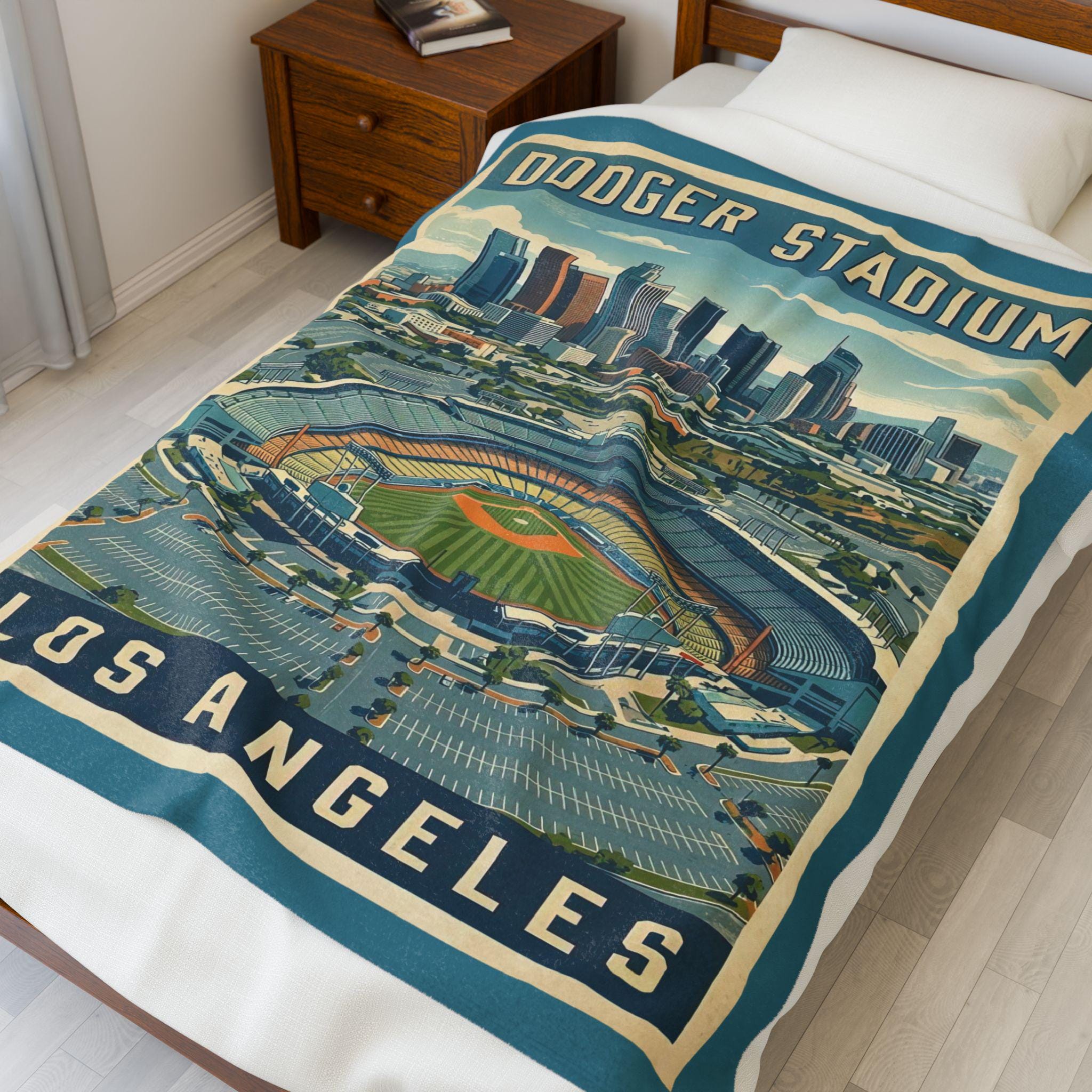 Spread across laps and couches, this velveteen plush blanket carries the bold, streamlined energy of WPA-era sports posters and the familiar silhouette of Dodger Stadium. The artful, vintage-inspired graphic reads like a city anthem—clean lines, strong shapes, and a color pop that feels like arriving at the stadium under an evening sky. It wraps around quiet game nights, post-work commutes to the park, and living-room rituals where baseball talk threads through chatter and coffee. The soft, slightly heavy fabric soothes shoulders while the vivid one-sided print keeps the image sharp—like a keepsake banner you actually use. For adult fans who collect city lore and sports graphics, this blanket is a tactile way to hold a small piece of Los Angeles vernacular close during fall nights, opening weekend, or slow Sunday afternoons.