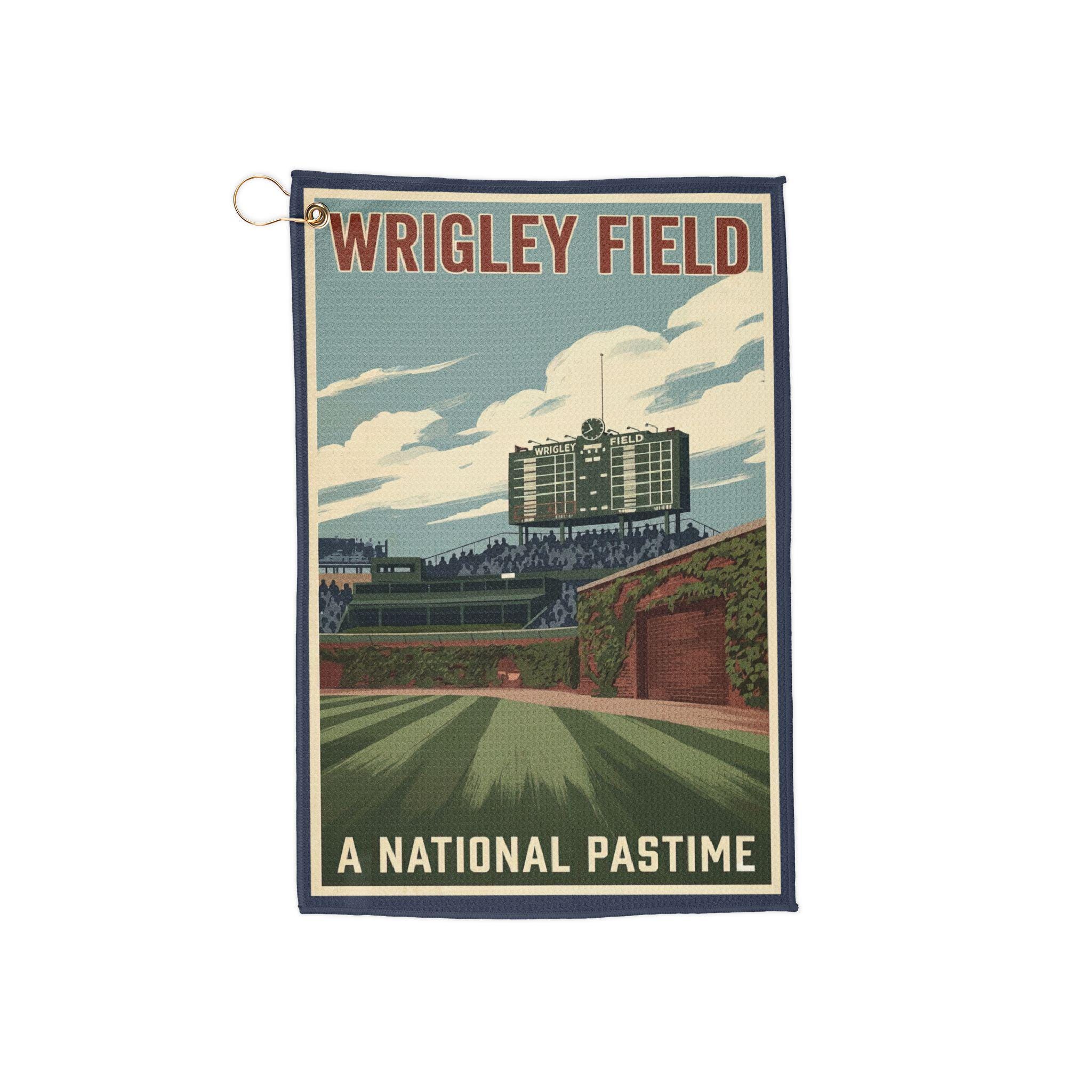 Bring the energy of the ballpark to your bag. This lightweight golf towel shows a WPA-style baseball field view of Chicago — wide green fairways, crisp baselines, and that retro stadium framing that feels like a late-afternoon game. It’s made from a soft, quick-drying microfiber that wipes clubs and hands clean without scratching. The brass-colored grommet and ring hang securely from your cart or bag, ready between shots or after a shower. Use it at the range, on the course, or to carry a piece of Chicago’s field-day charm wherever you go.