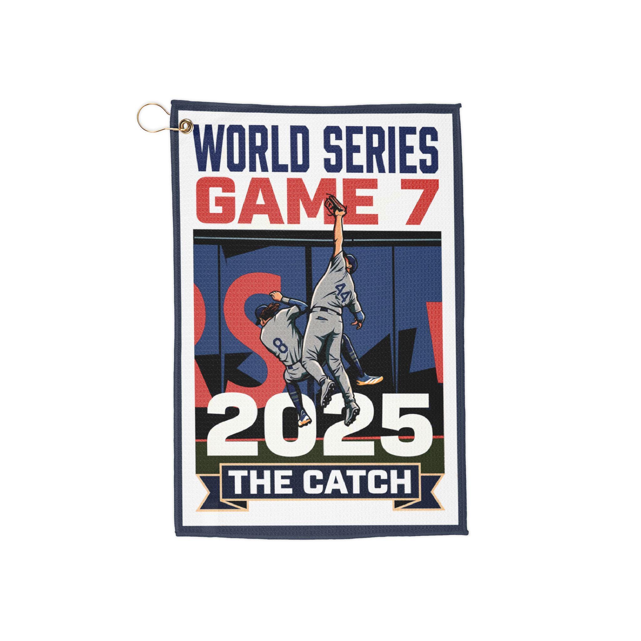 Feel the crack of the bat and the roar of the crowd every time you reach for this golf towel. Inspired by Game 7 of the 2025 Baseball World Series and ‘The Catch,’ it carries the tension and triumph of that moment into a compact, rugged towel you’ll bring to the range, course, or clubhouse. Soft, quick to dry, and detailed with a gold grommet and ring, it hangs from your bag like a badge of honor. Whether you’re wiping sweat between strokes or keeping grips dry, this towel keeps the game close and the memory alive.