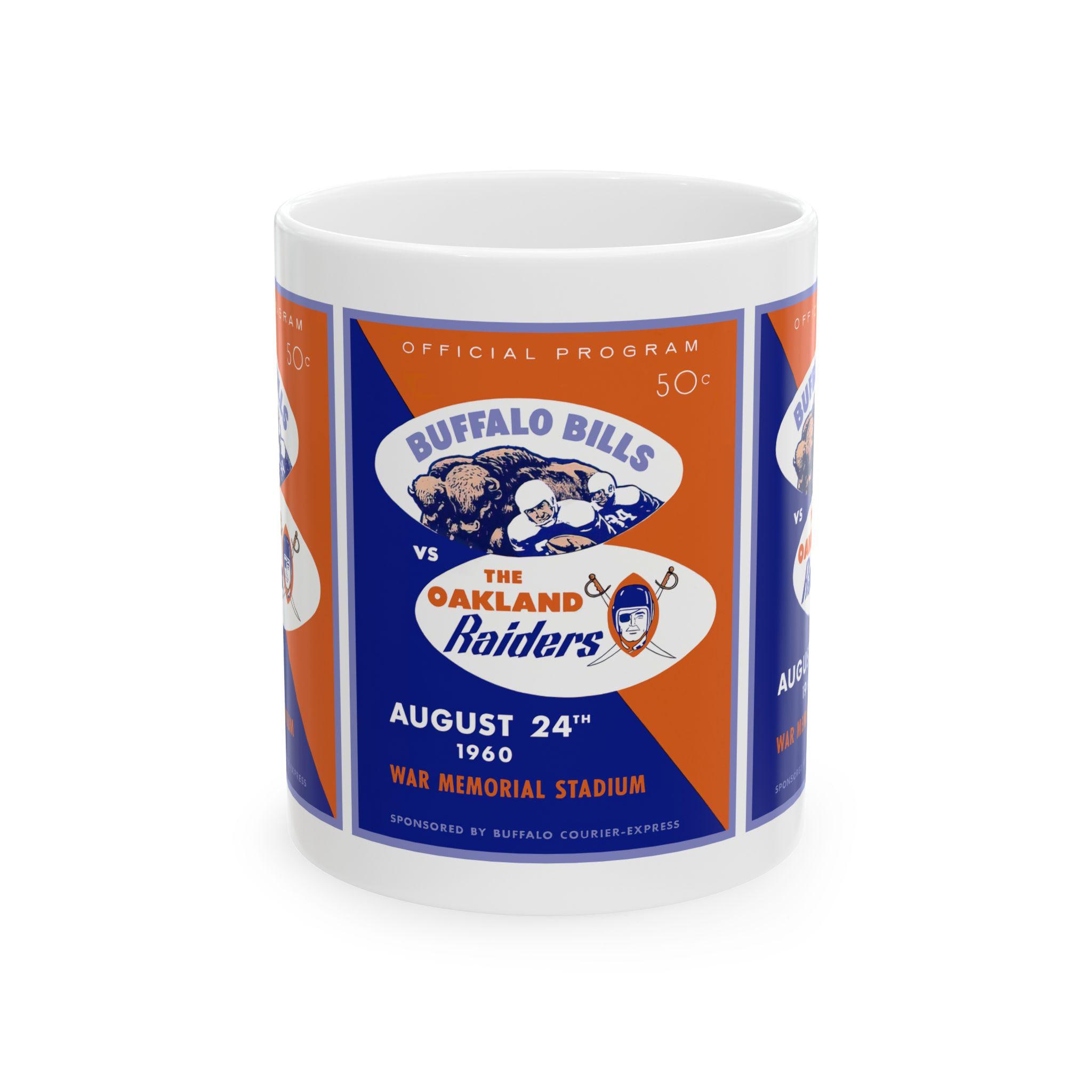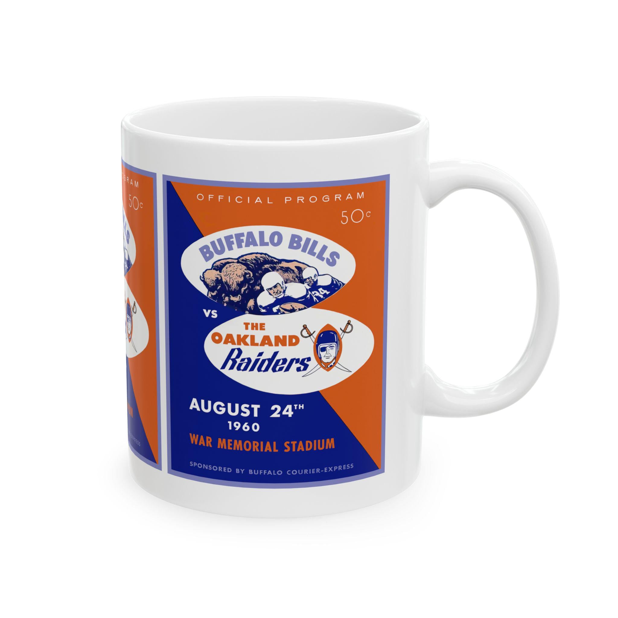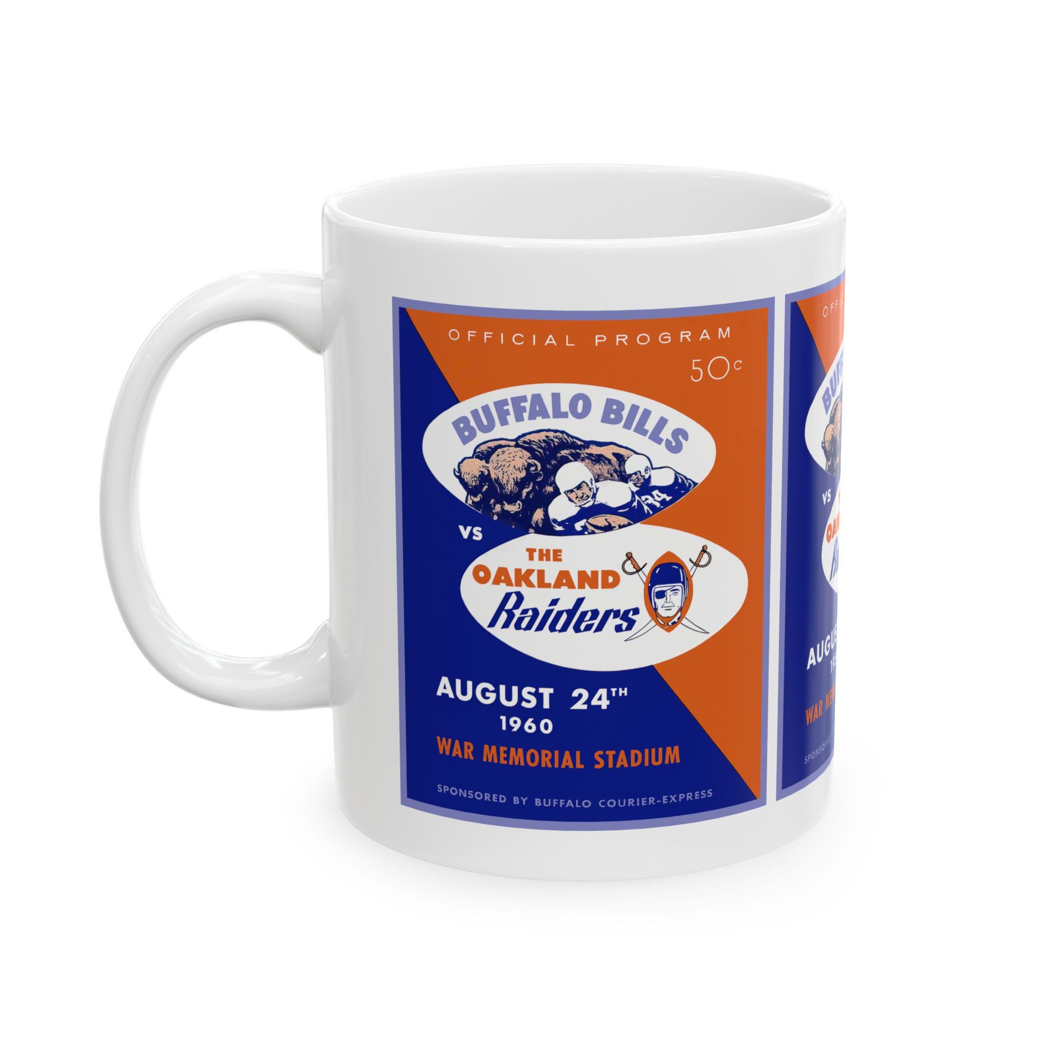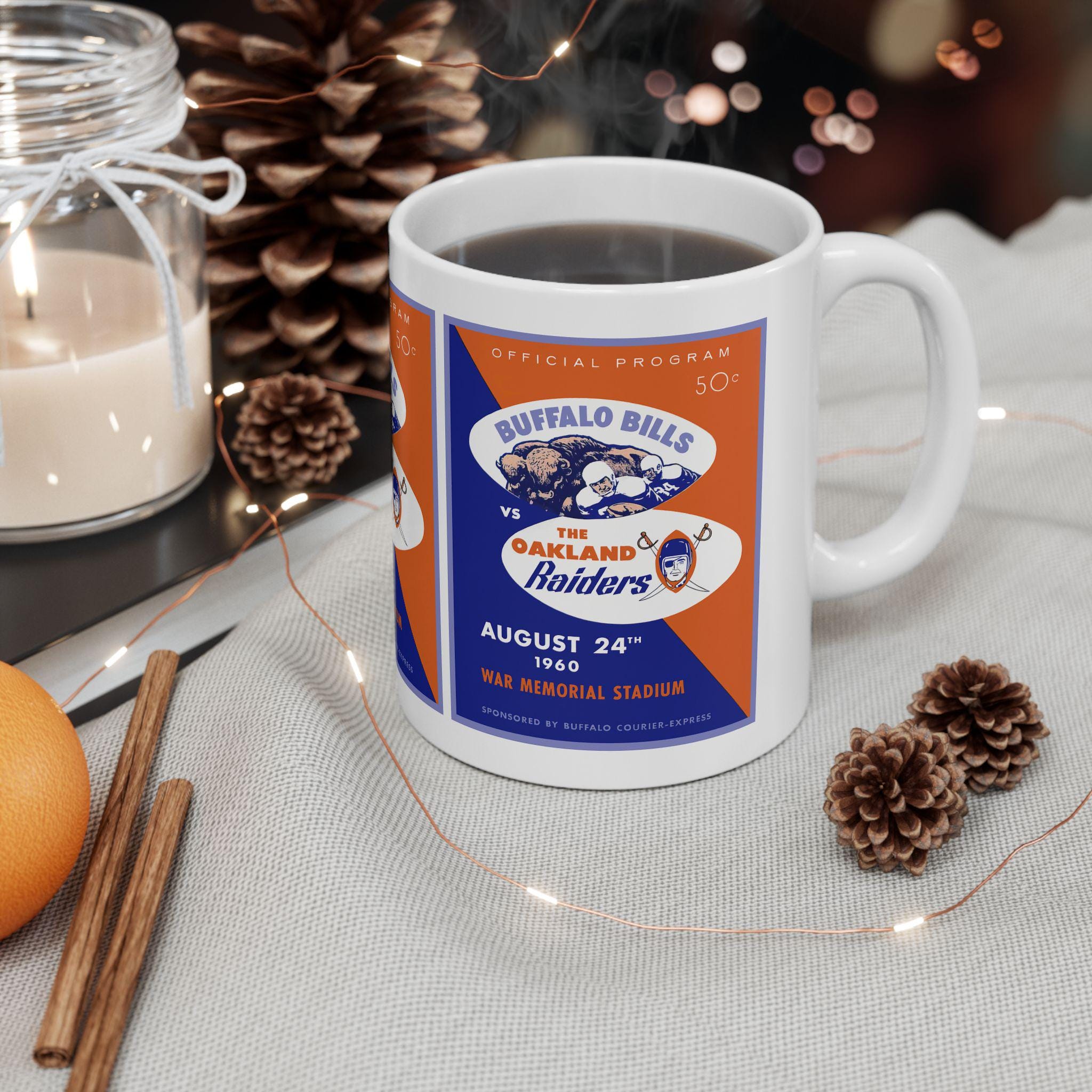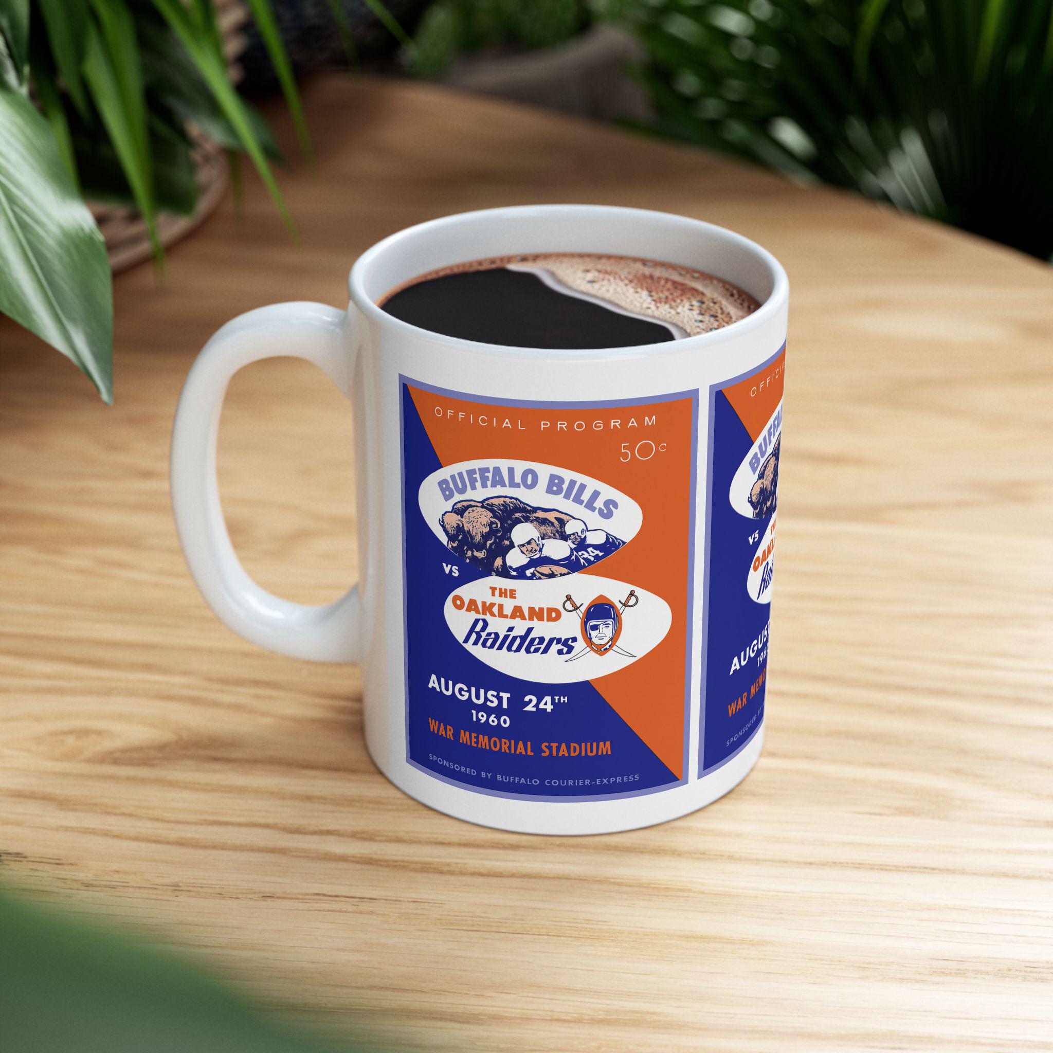 This ceramic mug brings a sliver of 1960s football nostalgia to your morning routine. The Buffalo-Oakland design feels like a stadium snapshot — sun-bleached jerseys, tight spirals on the turf, and the crack of the kickoff echoing in the stands. Hold it in your hands and remember Sundays spent leaning over the radio or crowded at a diner booth with friends dissecting every play. It fits into the life of dedicated fans who savor history as much as a good hot brew: tailgate conversations, game-day prep, or quiet weekday rituals when you want a small, tactile reminder of rivalry and grit. The glossy white ceramic makes the retro colors pop, so the mug reads like a little collectible on your shelf between trophies and ticket stubs. Whether you bring it to a viewing party or sip from it while charting fantasy lineups, this mug carries the weathered charm of that era without the fuss.