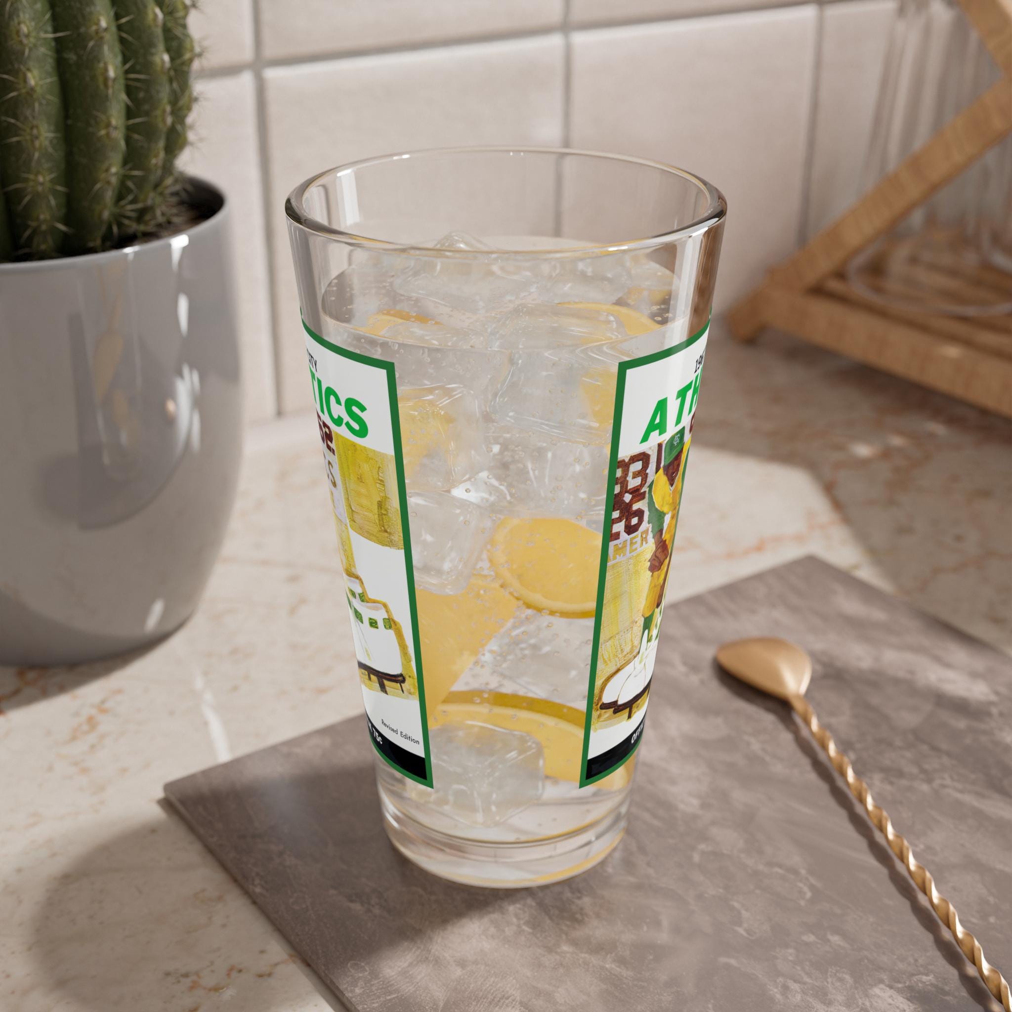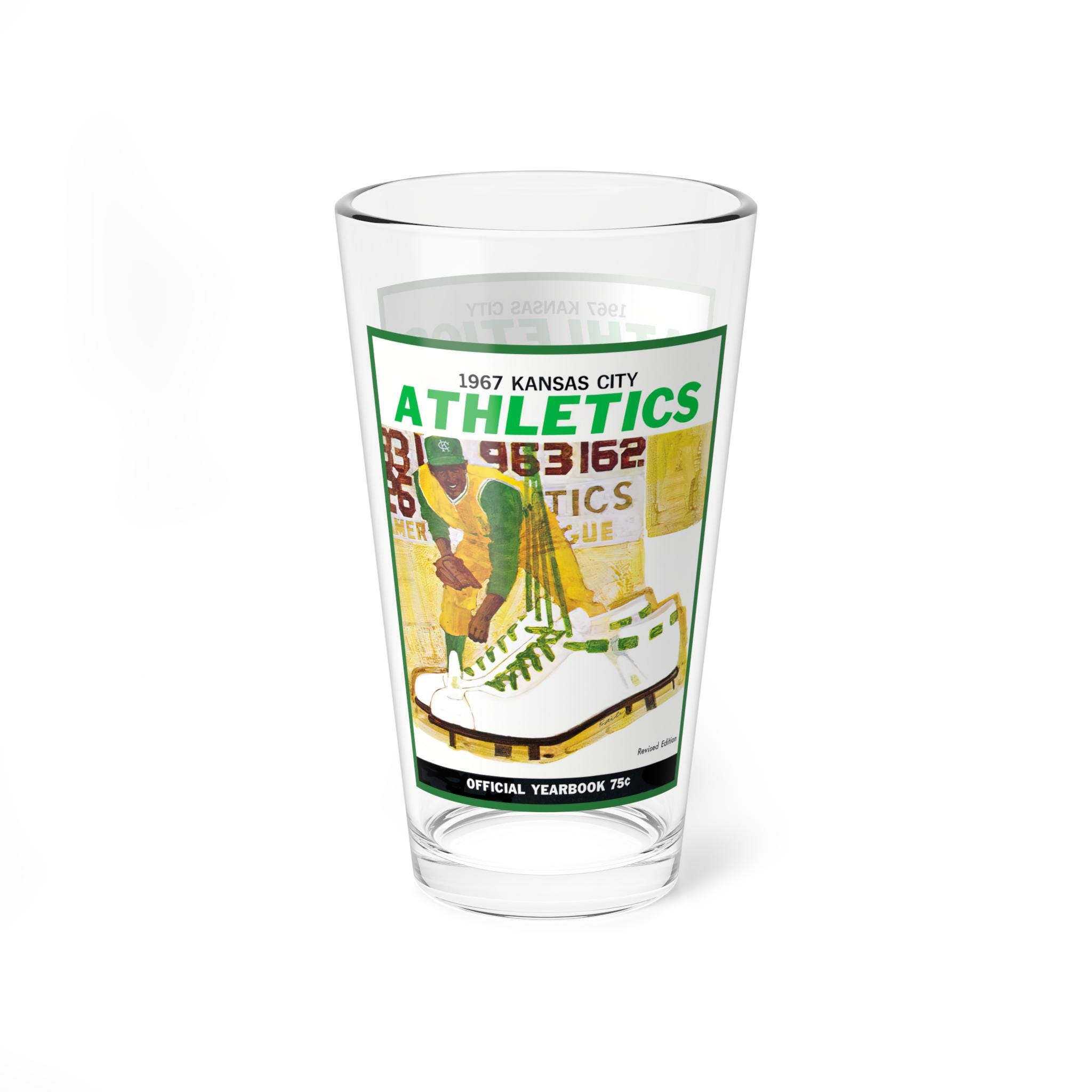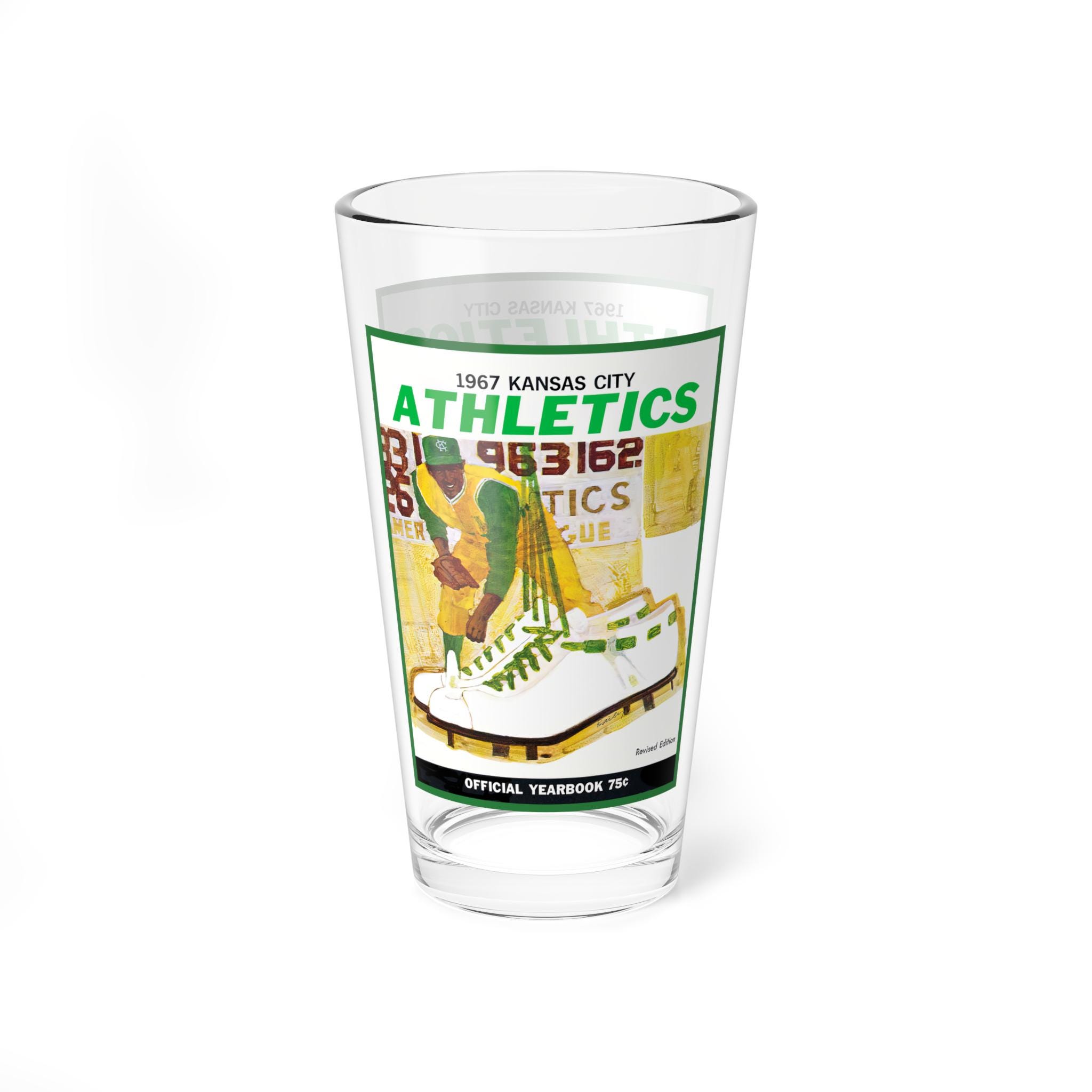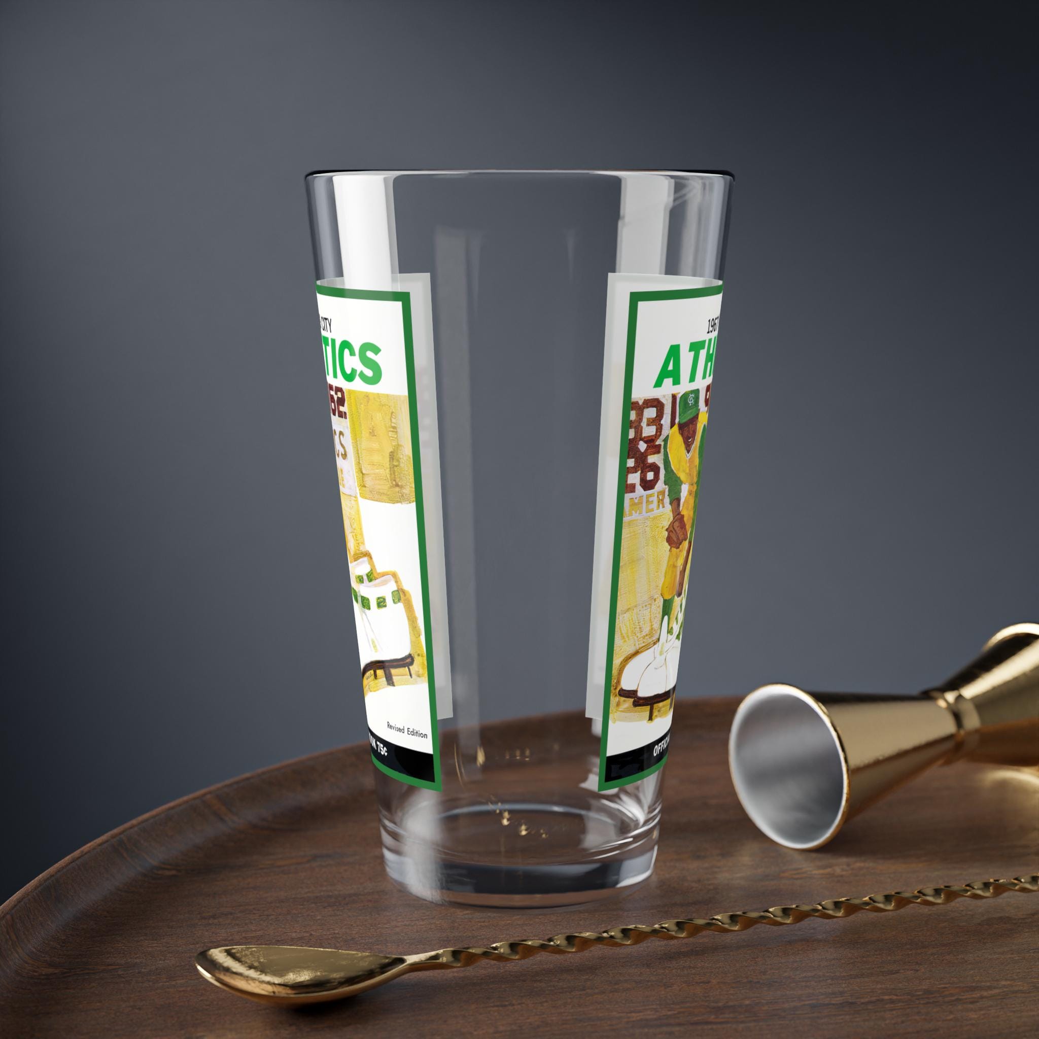 Hold a slice of 1967 Kansas City baseball history in your hand. This 16oz mixing glass bears a vintage-style Kansas City Athletics motif—faded charm, bold team lettering, and a hint of mid-century grit. It sits heavy and steady on the bar or countertop, catching light through clear glass as the graphics pop with game-day nostalgia. Use it at quiet Sunday afternoons replaying old box scores, backstage at a backyard cookout with friends who know the roster, or during a cozy watch party where every pitch brings a memory. The weighty base keeps it grounded while you stir, muddle, or simply sip. It’s for fans who collect stories as much as memorabilia—who appreciate an authentic piece that feels lived-in and ready for the next inning.