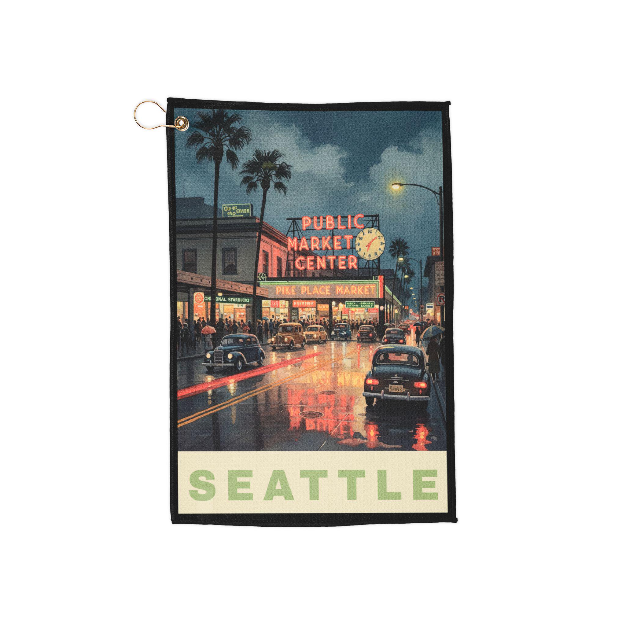 A compact, artful golf towel that carries a slice of Seattle with every swing. The vintage street-view print evokes foggy mornings along Pike Place and the steady hum of city life, grounding your game in a place that feels familiar and slightly nostalgic. Lightweight and highly absorbent, it rides clipped to your bag with a gold grommet and ring, ready to wipe clubs, hands, or scorecards between holes. The one-sided print gives a subtle nod to city charm without overpowering your gear. For players who appreciate place-based details and practical performance, this towel blends everyday utility with a quiet, storied style.