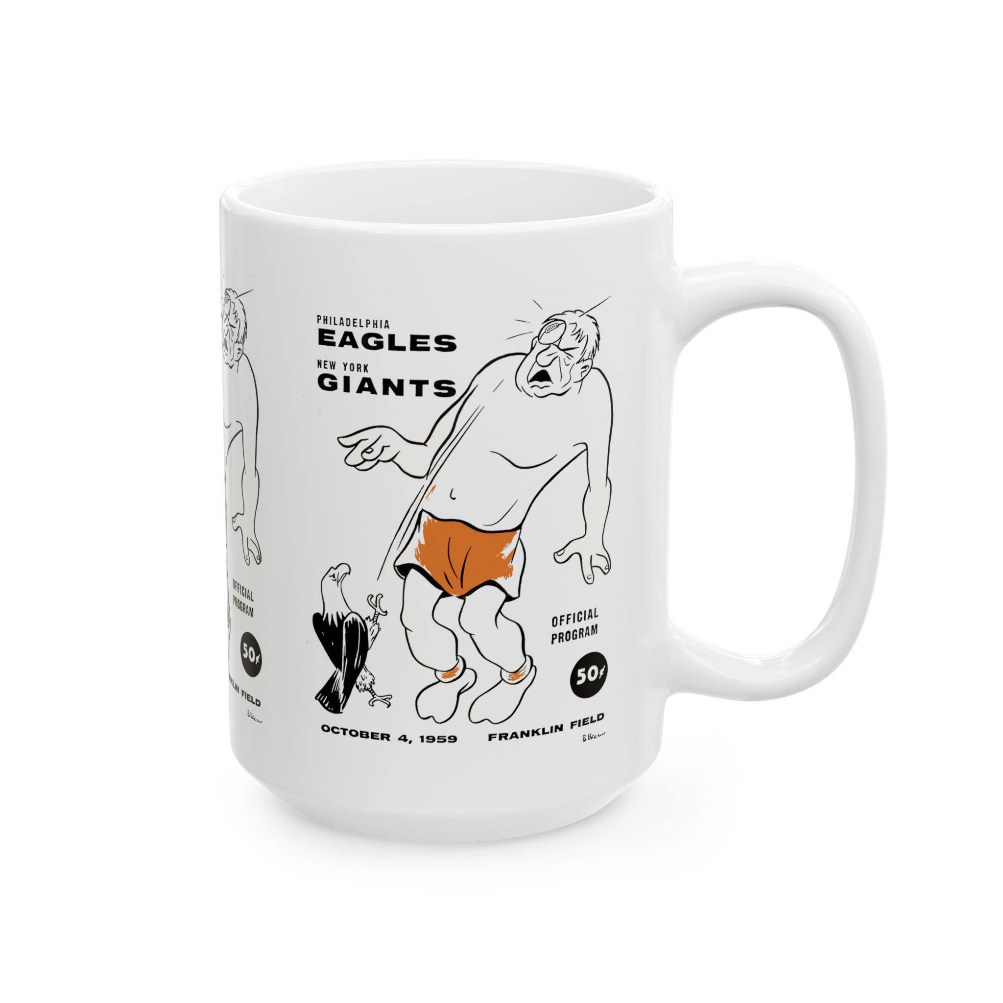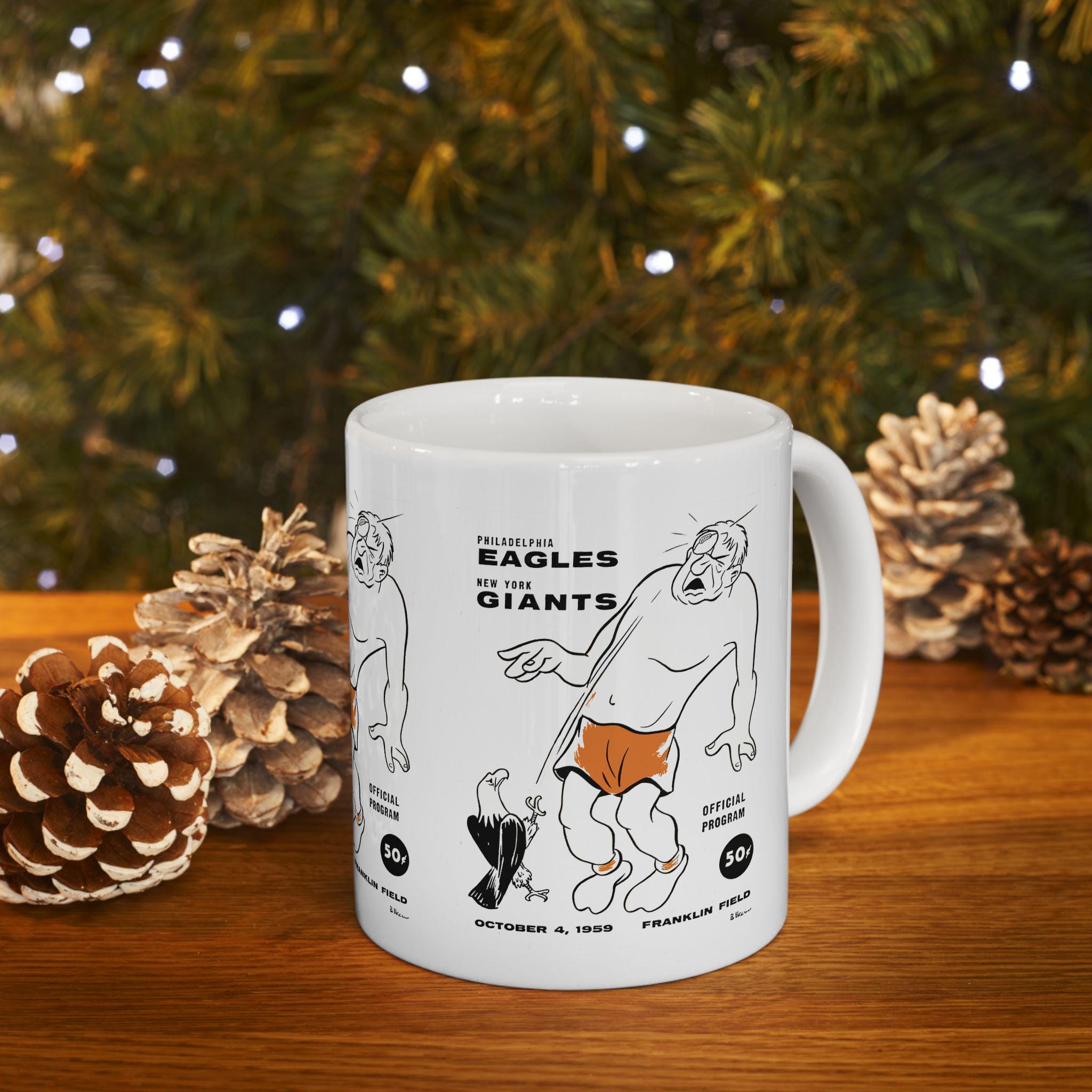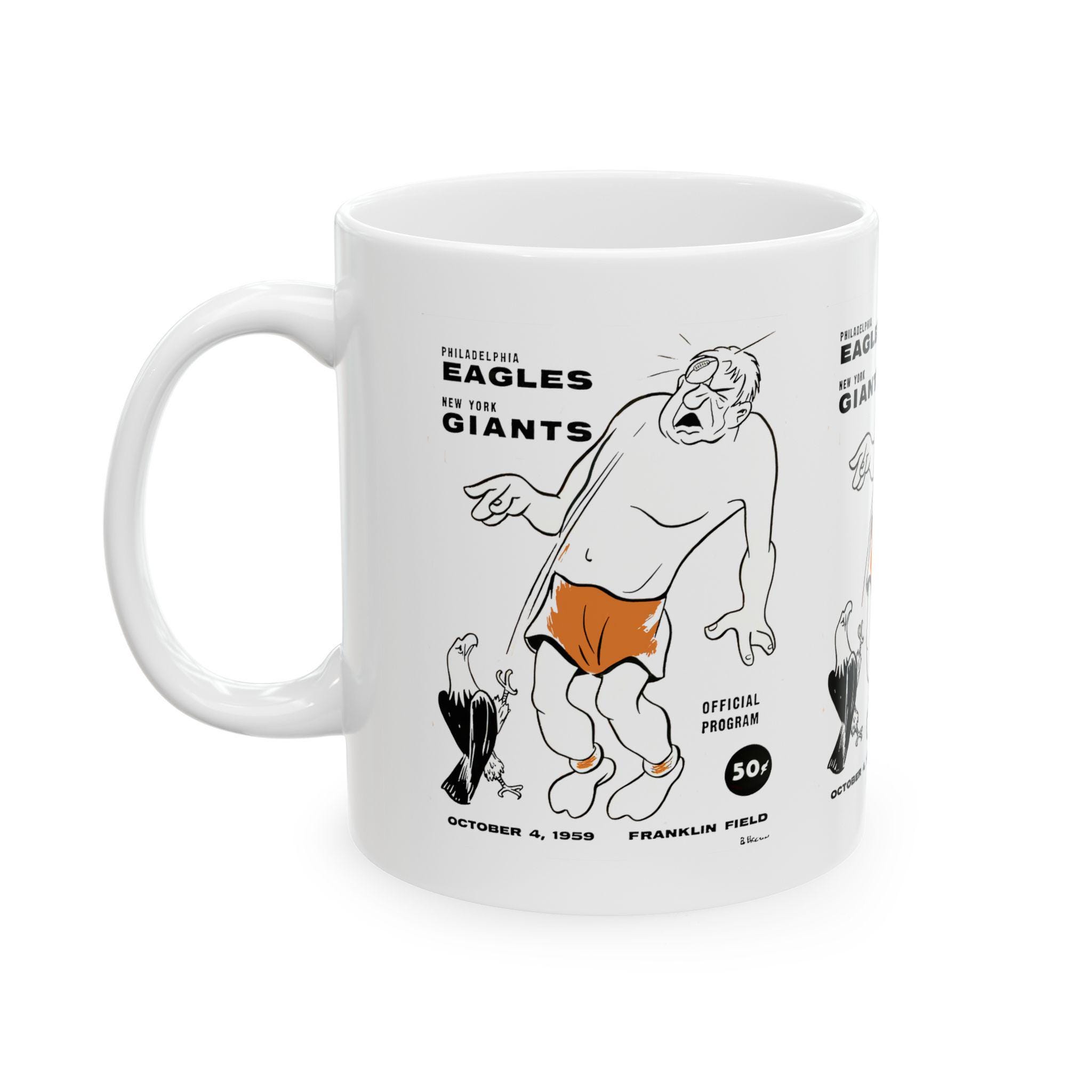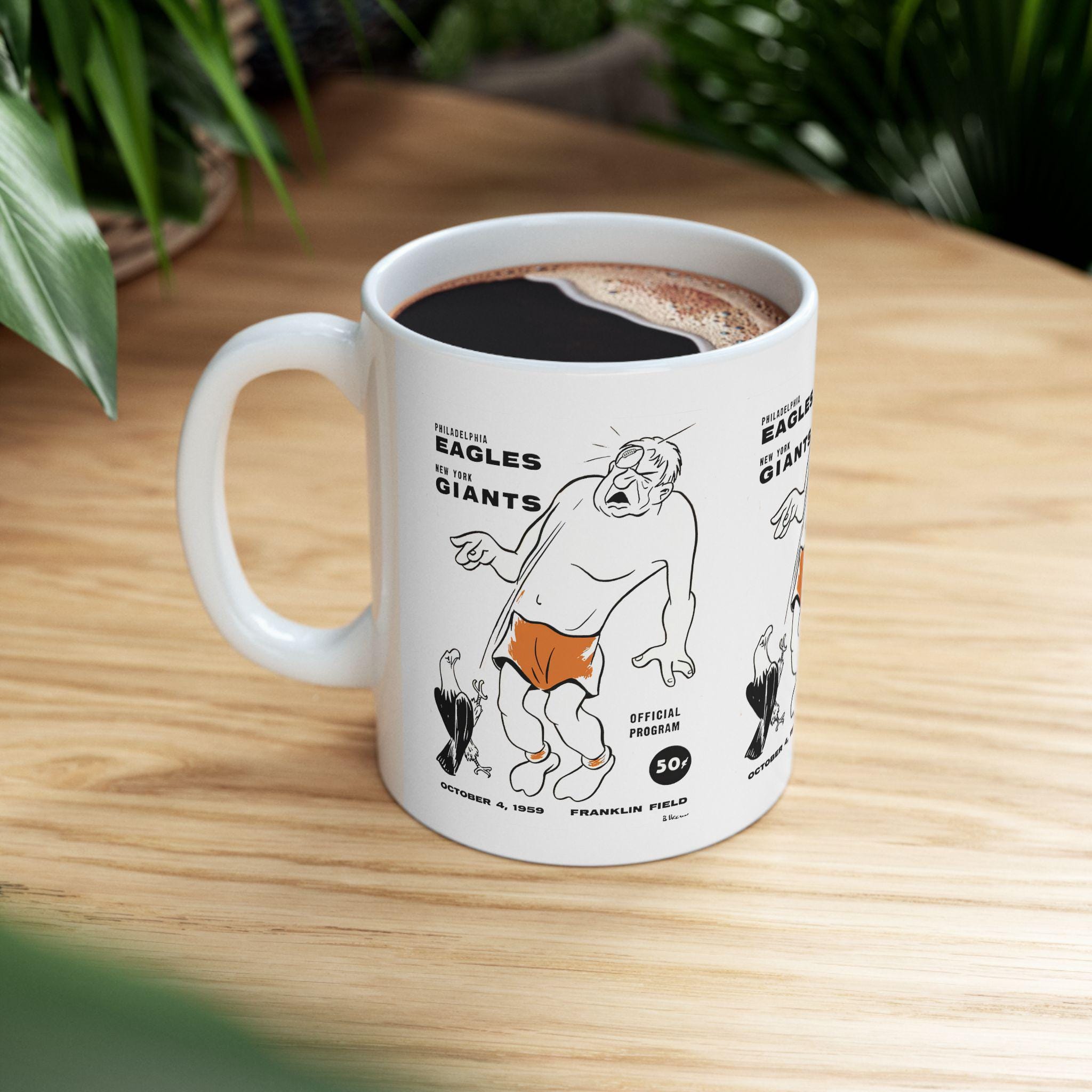 Carry a slice of 1959 game-day grit into your morning routine with this glossy ceramic mug. The bold Giants vs. Eagles motif feels like a postcard from the stadium: worn leather, stadium lights, and the hush before kickoff. It sits steady with a comfortable C-handle and bright, crisp printing that keeps the vintage energy alive through every sip. Whether you're replaying old rivalries or starting a slow Saturday with coffee and old game footage, this mug adds a tactile connection to those football moments.