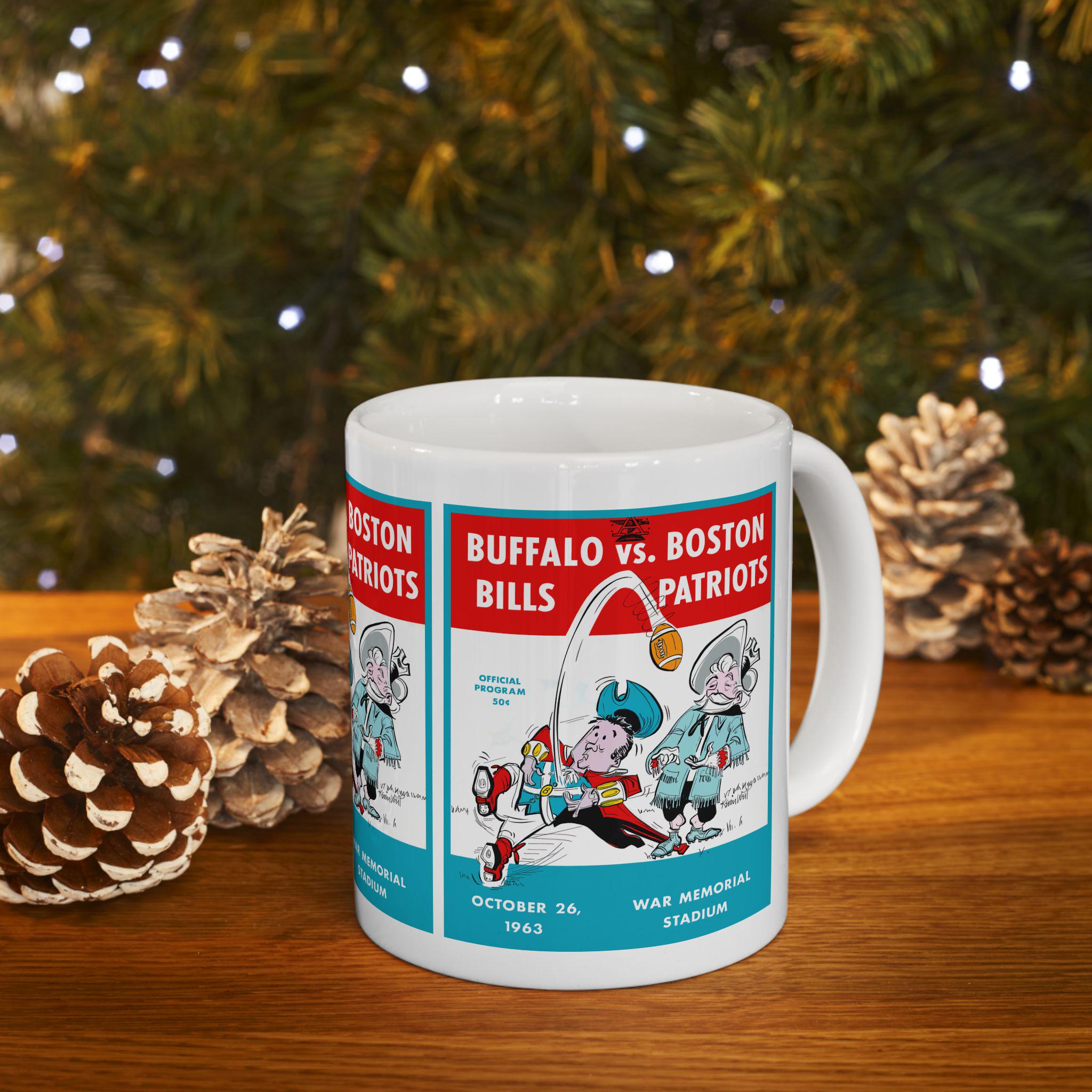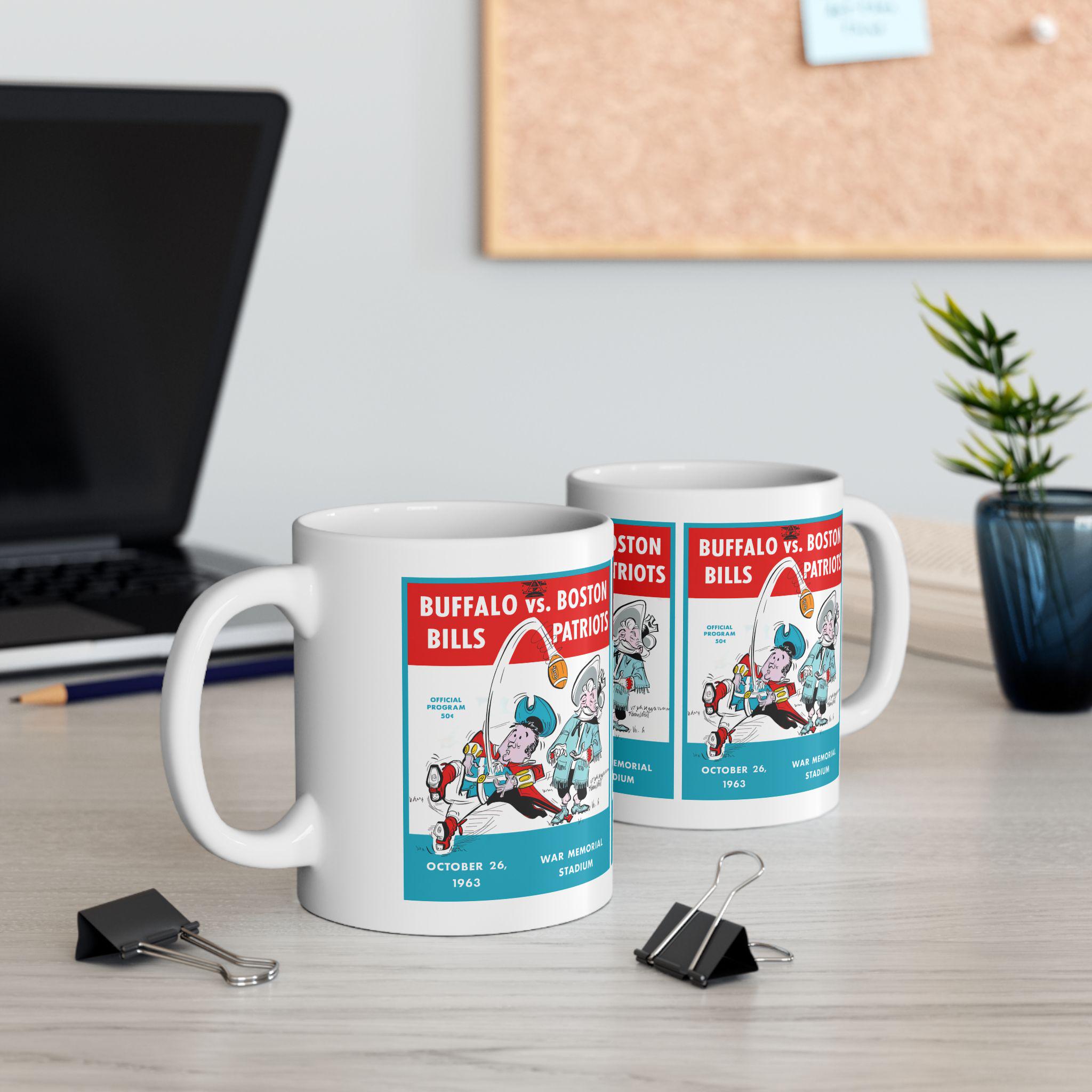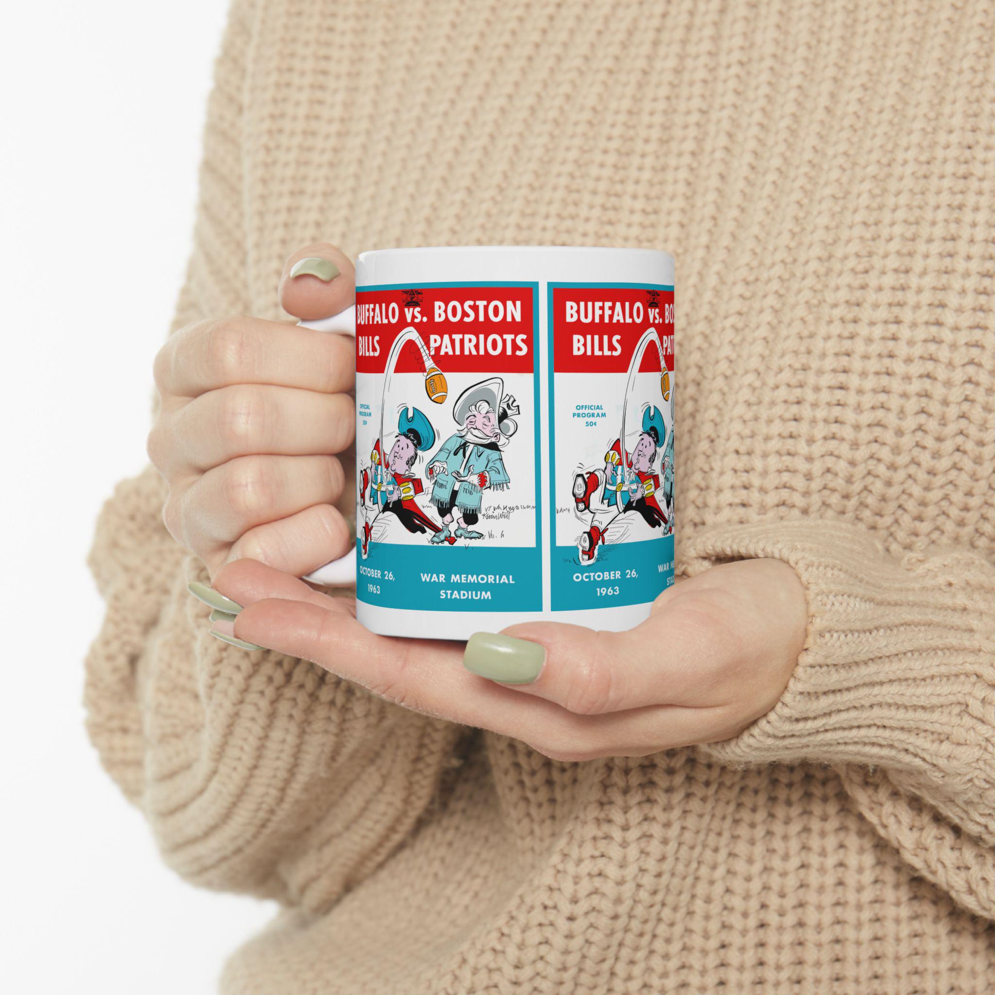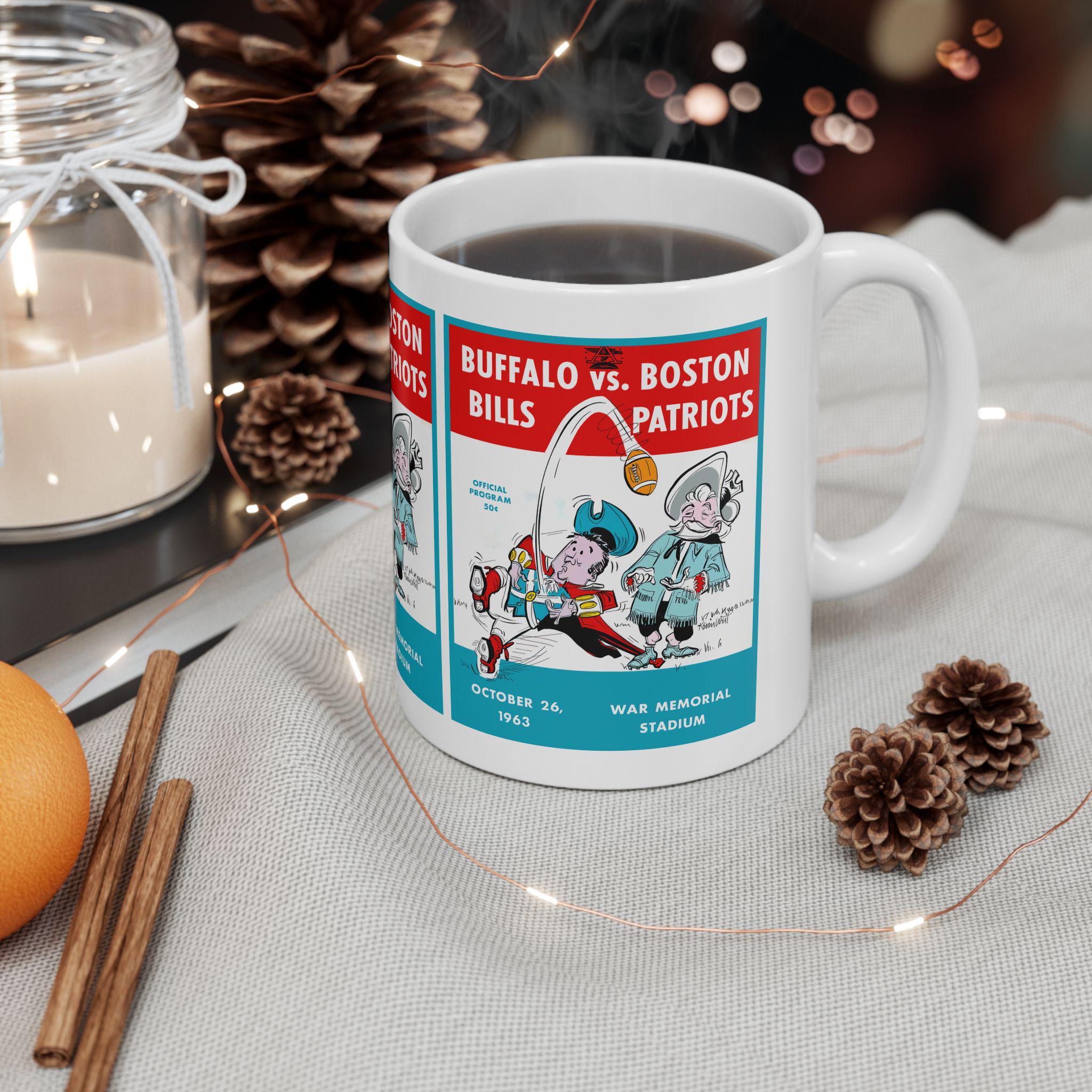 This glossy ceramic mug carries a bold, nostalgic design that nods to classic 1963 football rivalry between Buffalo and Boston. Each sip becomes a small trip back to crisp autumn afternoons and the roar of the stands — the colors pop with rich contrast and the vintage-inspired typography sits proudly against a bright white background. It's built to be part of everyday routines: sturdy, easy to grip, and resilient enough to go from morning coffee to late-night game recaps. For collectors, sports fans, or anyone who treasures regional football history, this mug brings a tangible piece of that story to the kitchen table or office desk.