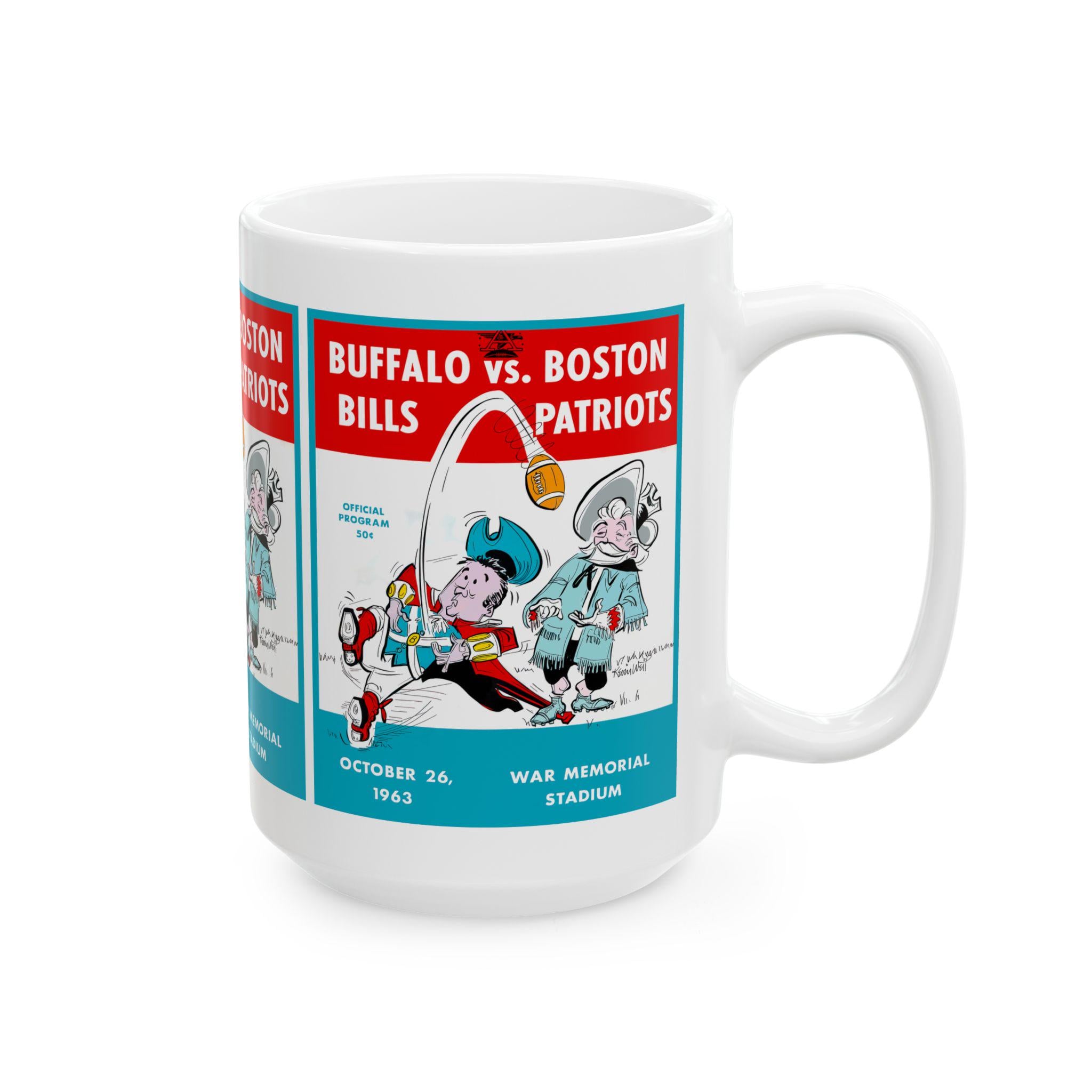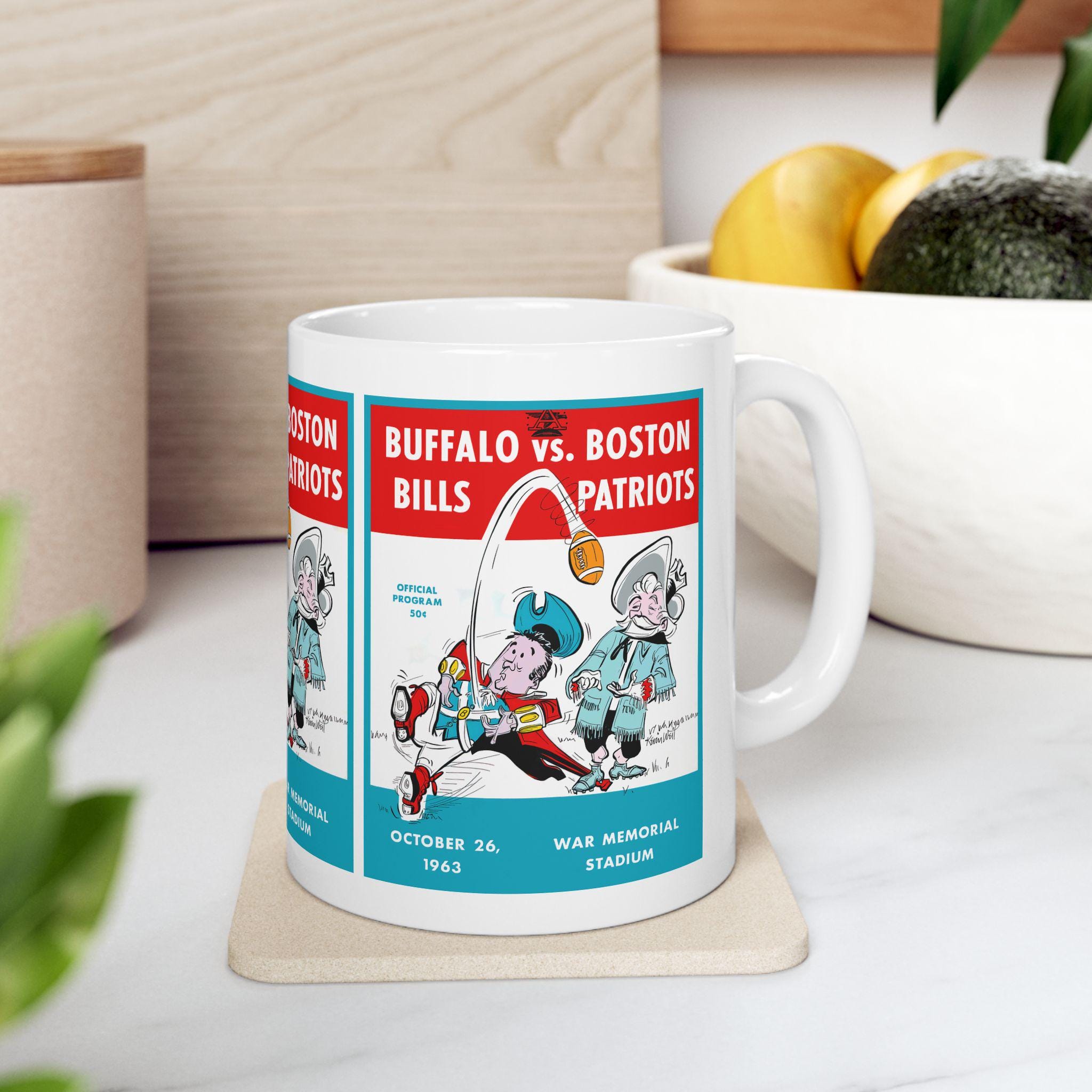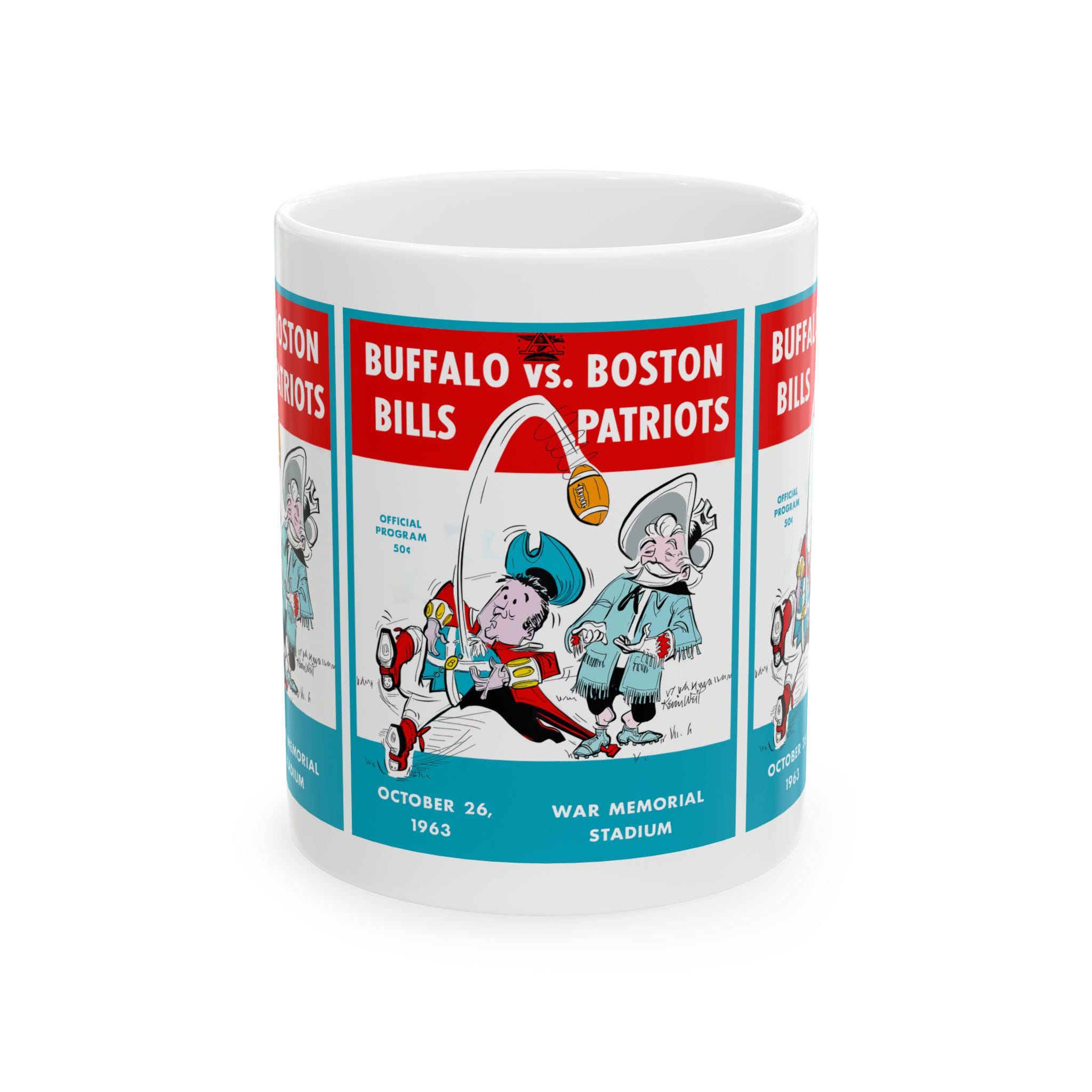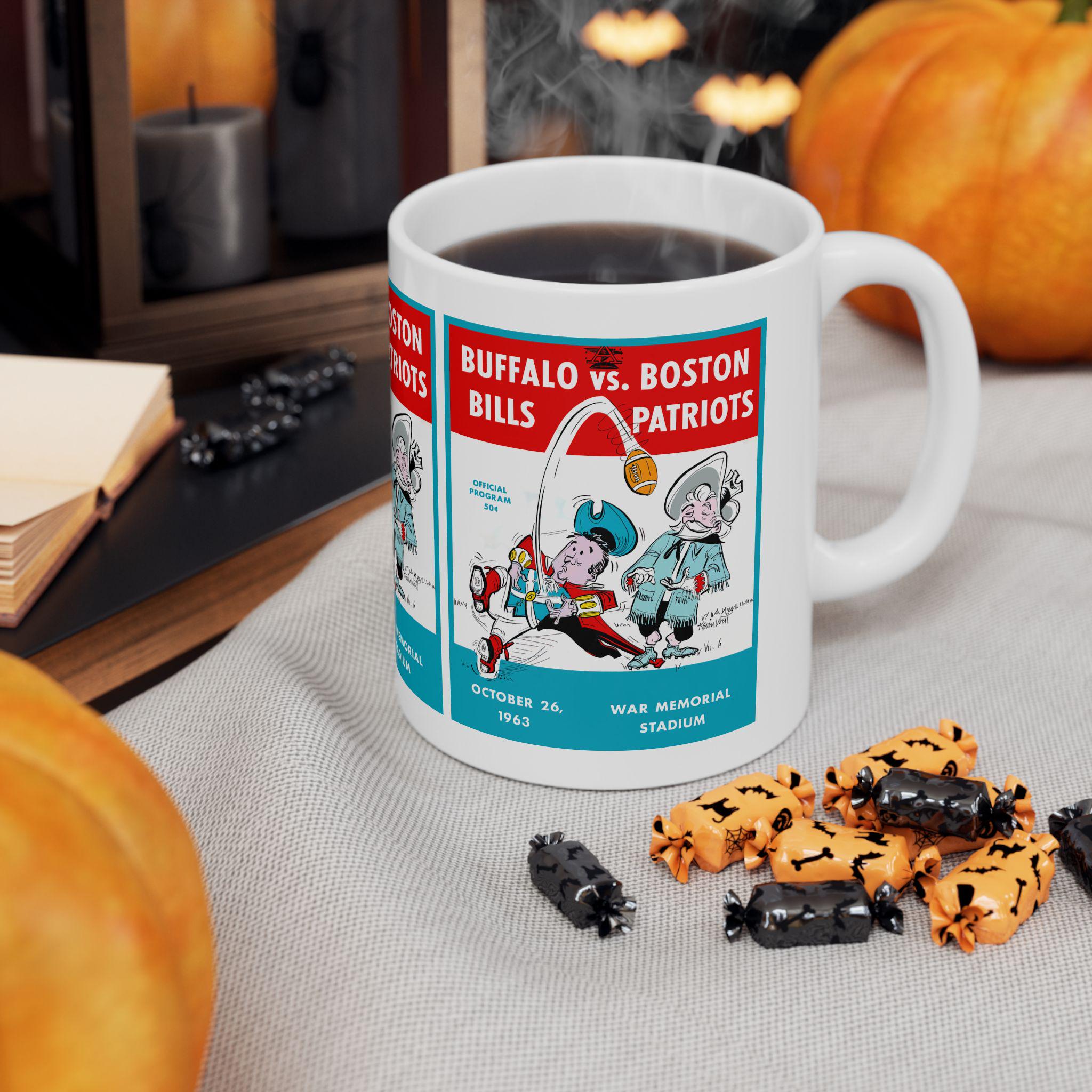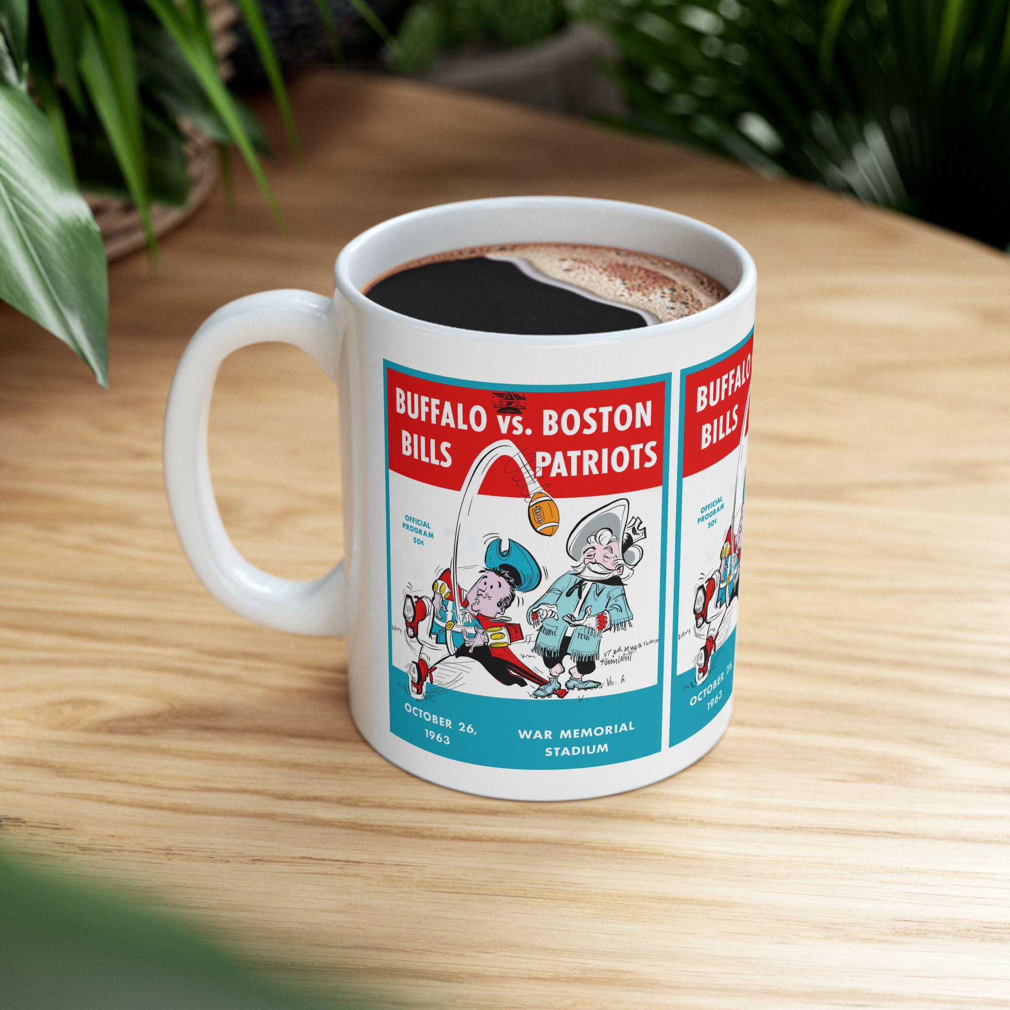 This glossy ceramic mug carries a bold, nostalgic design that nods to classic 1963 football rivalry between Buffalo and Boston. Each sip becomes a small trip back to crisp autumn afternoons and the roar of the stands — the colors pop with rich contrast and the vintage-inspired typography sits proudly against a bright white background. It's built to be part of everyday routines: sturdy, easy to grip, and resilient enough to go from morning coffee to late-night game recaps. For collectors, sports fans, or anyone who treasures regional football history, this mug brings a tangible piece of that story to the kitchen table or office desk.