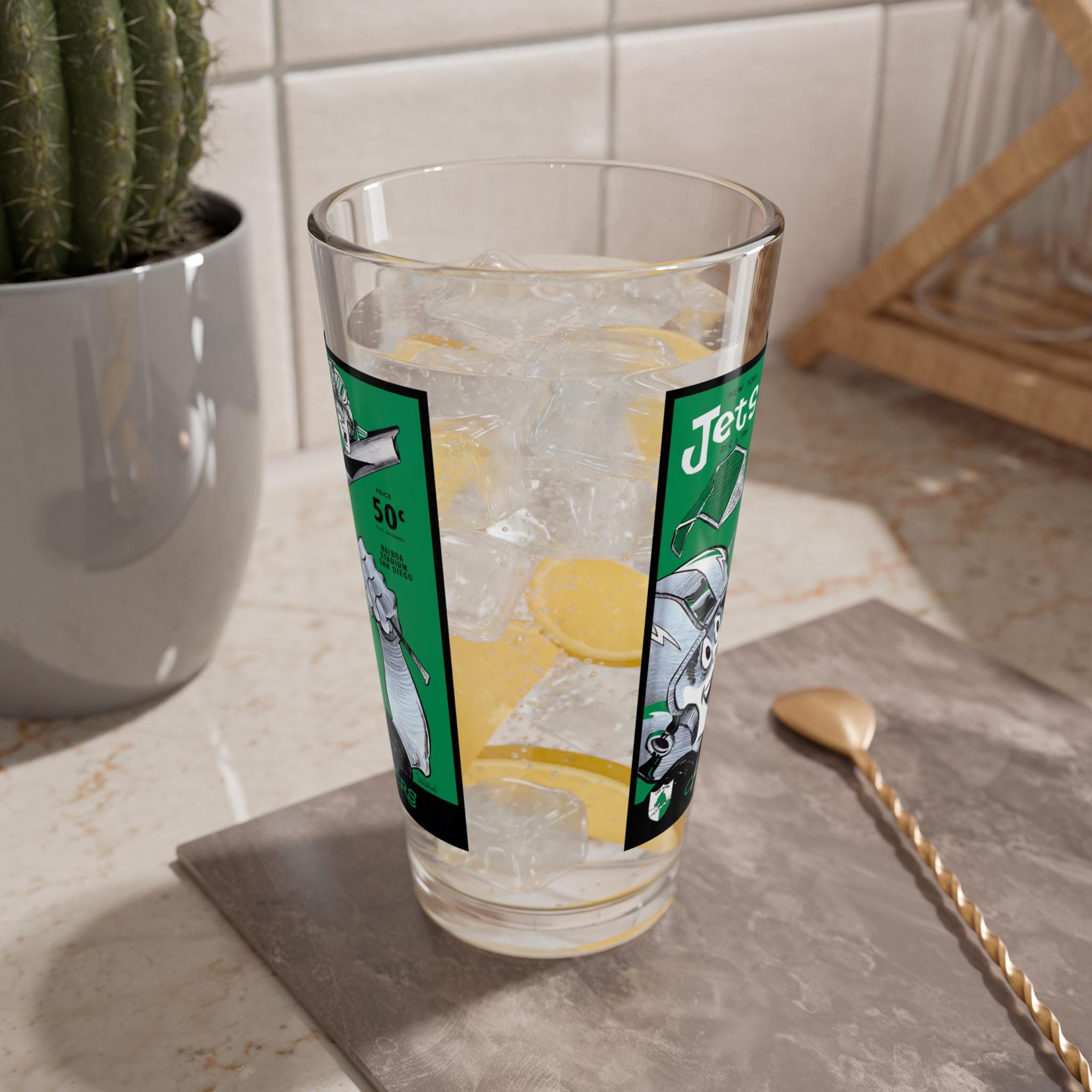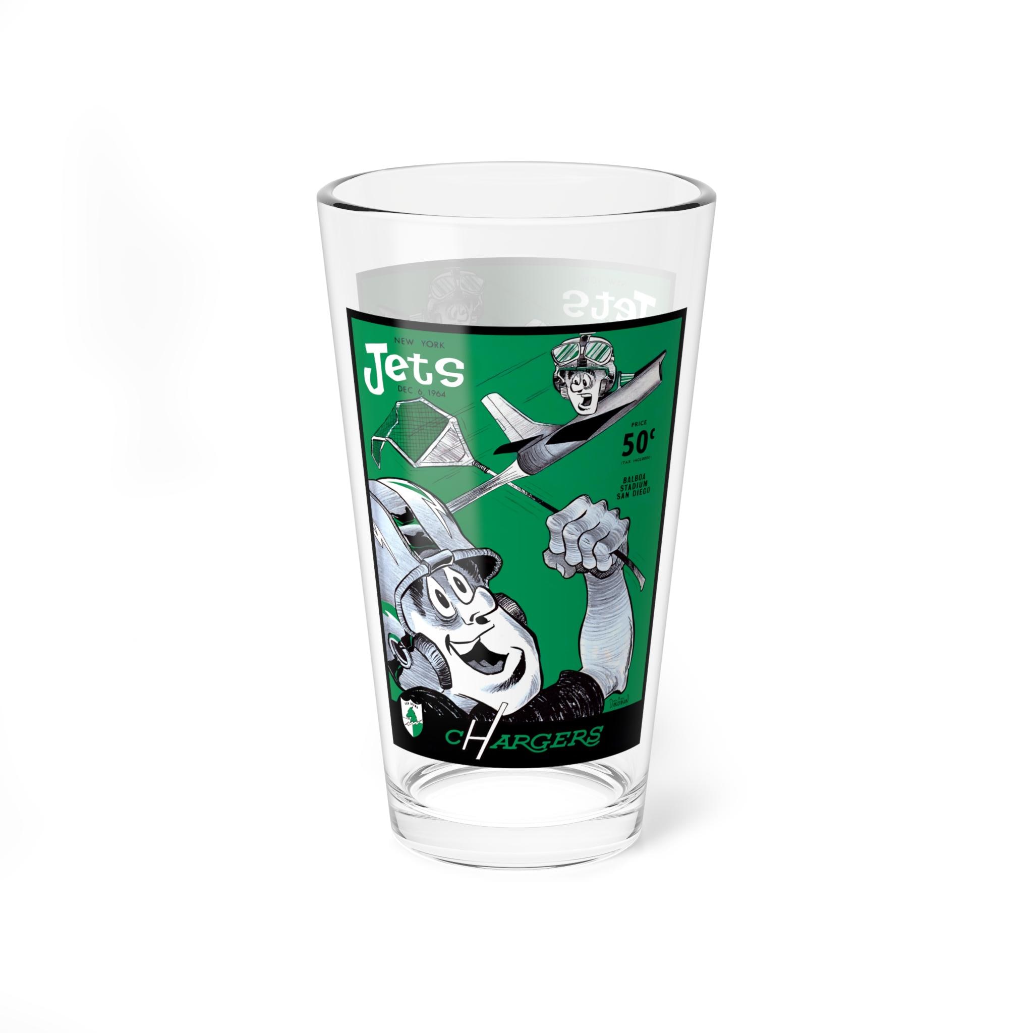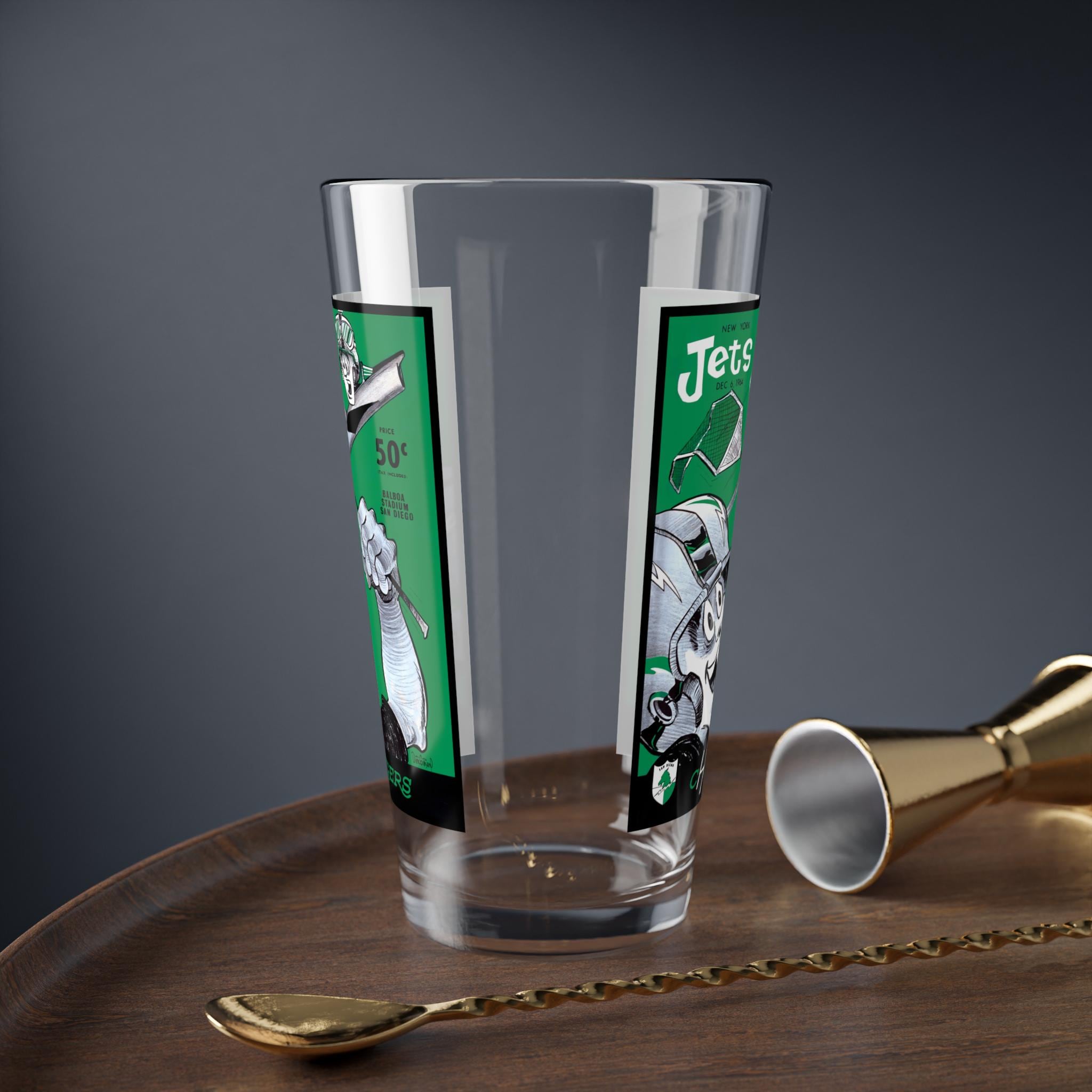 Feel the roar of the 1964 gridiron every time you pour. This 16oz mixing glass is etched with a retro Jets vs. Chargers motif that transports you back to leather helmets, packed stands, and the crack of kickoff. Heavy at the base, it sits steady on a bar cart or kitchen counter while you stir a classic cocktail or sip a cold drink after a long day. The vibrant print stays bright through regular use, and the clear glass shows off amber spirits or citrusy mixers as they swirl. For collectors of vintage sports memorabilia, game-night hosts, and anyone who loves a nostalgic nod to football history, this glass brings atmosphere and function together—solid, dependable, and unmistakably game-day ready.