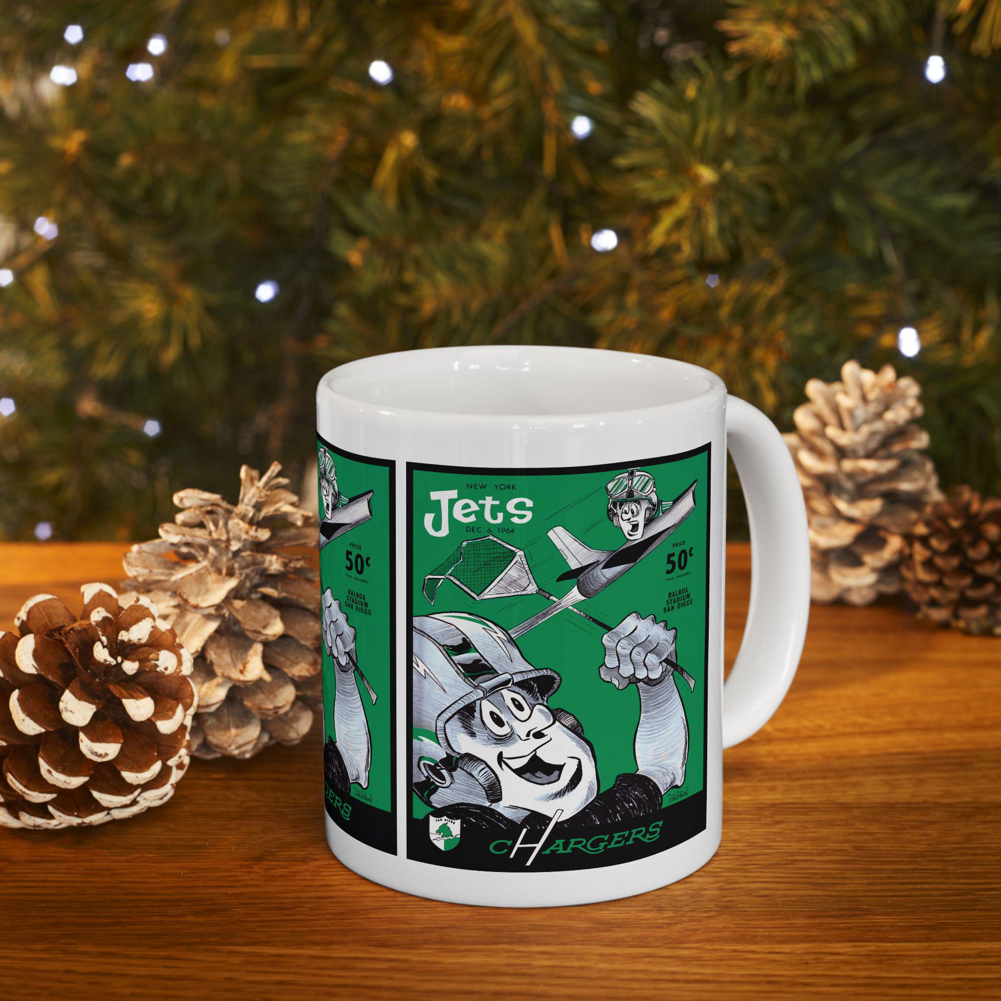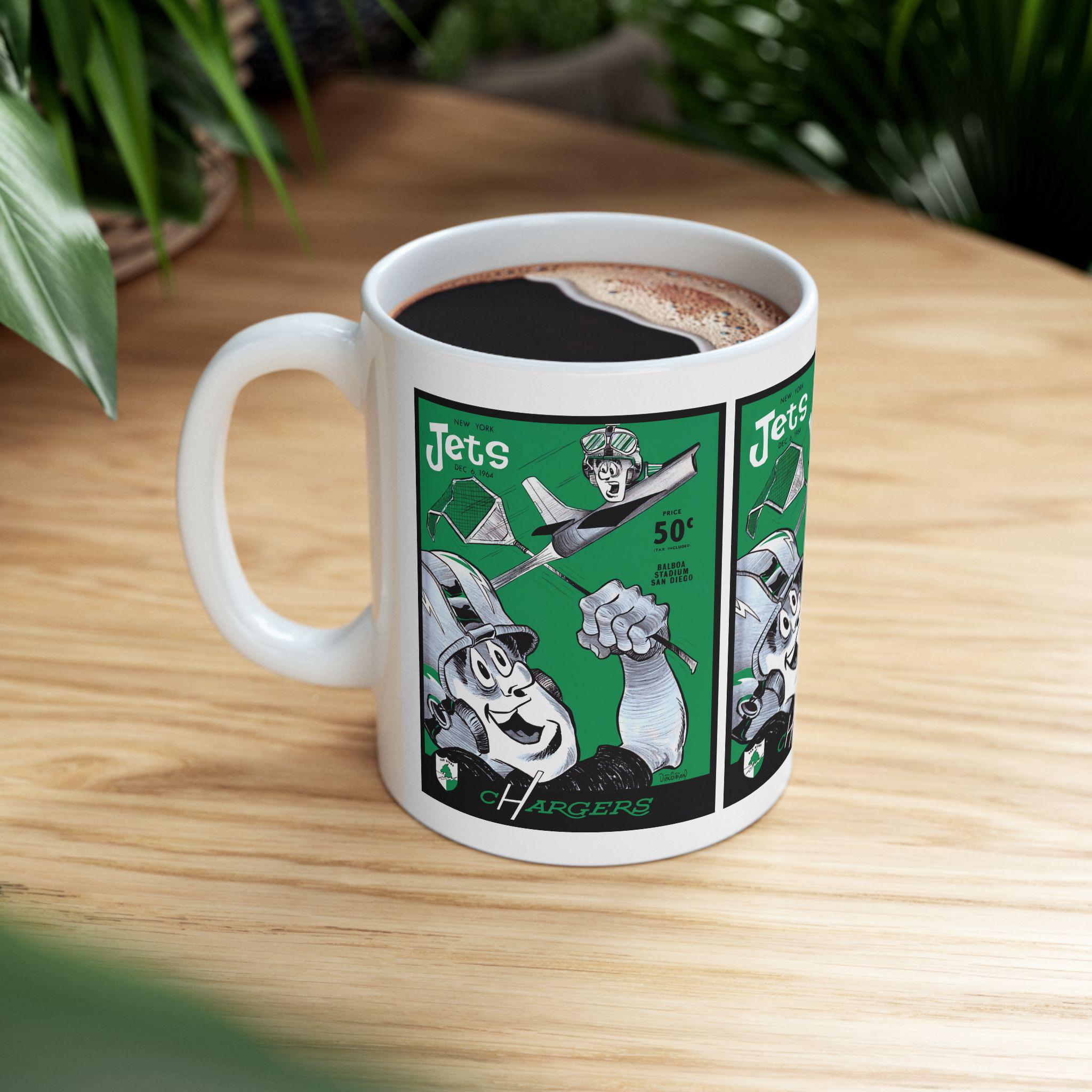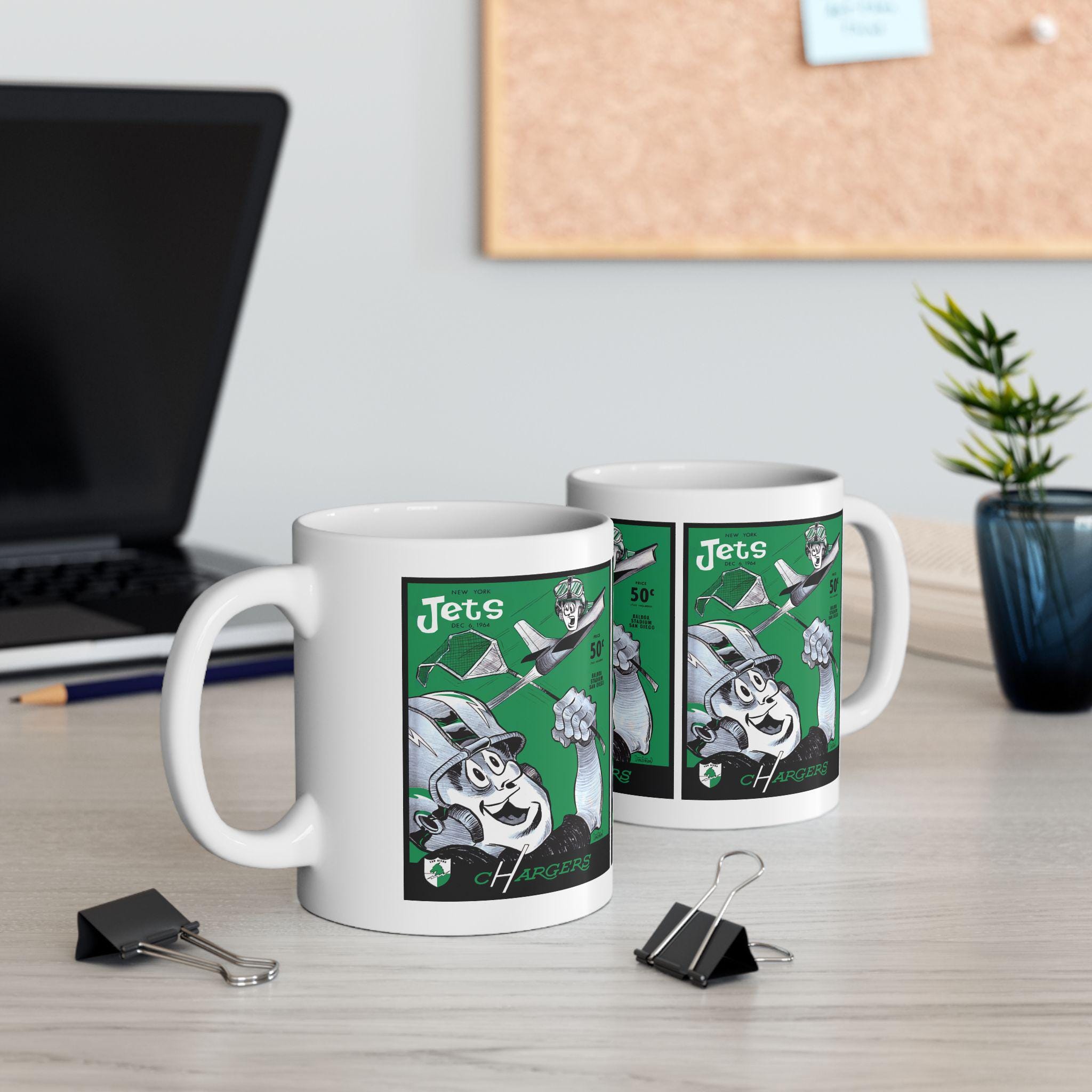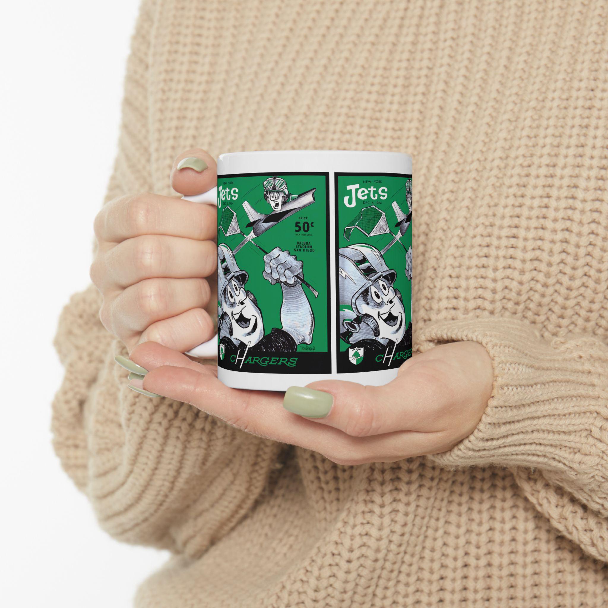 This glossy ceramic mug brings a slice of 1964 football history to your everyday routine. The retro Jets vs. Chargers design feels like a ticket stub from a gritty stadium — sun-bleached stands, ragged pennants, and the low hum of a crowd before kickoff. Sip coffee as you plan the day, and let the bold vintage artwork spark memories or conversations with fellow fans. Whether it’s pre-game ritual or a quiet morning at the kitchen table, the mug sits comfortably in your hand and keeps the moment alive.