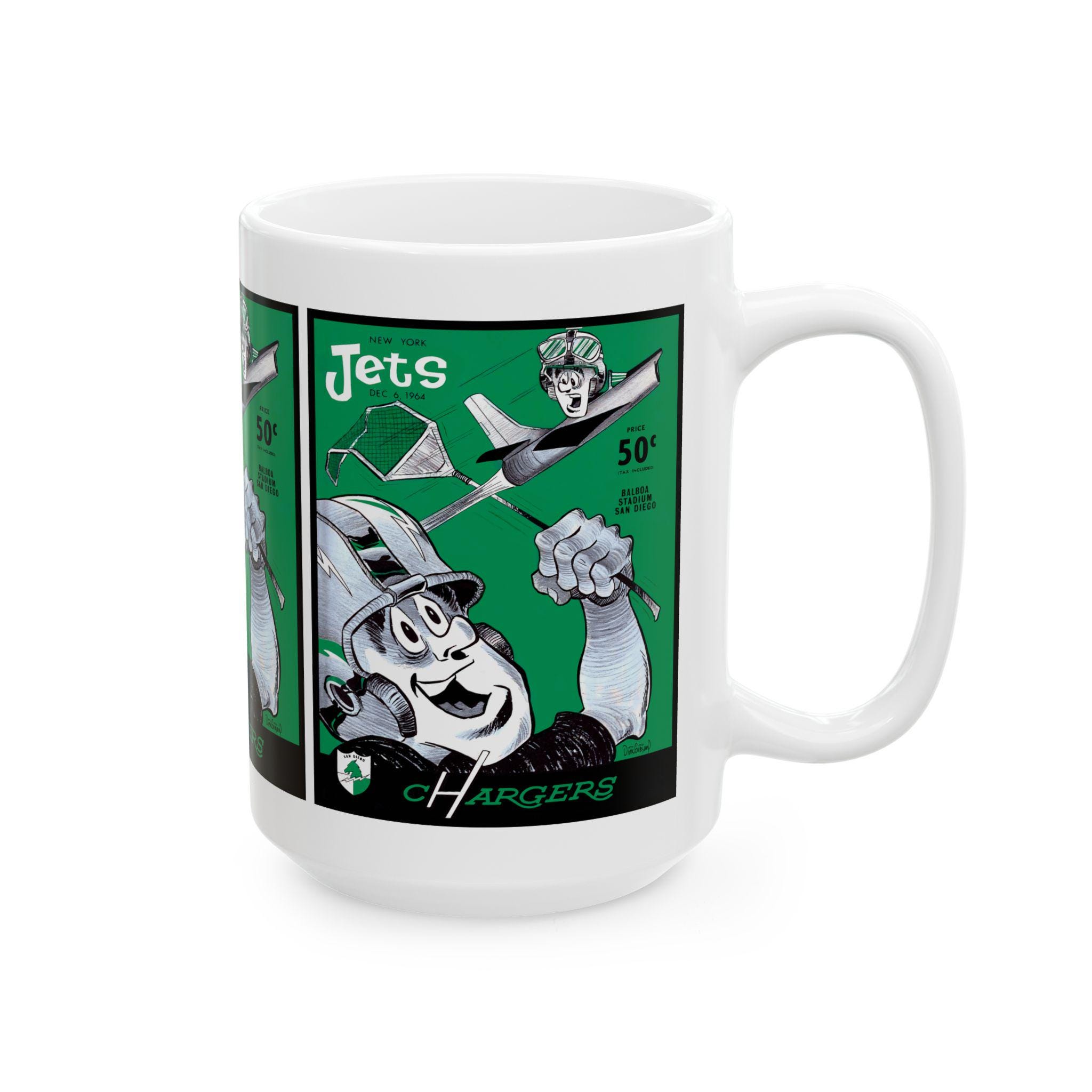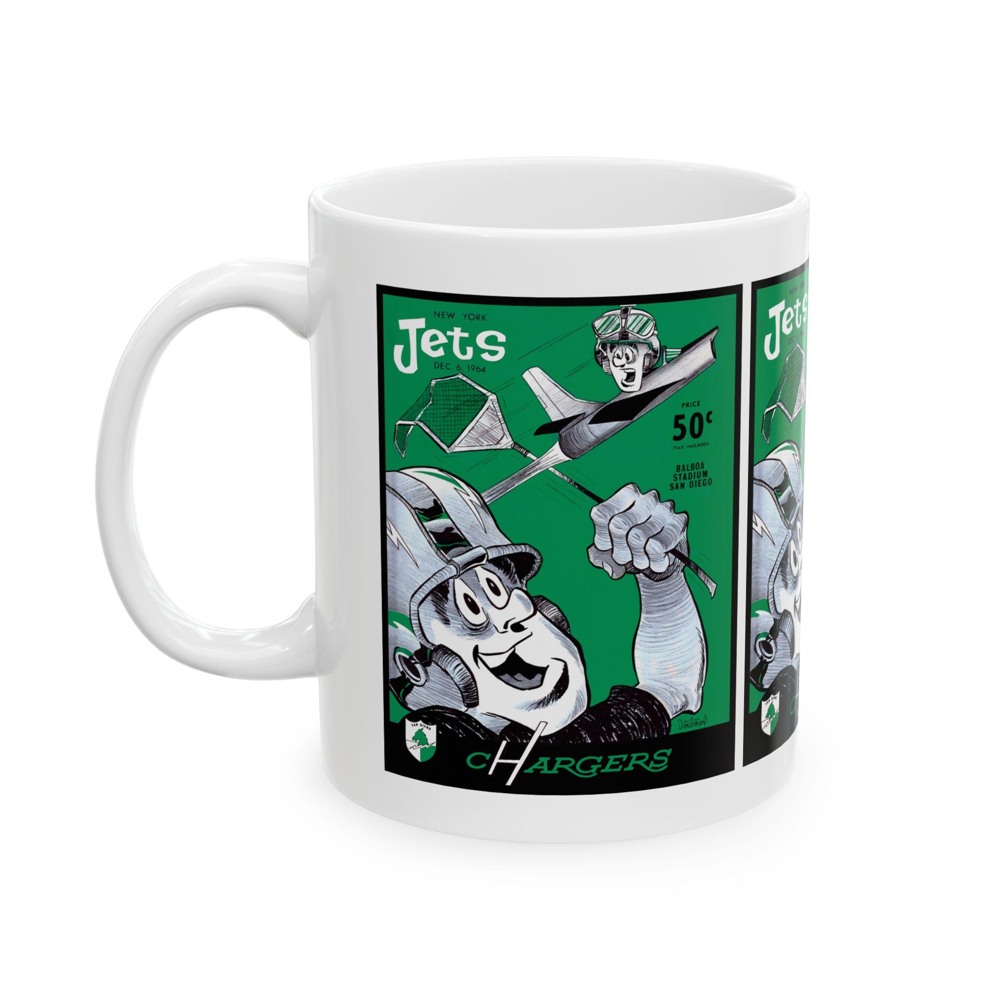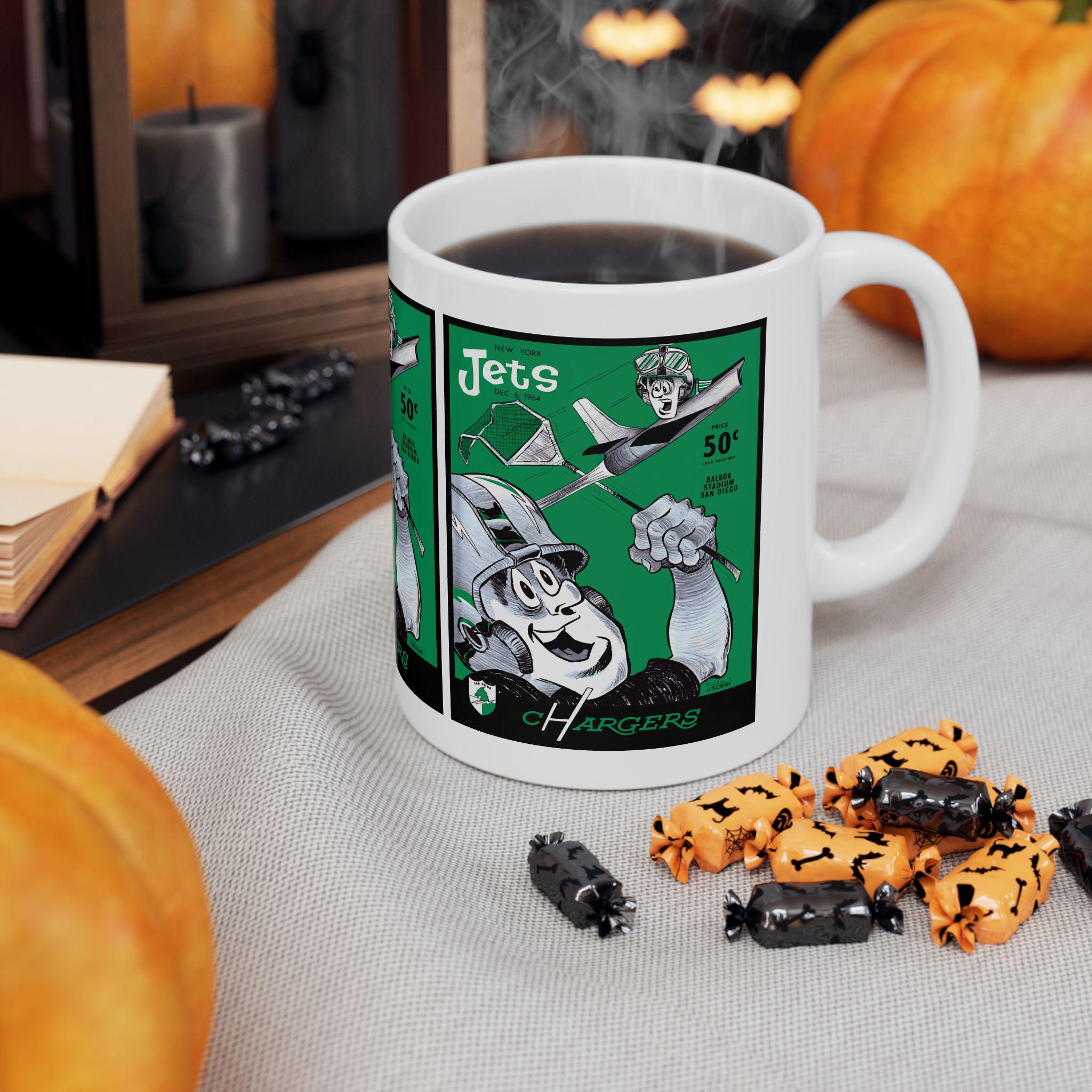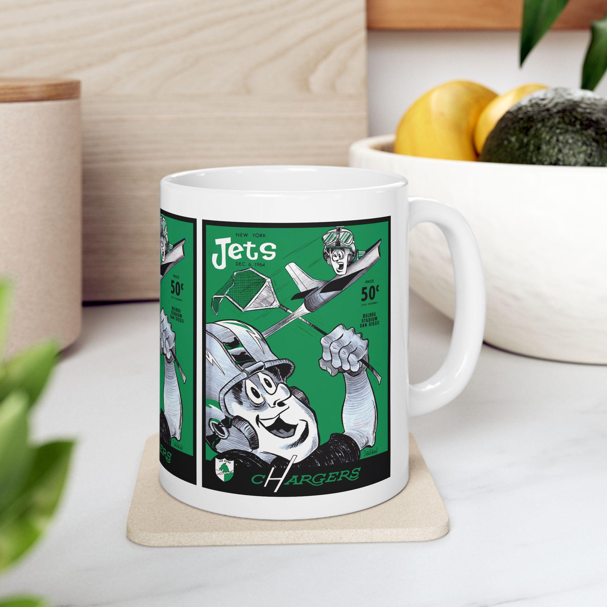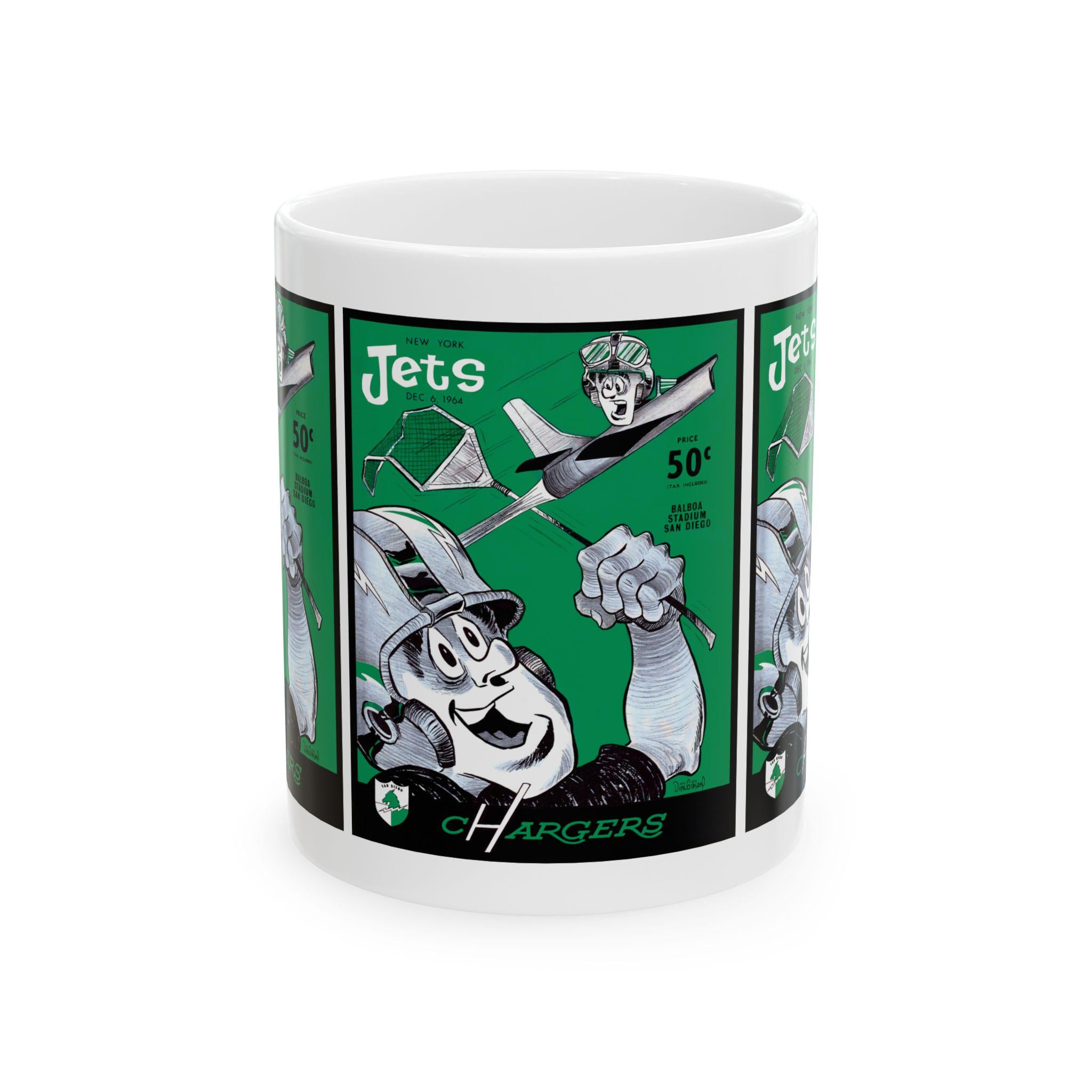 This glossy ceramic mug brings a slice of 1964 football history to your everyday routine. The retro Jets vs. Chargers design feels like a ticket stub from a gritty stadium — sun-bleached stands, ragged pennants, and the low hum of a crowd before kickoff. Sip coffee as you plan the day, and let the bold vintage artwork spark memories or conversations with fellow fans. Whether it’s pre-game ritual or a quiet morning at the kitchen table, the mug sits comfortably in your hand and keeps the moment alive.