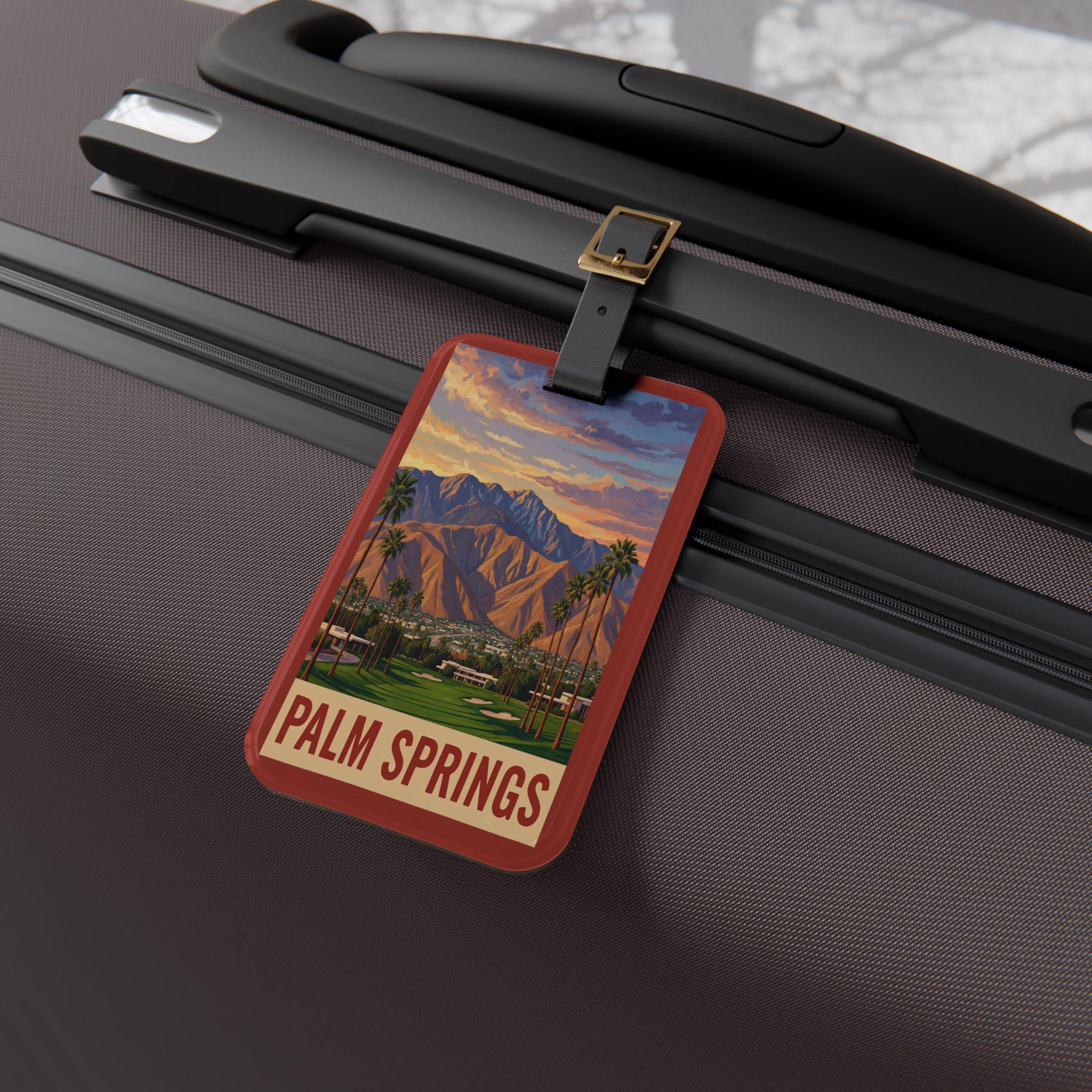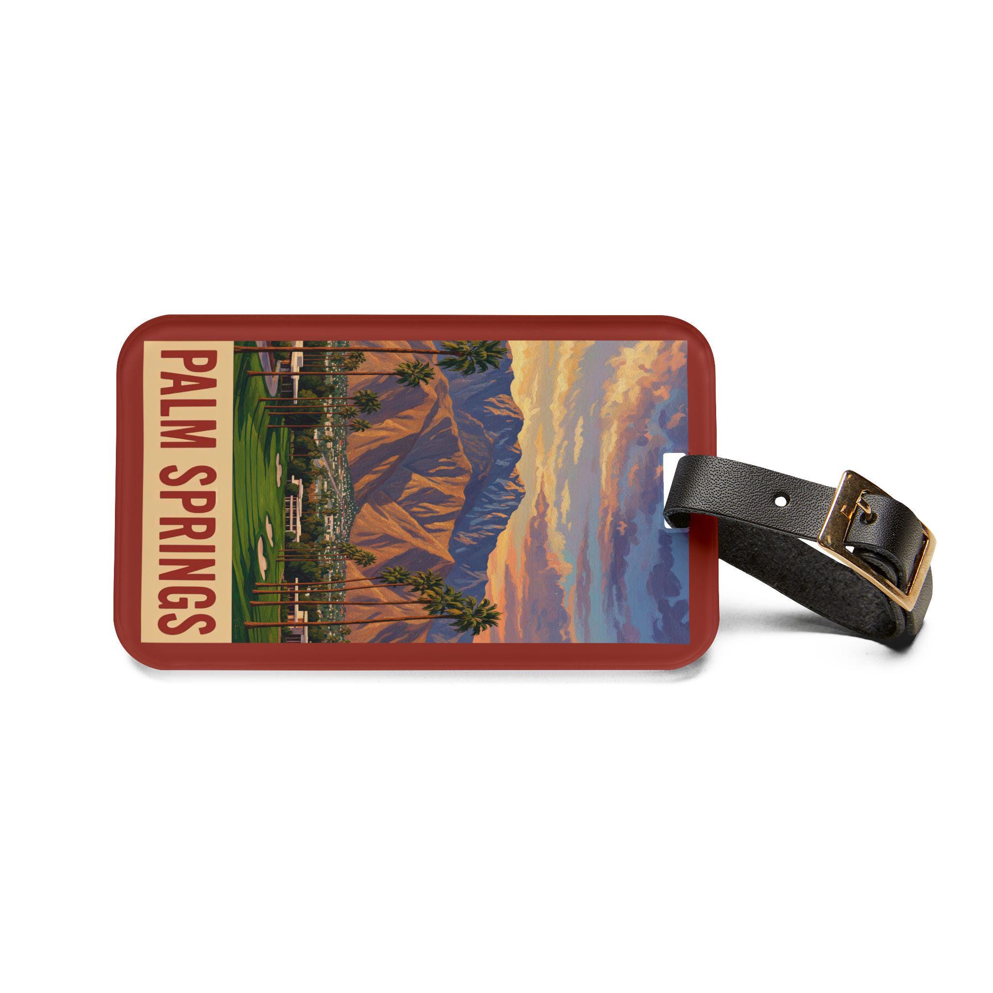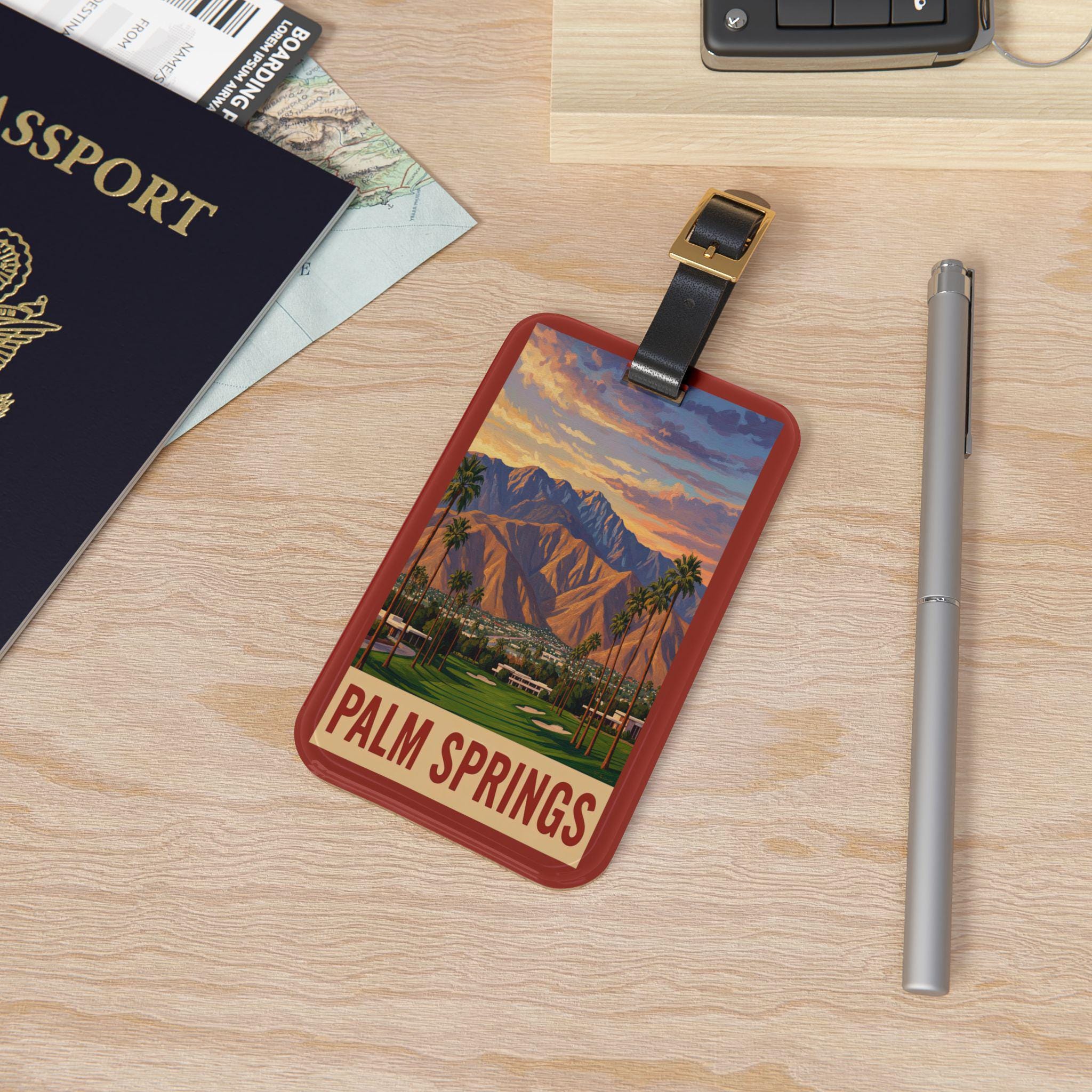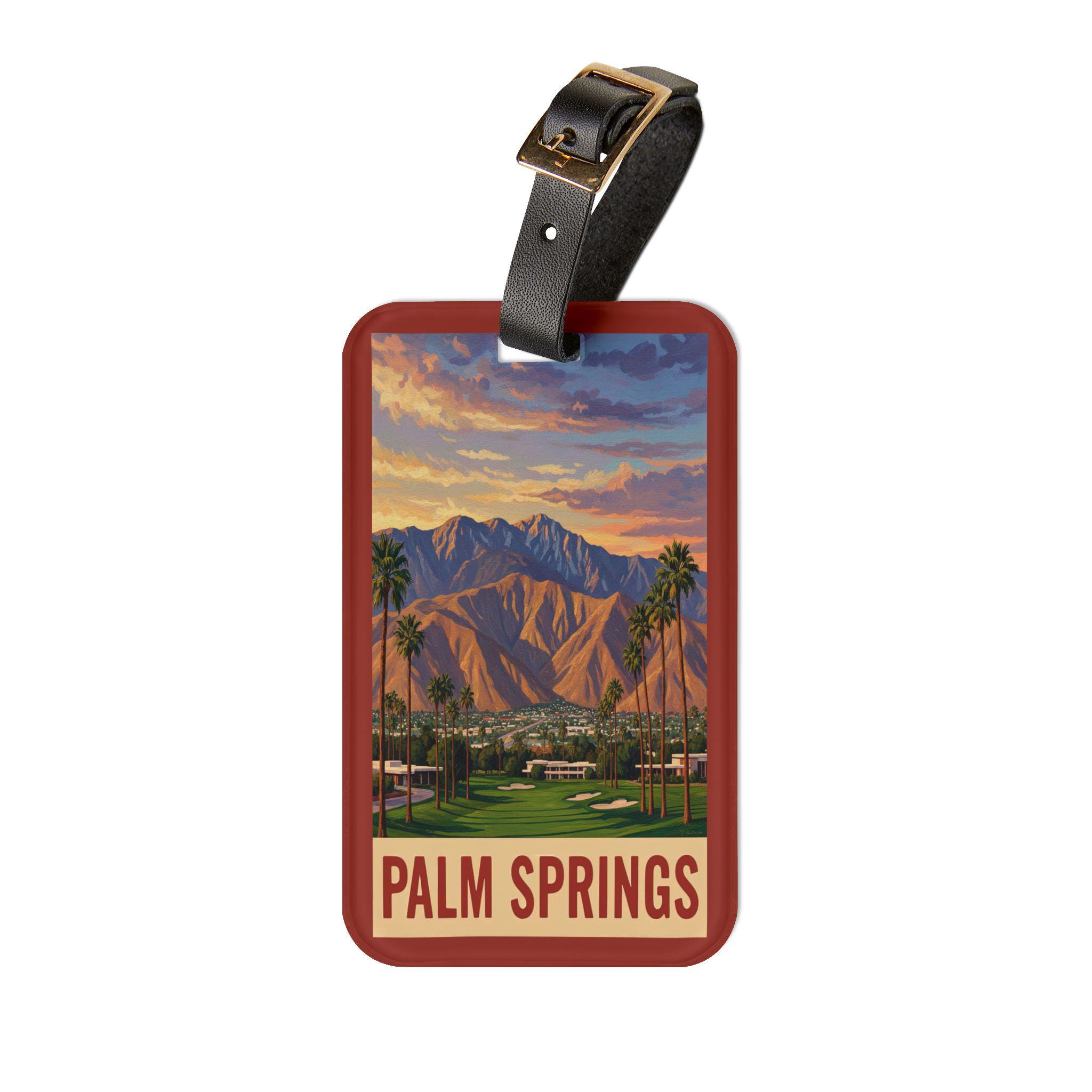 This acrylic luggage tag channels Palm Springs WPA-era graphics — sunbaked pastels, bold geometric shapes, and a vintage-modern vibe. Slip it onto your suitcase and it reads like a little postcard from mid-century California: warm light, tapered palms, and sun-drenched highways. It’s small but striking, a single-sided glossy panel that makes your bag easy to spot on a carousel and sparks conversations before you even reach the terminal. The leather strap sits securely through the reinforced hole; inside the rear sleeve a business card slips in so your contact is tucked away but accessible. For those who travel with an eye for design and a love of retro desert style, this tag blends durability with unmistakable Palm Springs flair.
