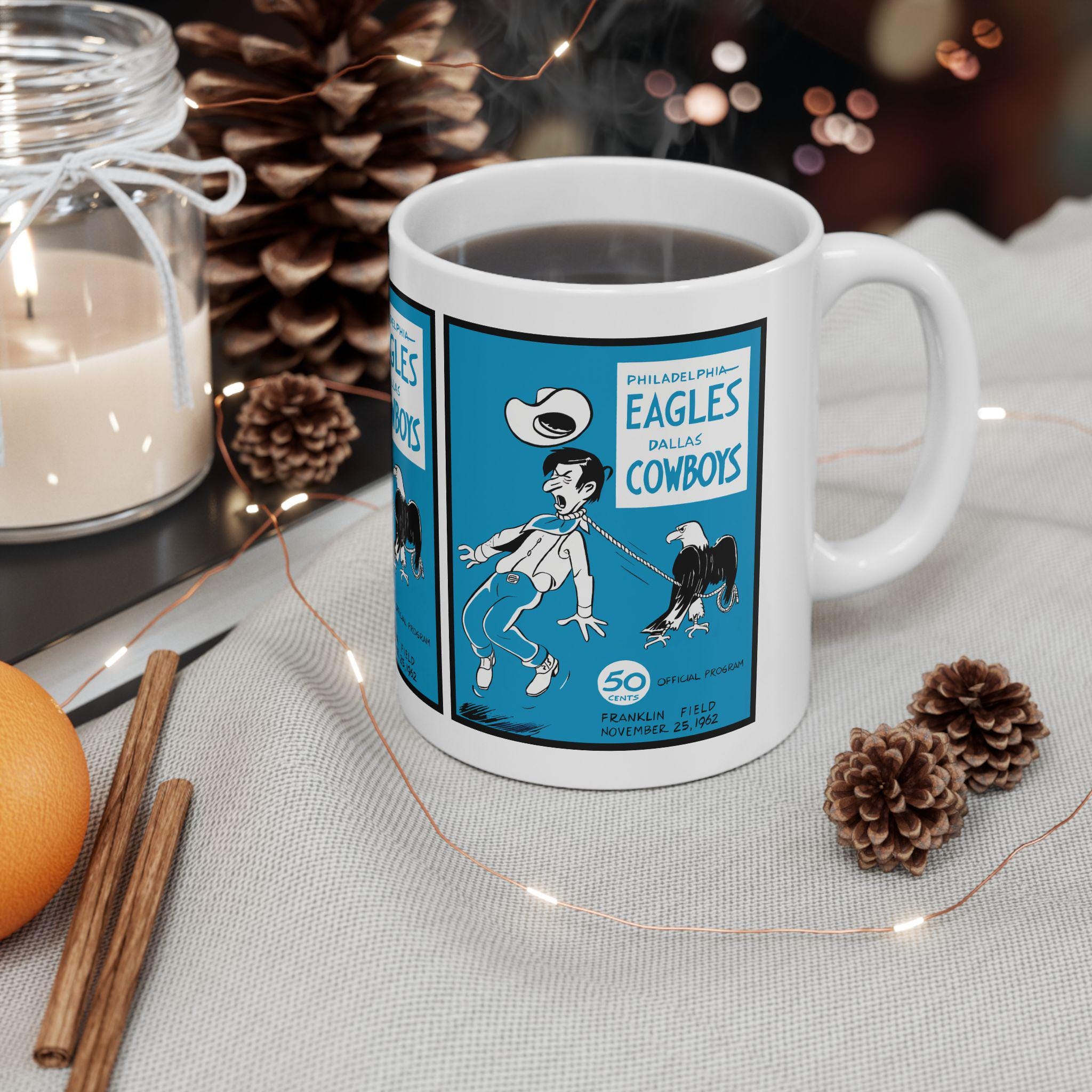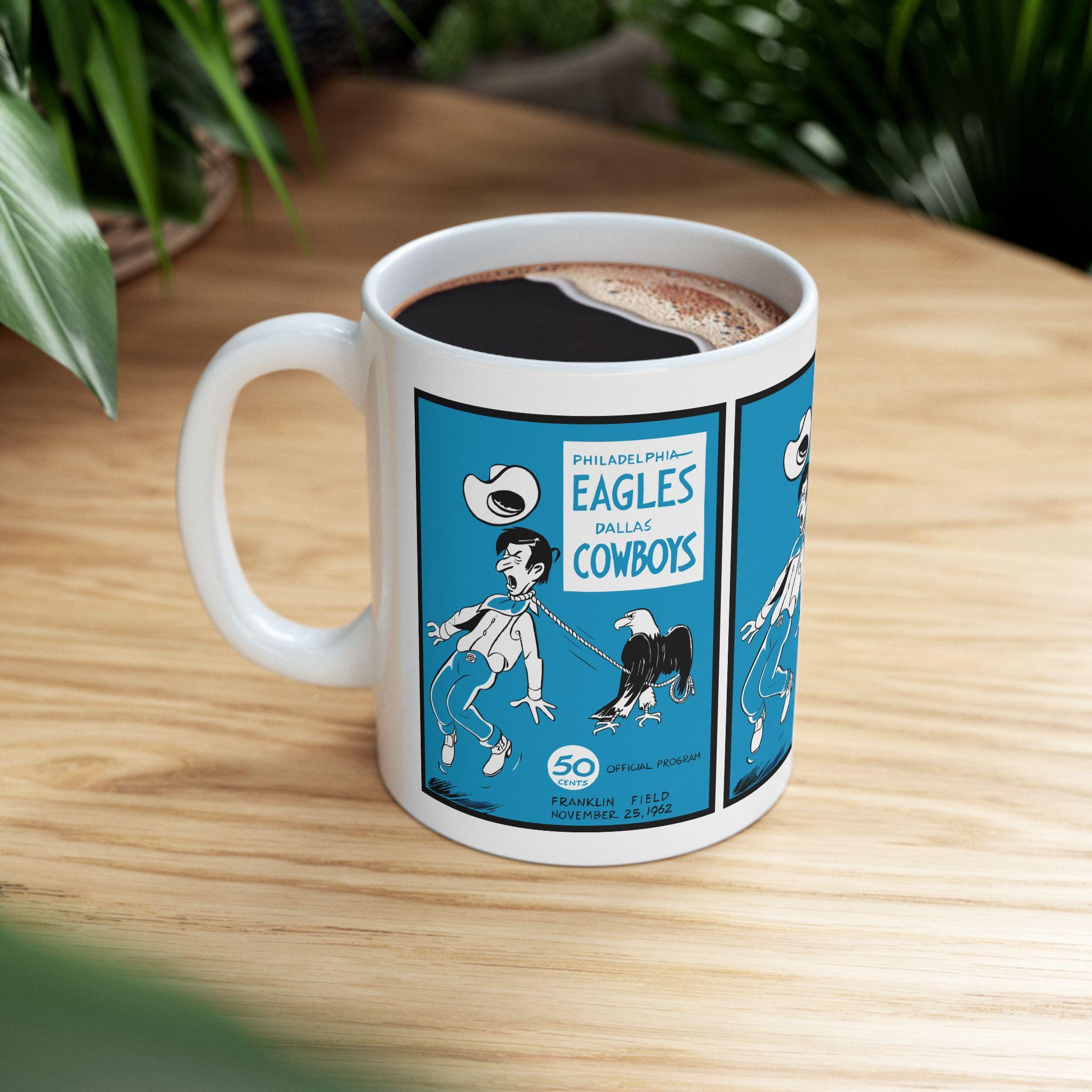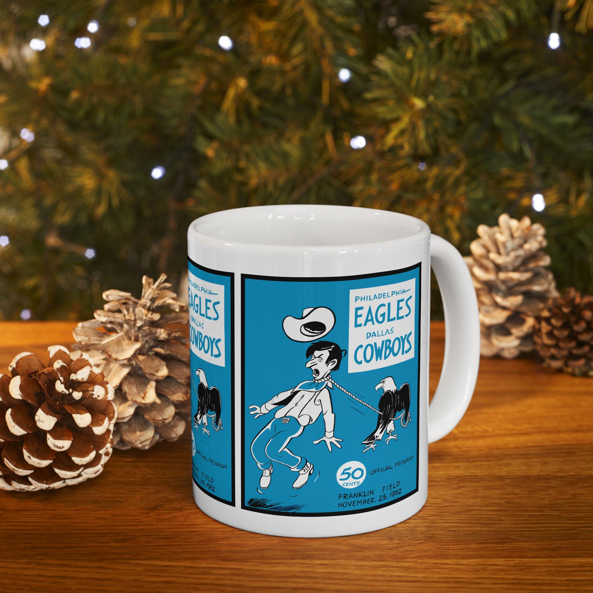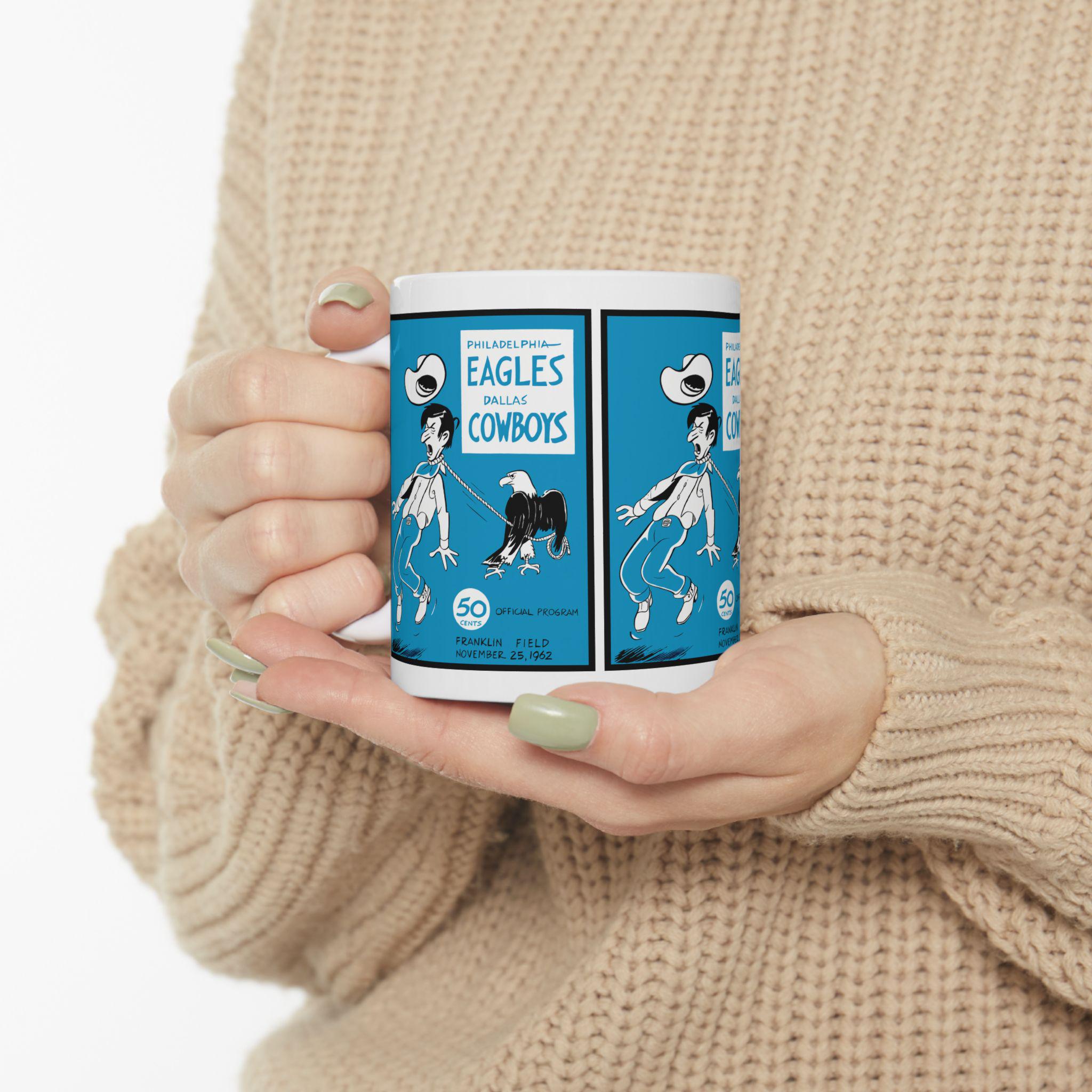 This ceramic mug brings a slice of 1962 football history to your morning routine. The bold Cowboys vs. Eagles motif is printed in bright, enduring color on glossy white ceramic — a small, tactile reminder of gritty games, cold stadium air, and rivalries that still spark debate. Hold the comfortable C-handle and feel the weight of a well-made mug as you sip coffee before a weekend watch party or settle in for a midweek replay. It tucks easily into a display shelf or cupboard, and the shiny finish catches the light like a scoreboard at dusk.