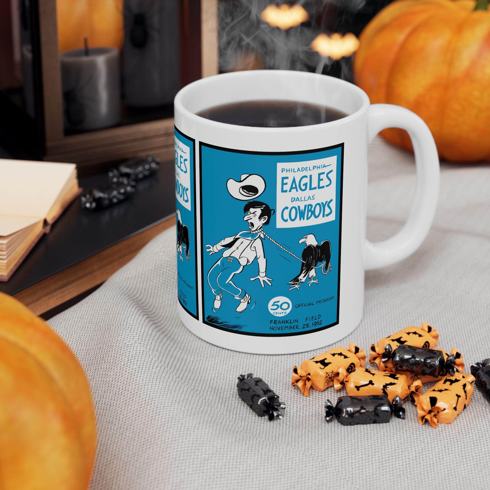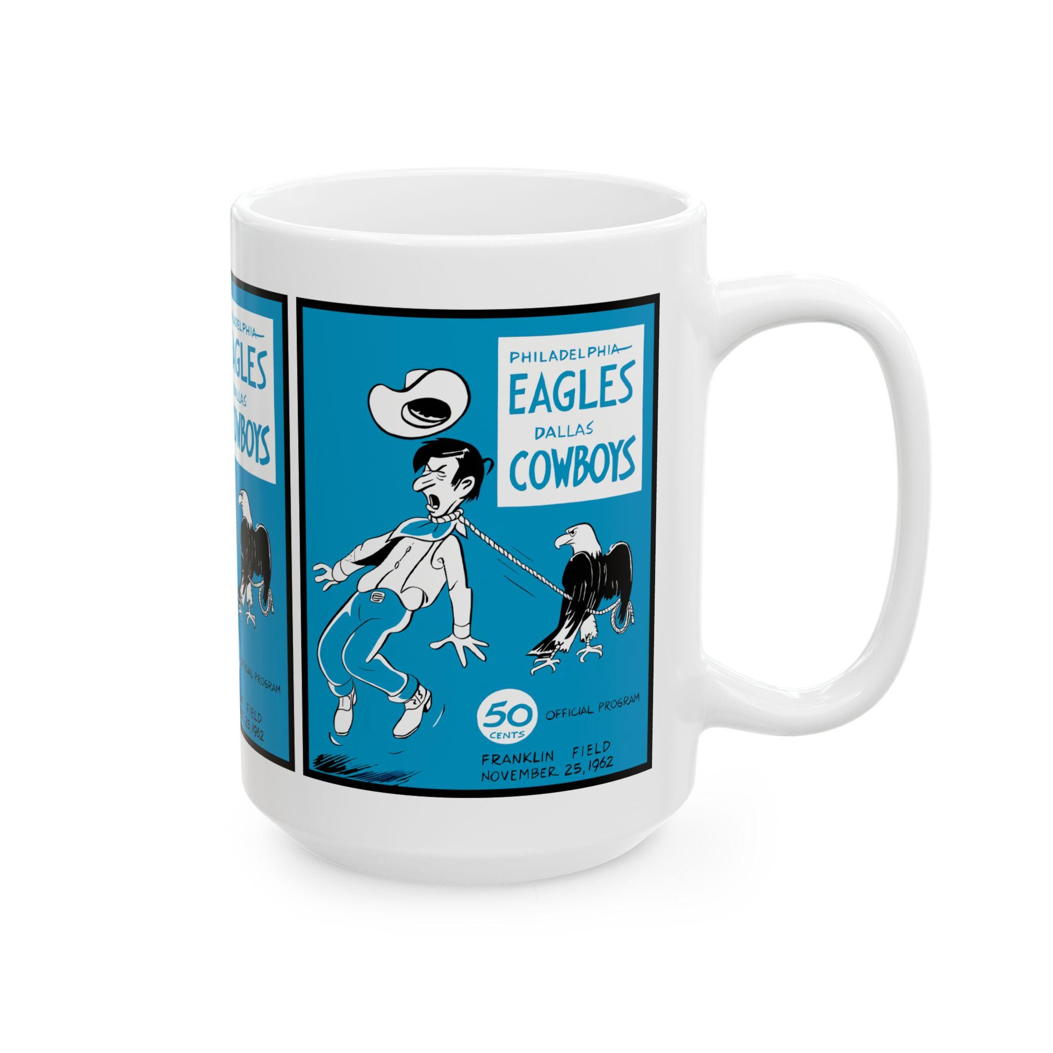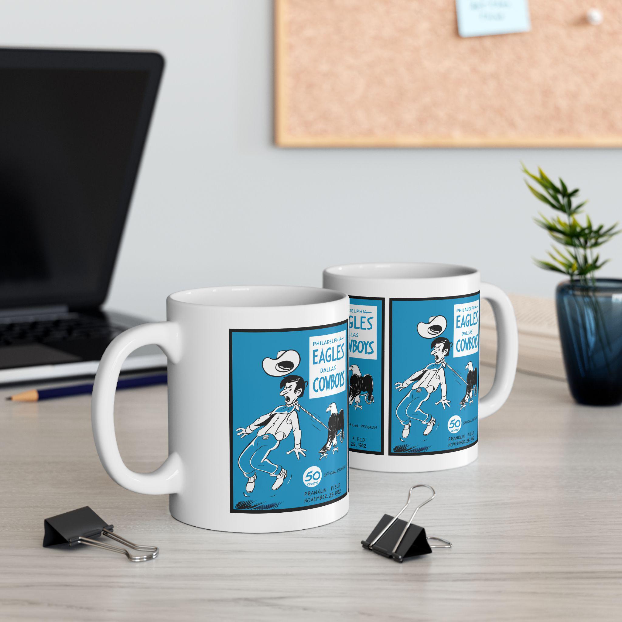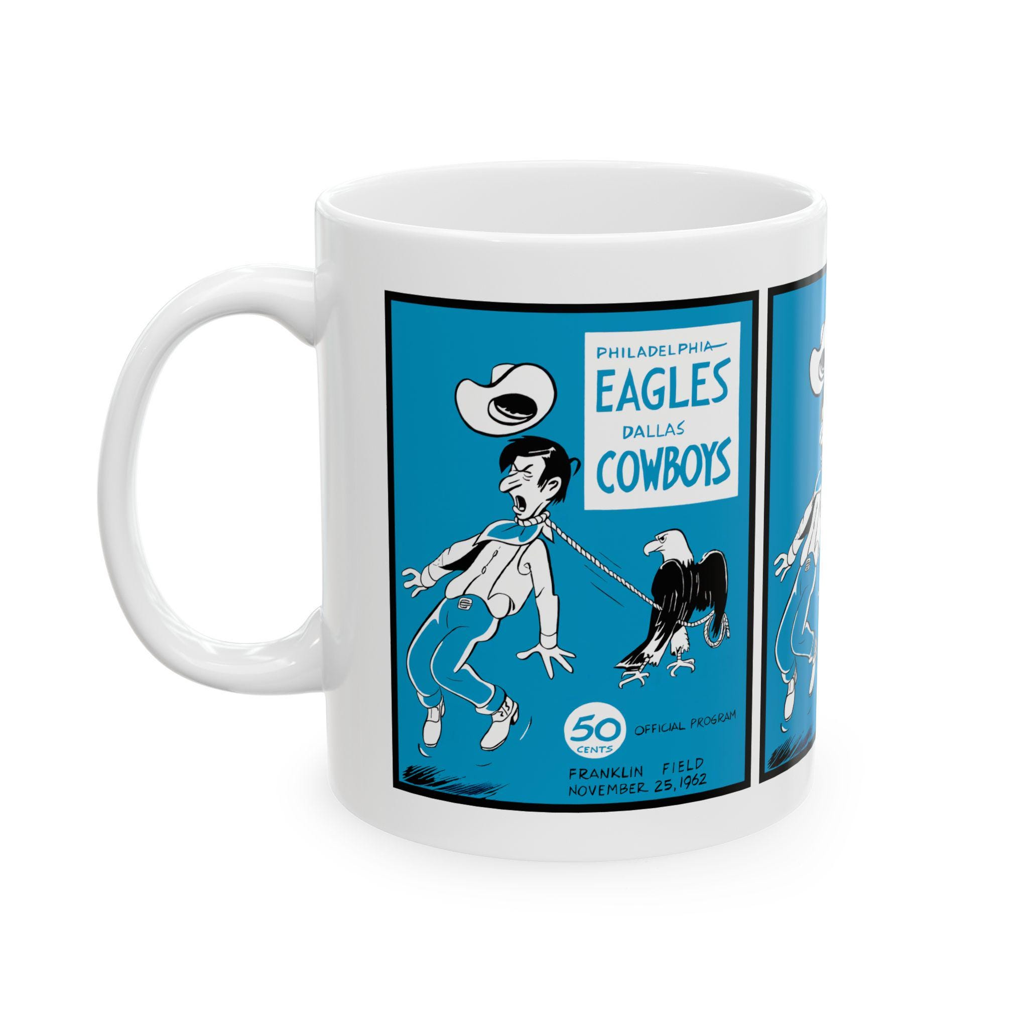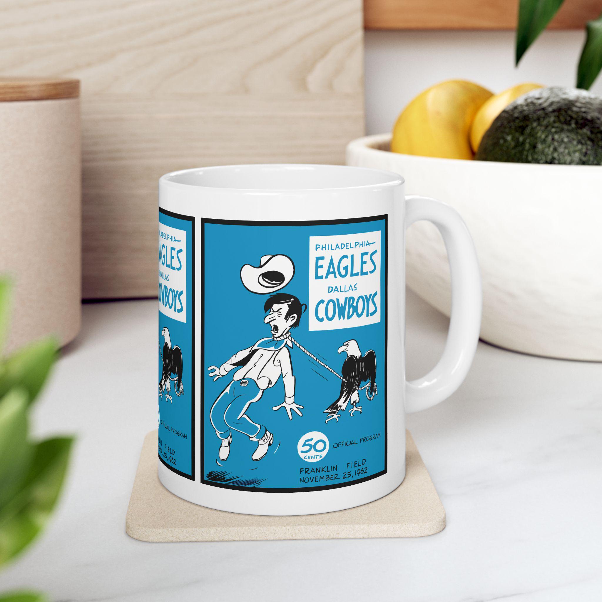This ceramic mug brings a slice of 1962 football history to your morning routine. The bold Cowboys vs. Eagles motif is printed in bright, enduring color on glossy white ceramic — a small, tactile reminder of gritty games, cold stadium air, and rivalries that still spark debate. Hold the comfortable C-handle and feel the weight of a well-made mug as you sip coffee before a weekend watch party or settle in for a midweek replay. It tucks easily into a display shelf or cupboard, and the shiny finish catches the light like a scoreboard at dusk.