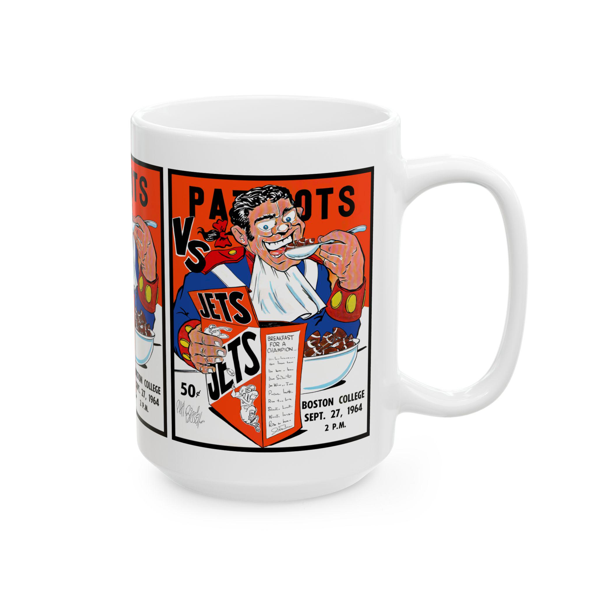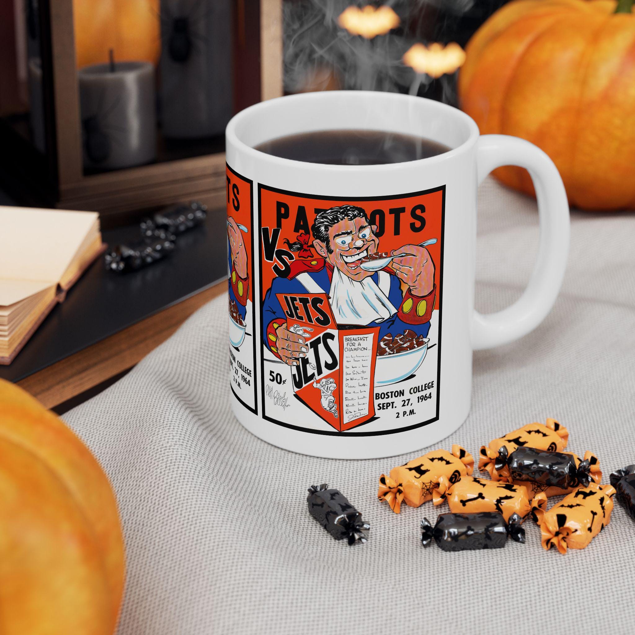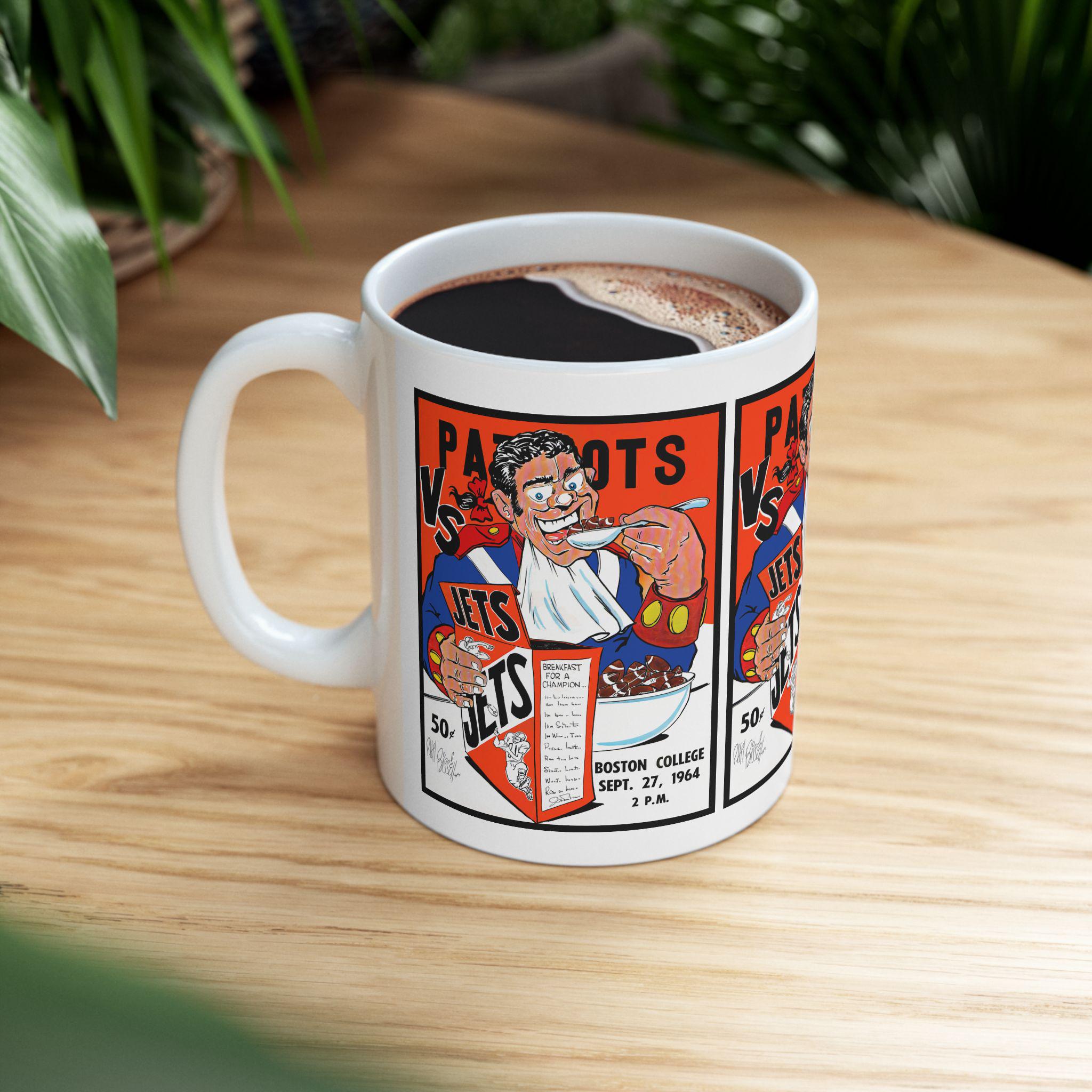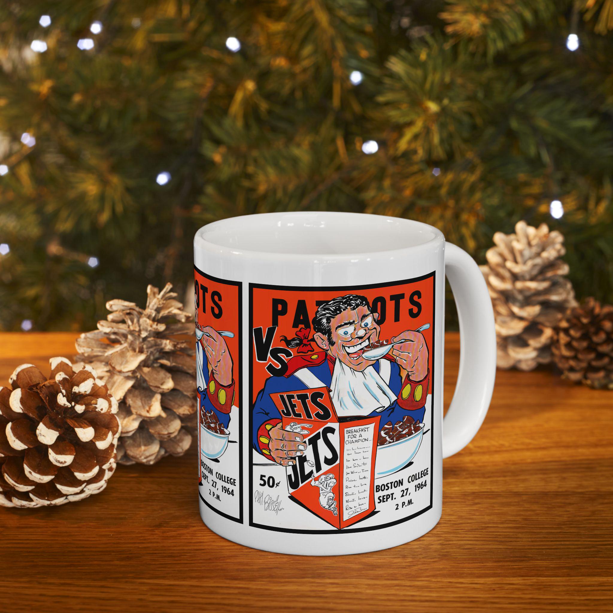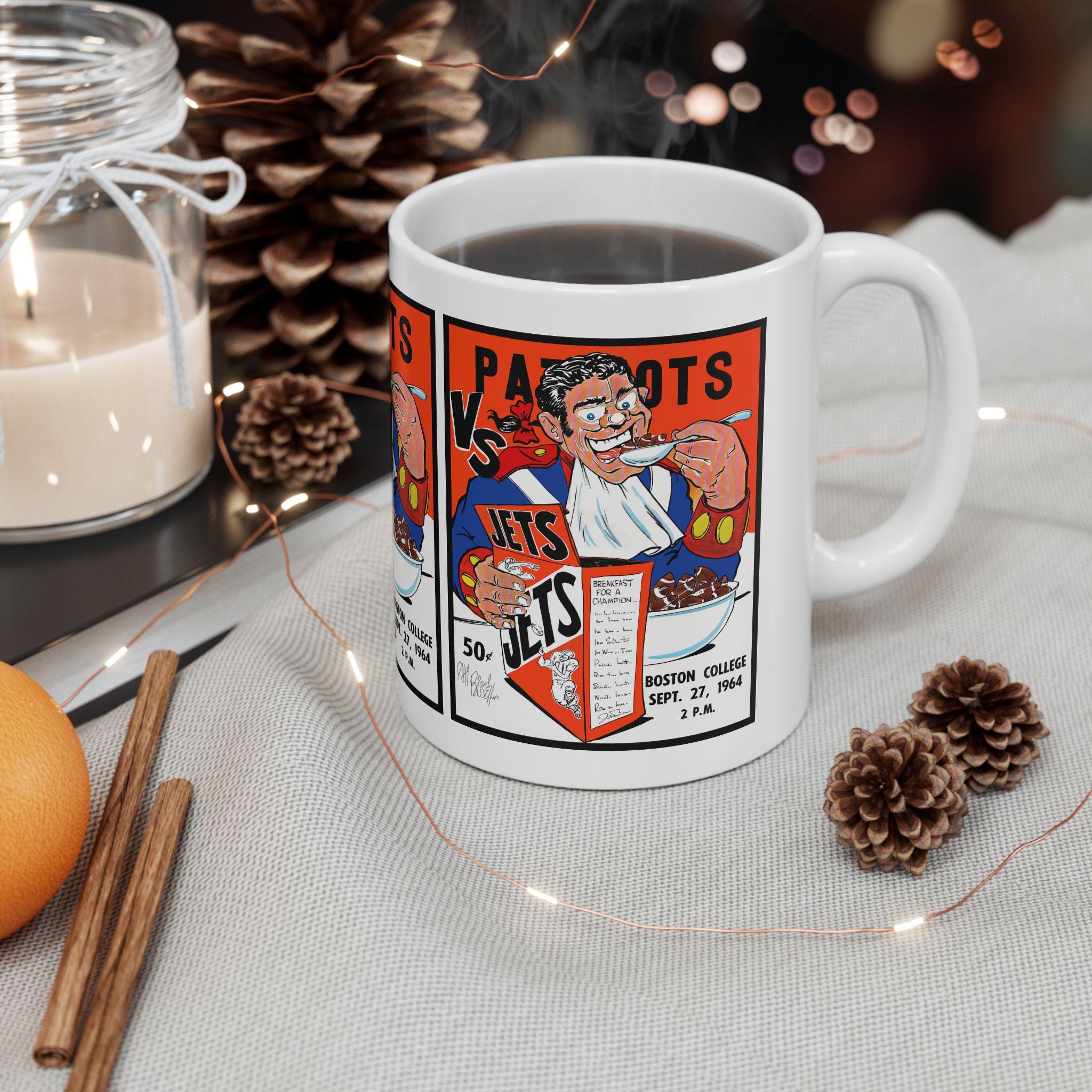 Carry a slice of 1960s football history to your morning routine. This ceramic mug celebrates the 1964 Patriots–Jets era with bold, vintage-inspired graphics that pop against glossy white ceramic. Each sip brings a touch of stadium energy — the rumble of the crowd, the crisp fall air, the thrill of competition. It fits naturally into the life of a retro-football fan: on game day mornings, during backyard watch parties, or tucked into quiet afternoons while poring over old rosters and memories. The design speaks to collectors and longtime supporters who appreciate authentic sports nostalgia, and the sturdy C-handle and shiny finish make it both tactile and display-worthy. Whether stacked on your shelf with other memorabilia or out on the coffee table while friends debate classic plays, this mug keeps that vintage rivalry alive.