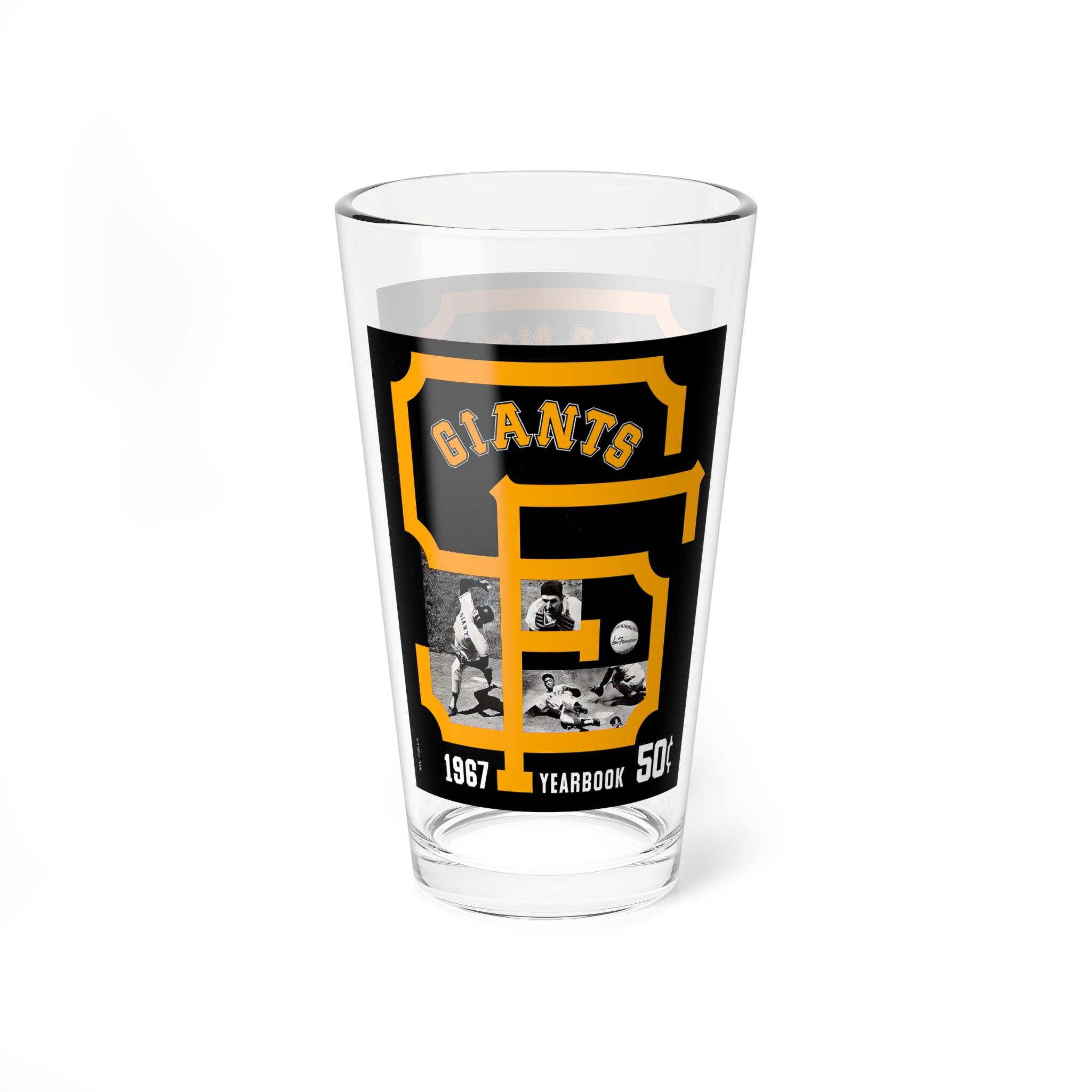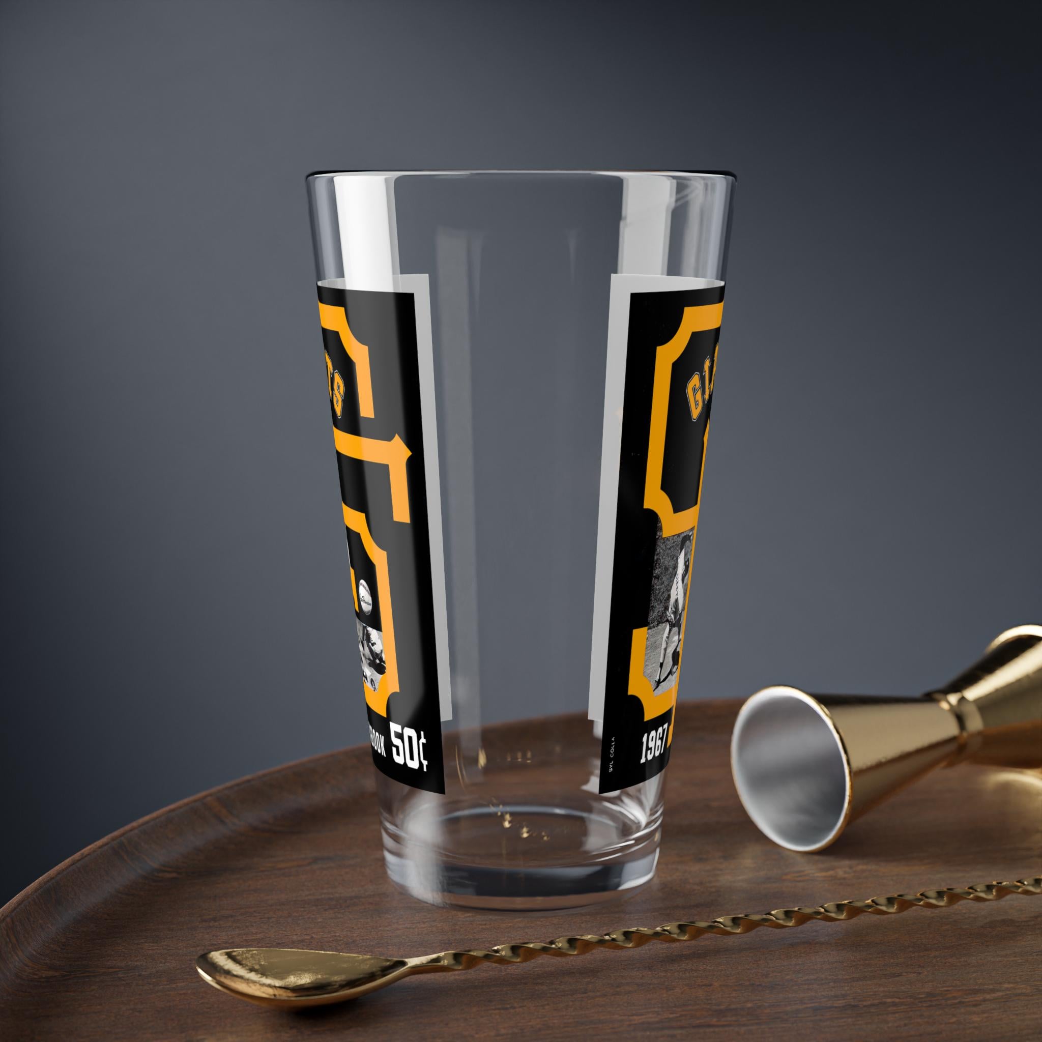 Bring a slice of 1967 San Francisco baseball history to your home bar. This 16oz mixing glass holds a steady pour and a steady sense of nostalgia — the clear, vibrant printed design evokes old ballpark scoreboards and the buzz of game day. It feels substantial in your hand: a heavy, solid glass base keeps it grounded while you stir, and the durable construction stands up to regular use. Use it to mix classic cocktails, measure spirits, or sip your favorite cold drink while you replay that legendary season in your head. The bright printed colors pop against the clear glass, making it a small, everyday reminder of summer nights at the ballpark.