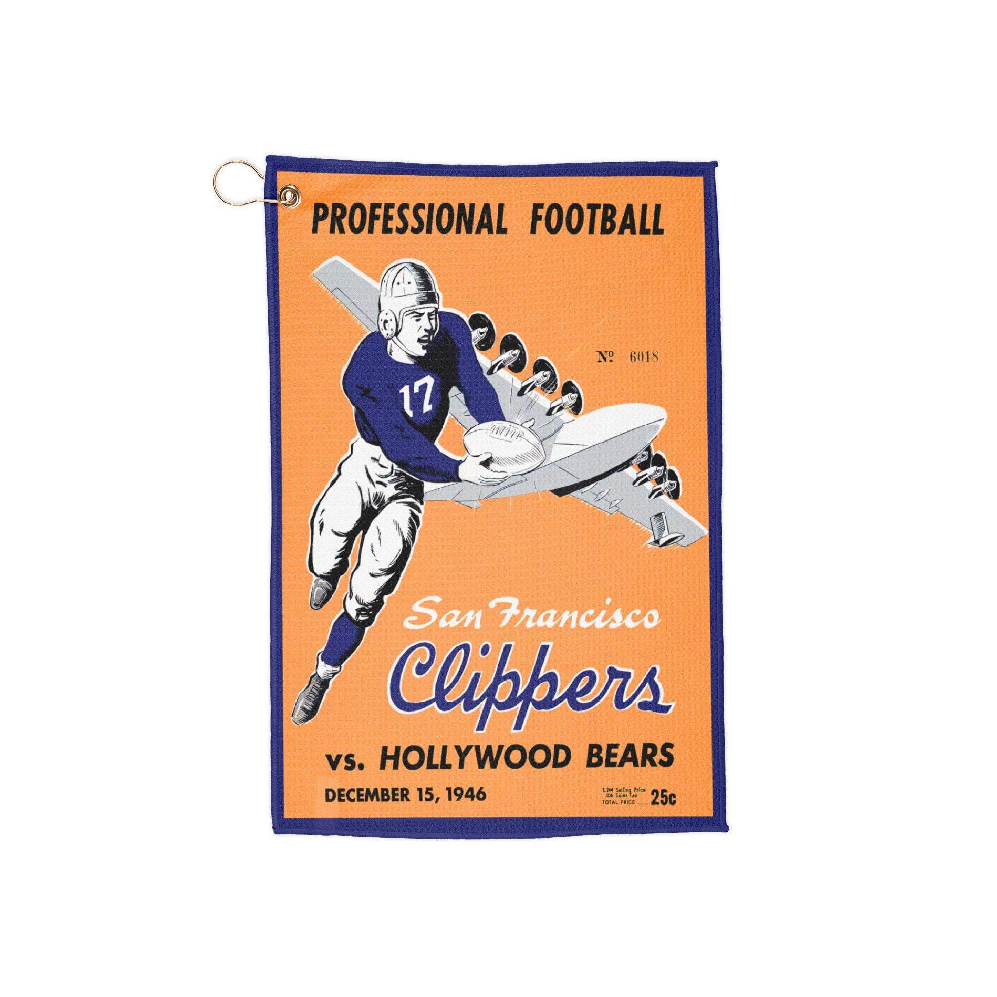 Bring a slice of vintage San Francisco sports history to your bag with this compact, rugged golf towel. The 1946 Football San Francisco Clippers design has a worn, archival feel that reads like a page from a local sports ledger — faded ink, bold team name, and a retro badge that nods to postwar grit. Lightweight and quick to dry, the towel moves with you through practice rounds, range sessions, and warm-weather outings. Slip it onto a bag by the gold grommet, wipe clubs between shots, or use it after a sweaty walk from the lot; it’s built to handle the day without getting fussy. The single-sided print keeps the vintage artwork crisp while the microfiber weave does the real work: trapping moisture, dust, and grass with ease. For anyone who carries a love of classic Bay Area teams into their game, this towel feels like a small, well-worn talisman — useful, personal, and quietly proud.