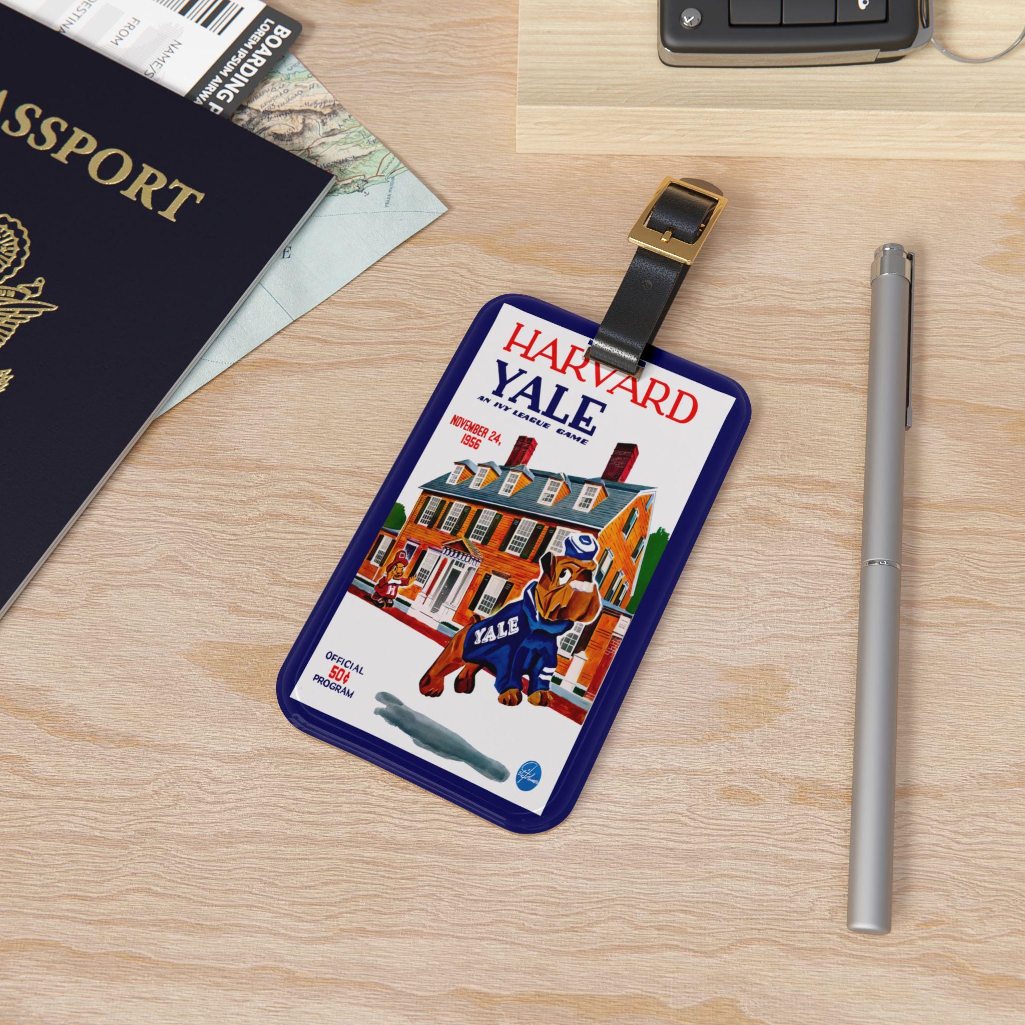 Stamped with a vintage 1956 Harvard–Yale football motif, this luggage tag carries a lingering hush of autumn stands and leather cleats. It tucks onto your bag and speaks to alumni, college-football nostalgics, and anyone who keeps game-day memories in their pocket. The glossy print captures the retro lettering and team energy, while the slim profile slips into travel routines without fuss. Attach it before a reunion, alumni weekend, or fall road trip and let the tag quietly announce where your loyalties — and your stories — begin.