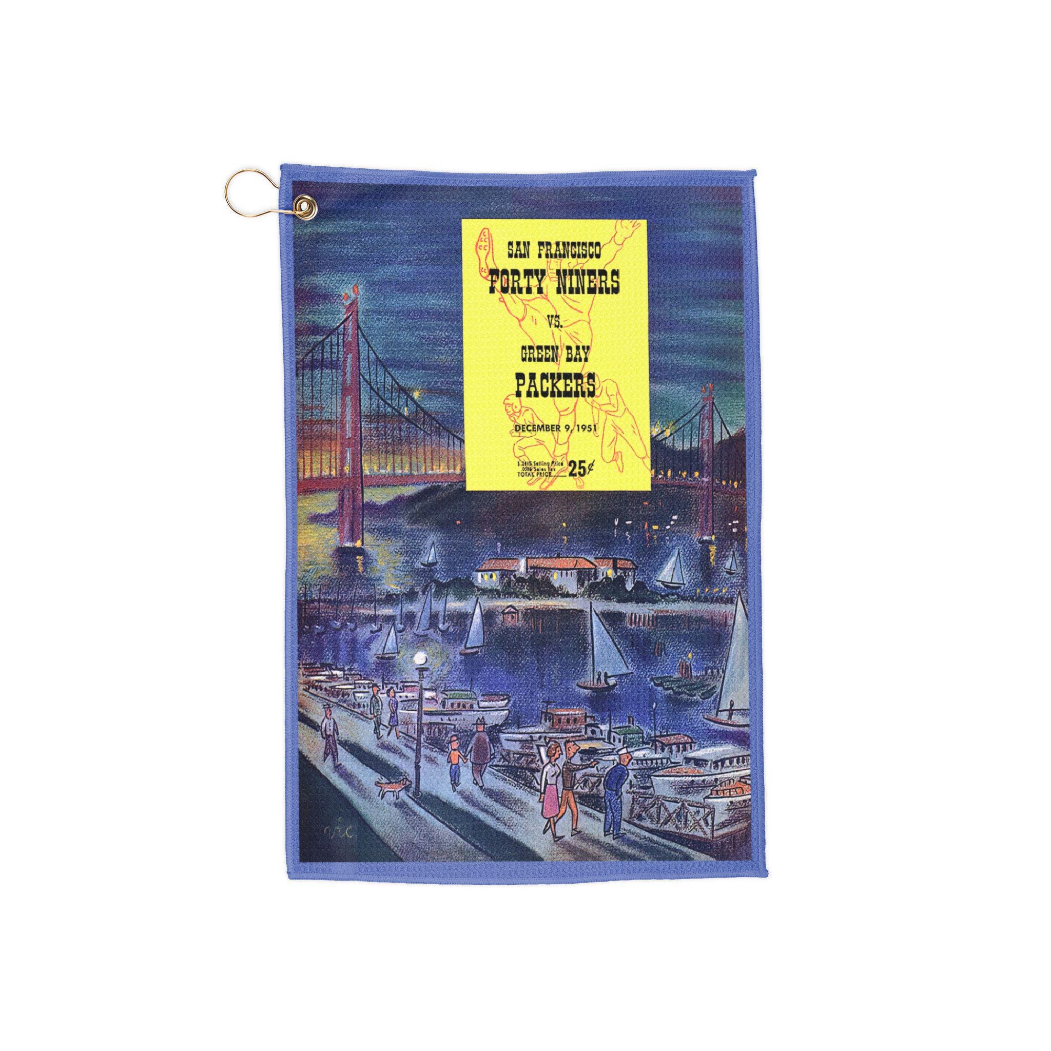A vintage-styled golf towel that carries the grit of a 1951 gridiron clash between the 49ers and the Packers. The faded, retro print evokes sun-baked afternoons on municipal courses and the crack of helmets on cold, clear Saturdays. Lightweight and quick to pack, it tucks into a bag or clips to a belt ring so it’s always within reach between shots. The gold grommet and ring add a bit of old-school hardware that nods to locker-room traditions while the microfiber face dries clubs, grips, and hands fast. Bring a piece of sports history on the green — a small, wearable memory that fits with rounds, road trips, and tailgate mornings.