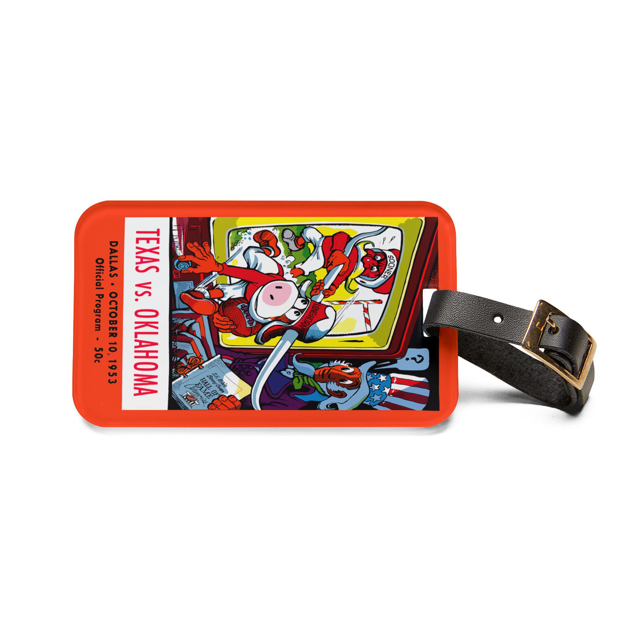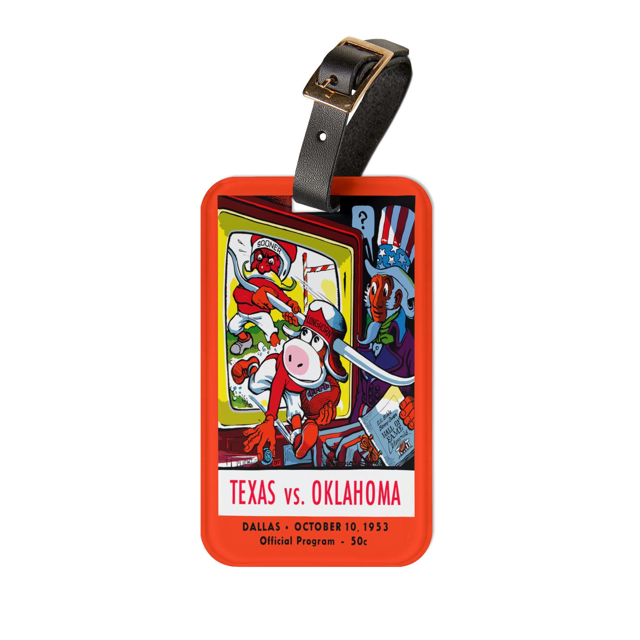 This luggage tag carries the grit and rivalry of 1953 football between Texas and Oklahoma — a compact, tactile piece for anyone who travels with team spirit. The acrylic face holds a single-sided, glossy print that makes the vintage game-day graphic pop. Thread the adjustable black leather strap through your bag and know the tag will weather airports and tailgates alike. Inside, a rear slot keeps your contact card tucked away yet accessible. Bring a touch of sports history on every trip and let your bag tell a story before you even arrive.