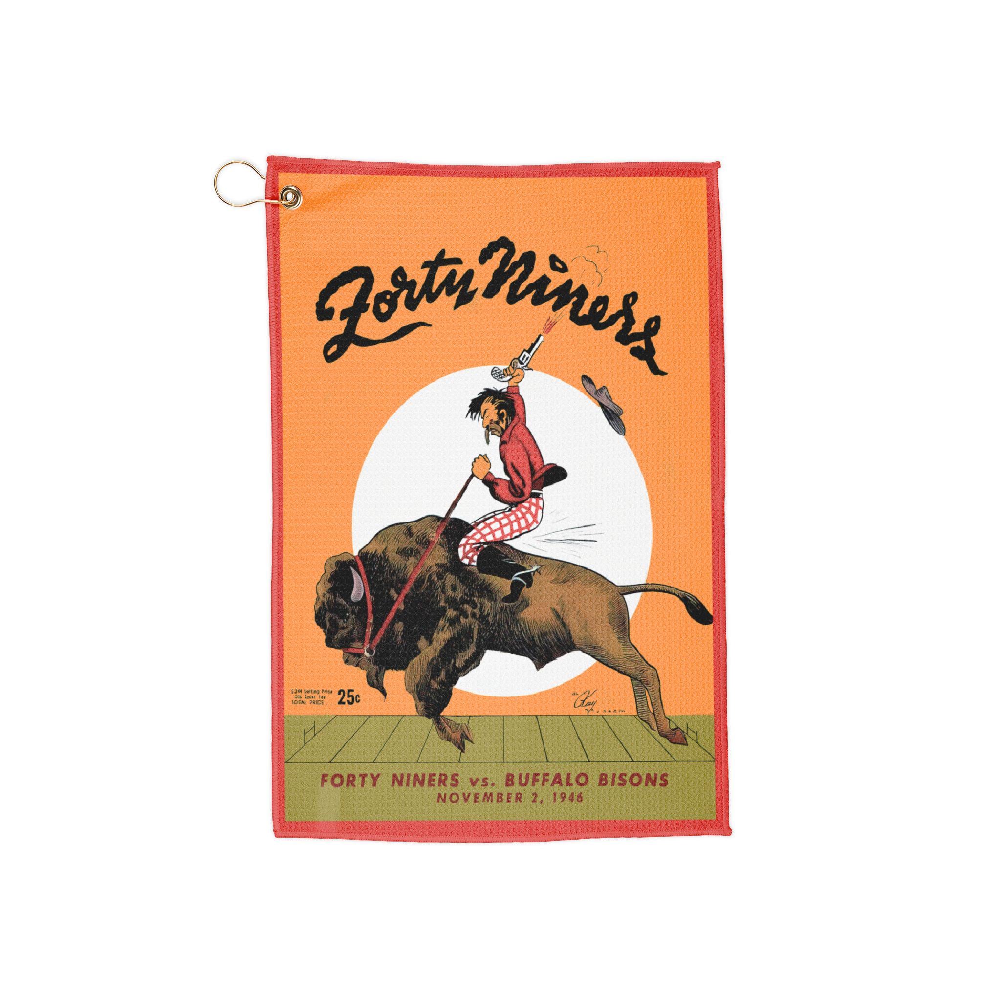 Carry a piece of vintage rivalry to the green. This golf towel channels the 1946 San Francisco vs. Buffalo football era with a worn, retro print that feels like it belongs in the corner of a locker room or tucked into an old playbook. Soft microfiber soaks up sweat and splatter between shots, while the gold grommet and ring clip cleanly to your bag. Lightweight and compact, it unfolds when you need it and tucks away when you don’t—use it during a long round, on a practice tee, or clipped to your bag for weekend course rituals. The muted, single-sided print keeps the look subtle and nostalgic, made for golfers who appreciate sports history and a bit of old-school grit on the course.