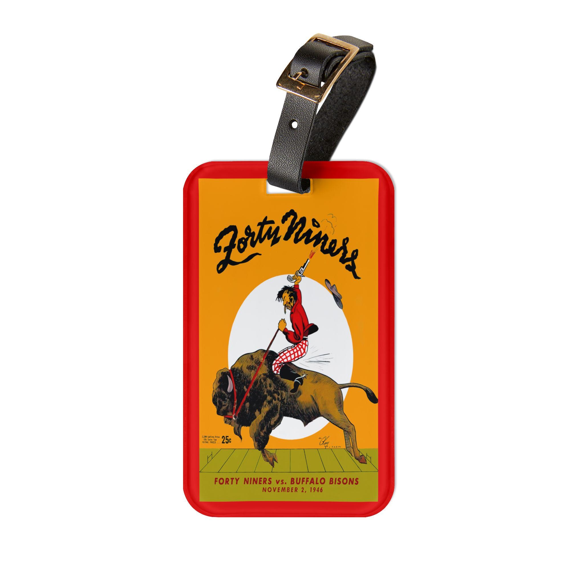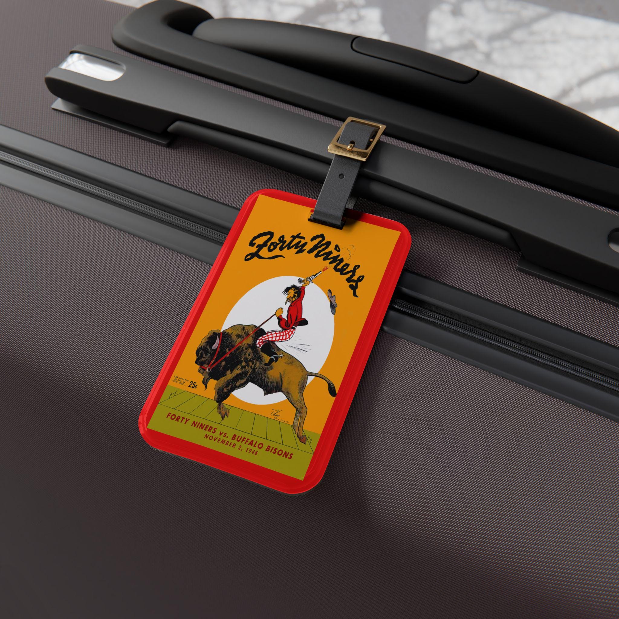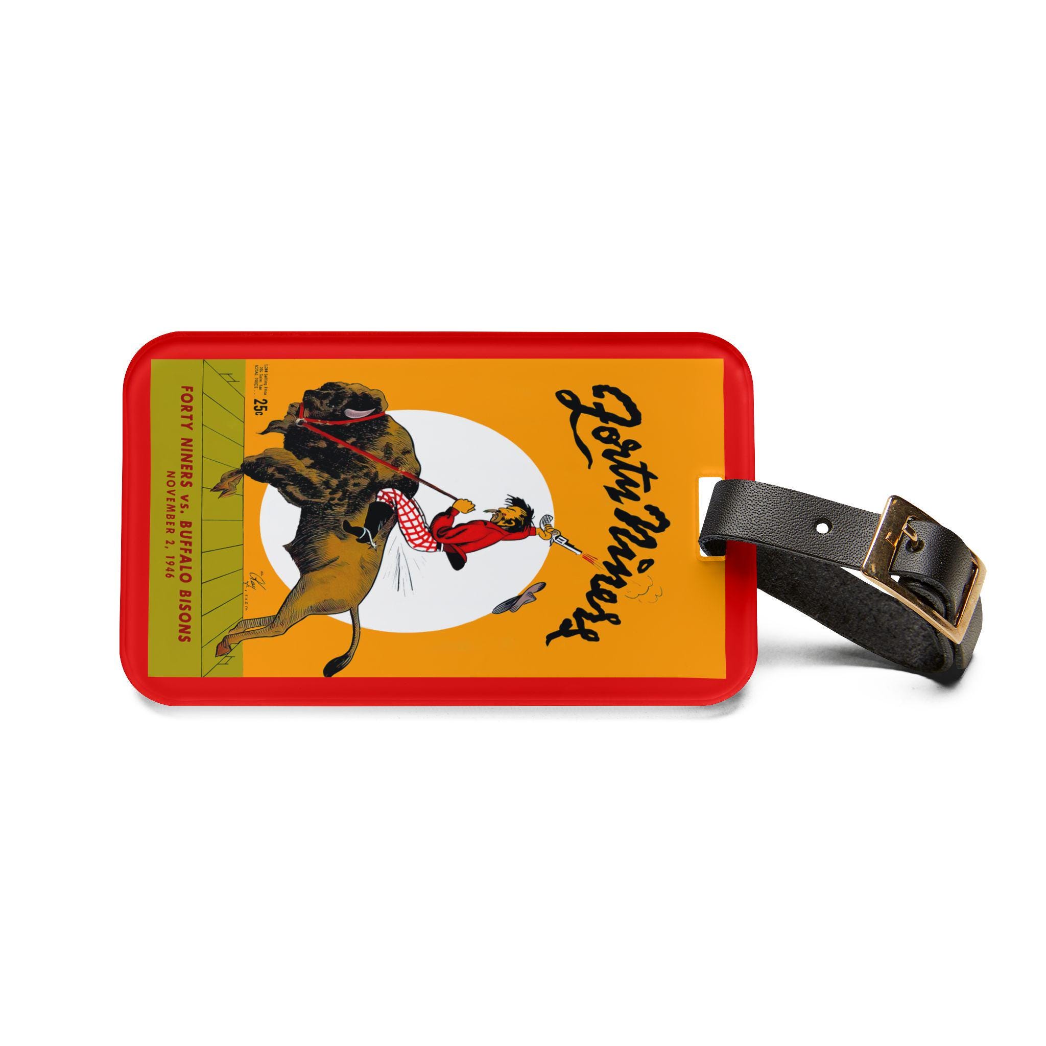 This luggage tag carries a vintage sports pulse — a 1946 football motif that nods to San Francisco and Buffalo’s early gridiron days. It’s small and bold: a glossy, single-sided print on durable acrylic that catches light and attention as you wheel your bag through terminals. The black leather strap and rear business-card pocket keep your contact info secure and accessible. For travelers who love sports history, long weekends to away games, or fans who pack game-day pride, this tag slips onto a bag and keeps that story close, worn-in and visible every trip.
