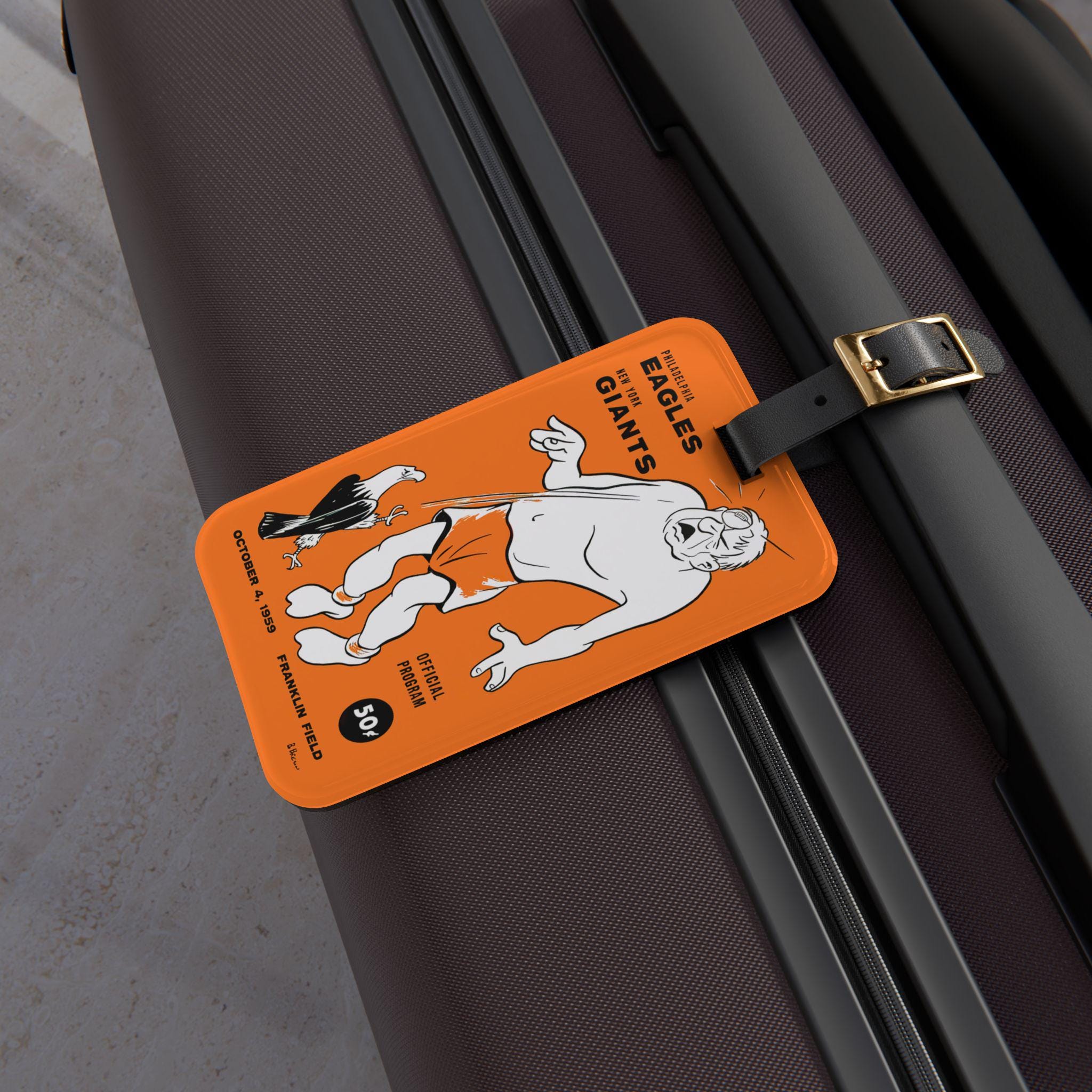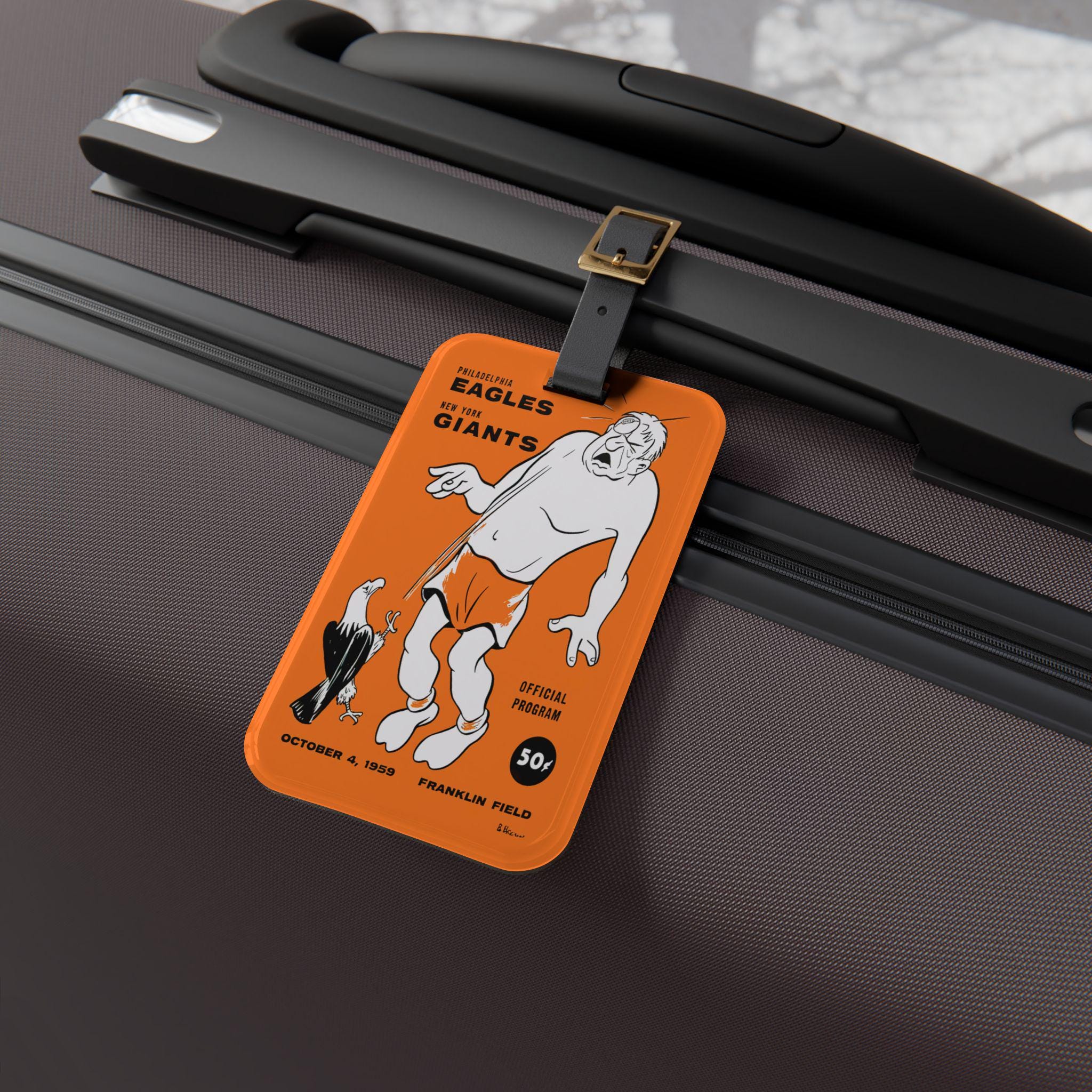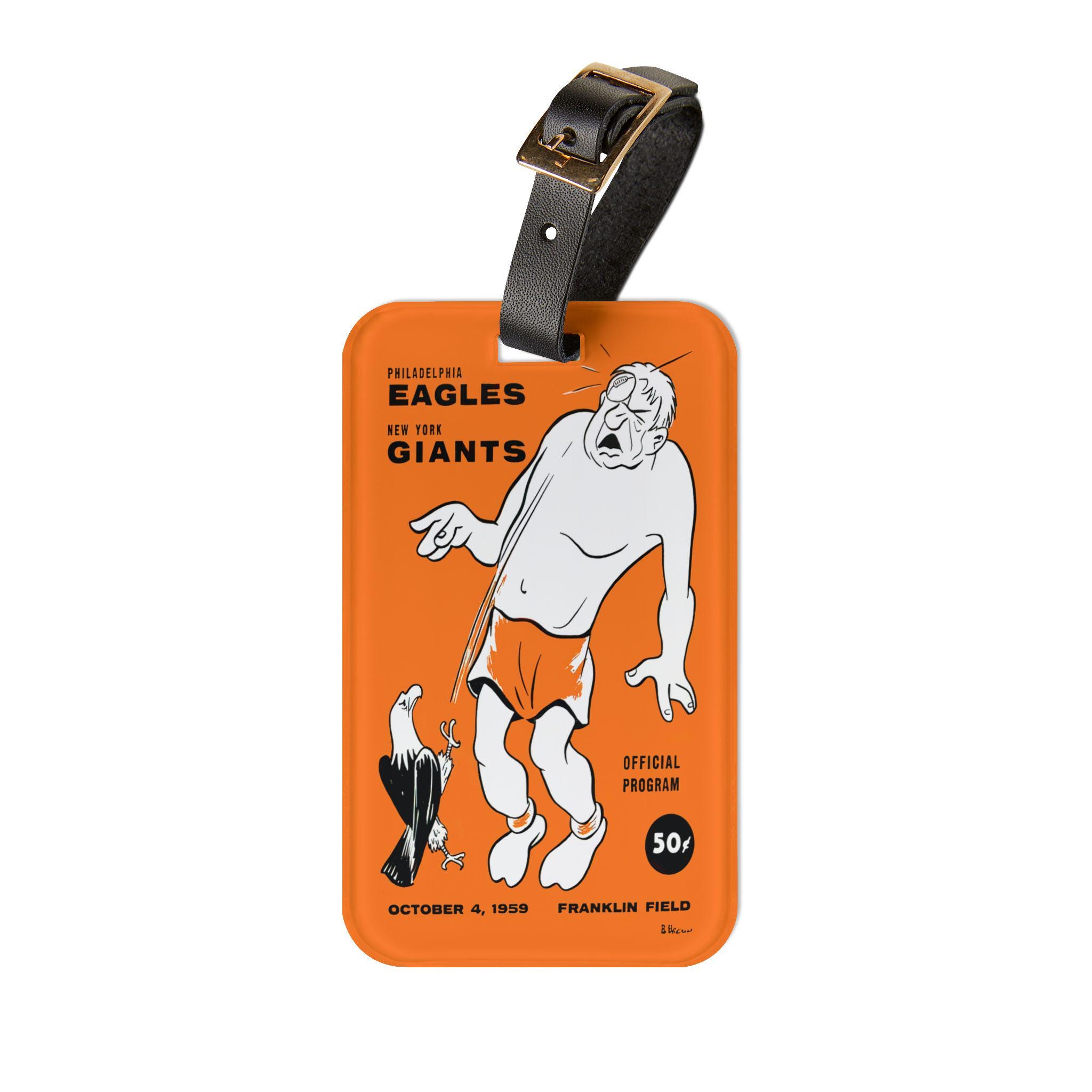 Wear a piece of game-day history with this compact luggage tag that channels the grit of 1959 football clashes between New York and Philadelphia. The bold vintage scoreboard-style design sits on a glossy acrylic face, its bright colors refusing to fade as your bag travels from commuter trains to cross-country flights. Attach it with the adjustable black leather strap and tuck your contact card into the rear opening — practical, tough, and full of character. It slips onto a carry-on or duffel and reads like a nod to long afternoons in the stands, cold air, and the echo of cheering crowds.