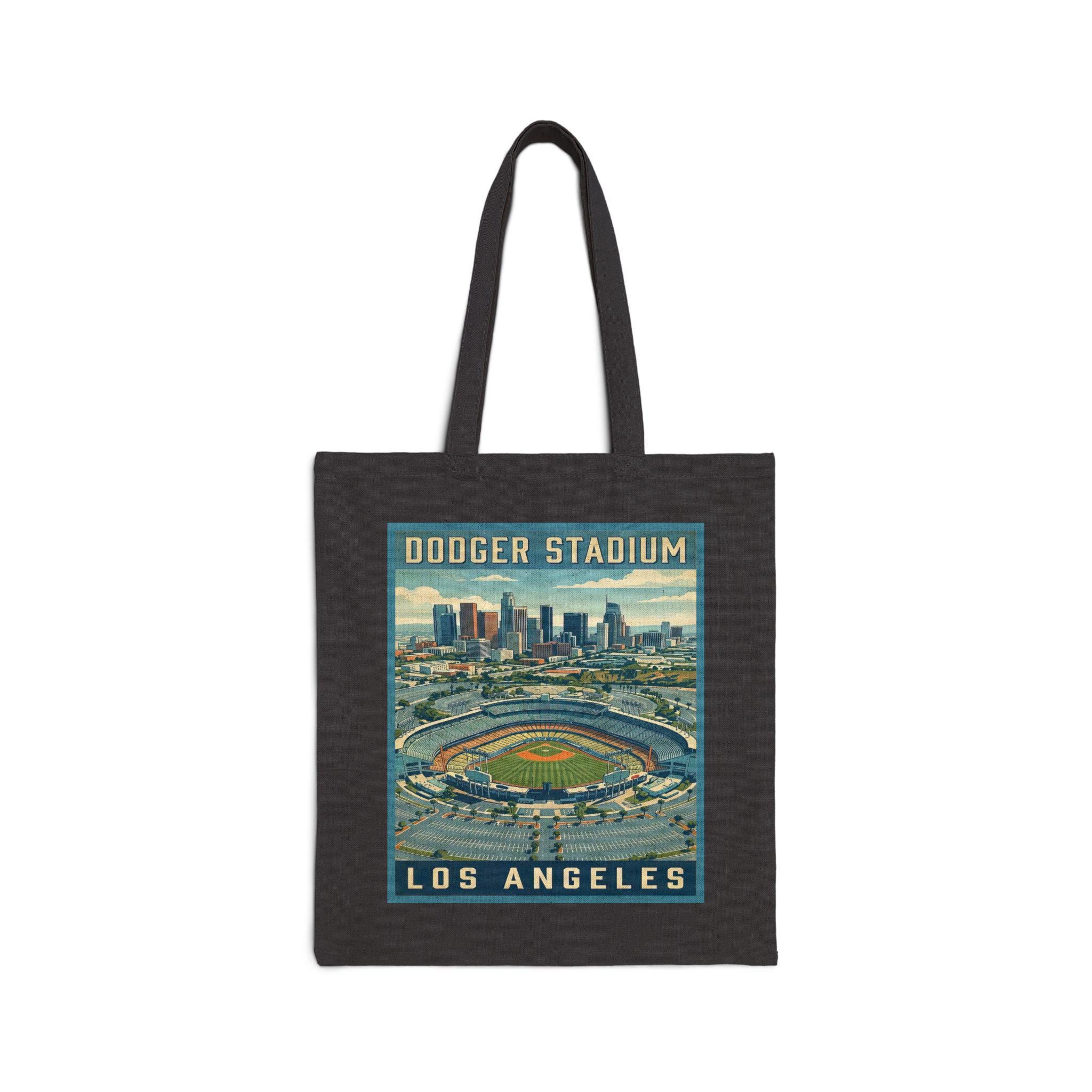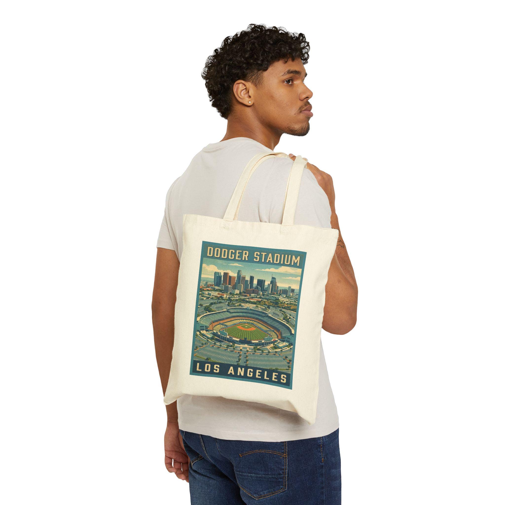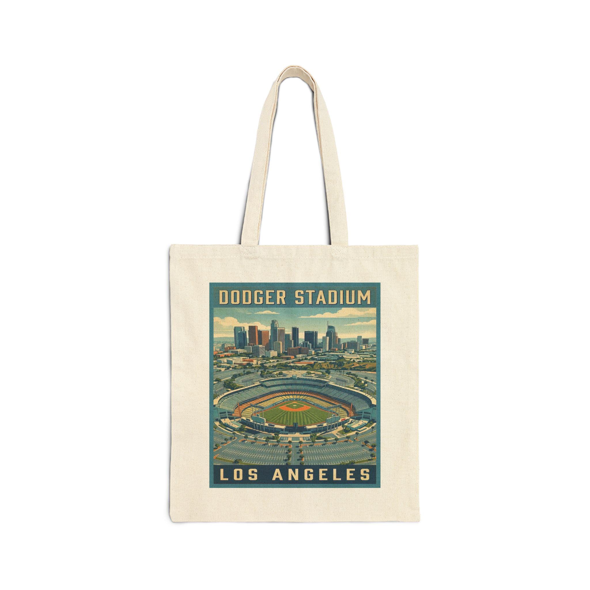 This cotton canvas tote carries a touch of vintage Los Angeles—bold WPA-style lettering and a timeless Dodger Stadium motif tell a story before you reach inside. The heavy 12 oz canvas holds its shape and shoulders the day’s haul: books, groceries, game-day essentials, or a rolled-up blanket for a sunset at Chavez Ravine. Sturdy self-fabric handles and reinforced stitching mean it moves with you from the subway to the stands. The flat-corner construction gives a clean, graphic silhouette that lets the stadium artwork sit proud and readable. Available in natural or black, it feels lived-in from the first use and ages into your routine—an everyday nod to L.A. baseball and the architecture of mid-century poster art.