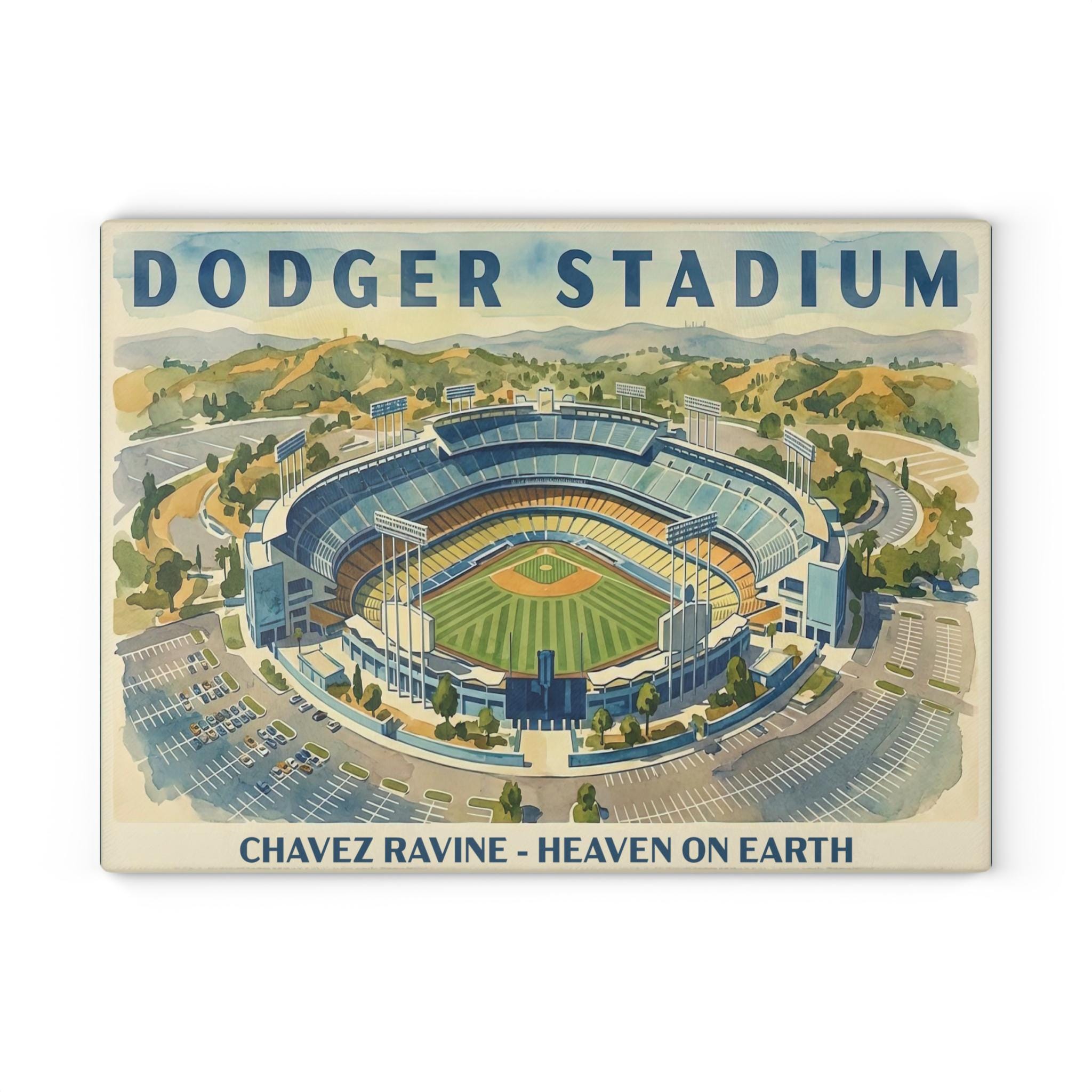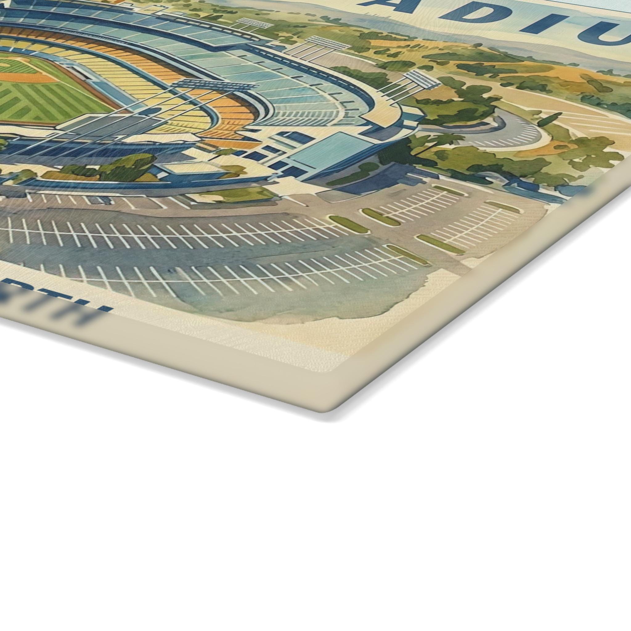 This tempered glass cutting board brings a slice of classic stadium nostalgia to your kitchen. The WPA-inspired watercolor of Dodger Stadium is rendered in vibrant, fade-resistant inks that hold up to daily use, turning meal prep into a small ritual of memory and color. It feels cool and substantial under your hands; the textured glass surface gives gentle traction for chopping while staying more sanitary than wood or plastic. Four rubber feet keep the board steady on the counter as you work. Choose the smaller board for quick tasks and the larger size for bigger spreads. Hand-wash gently to preserve the print and keep that watercolor glow bright through every game-day snack and family gathering.