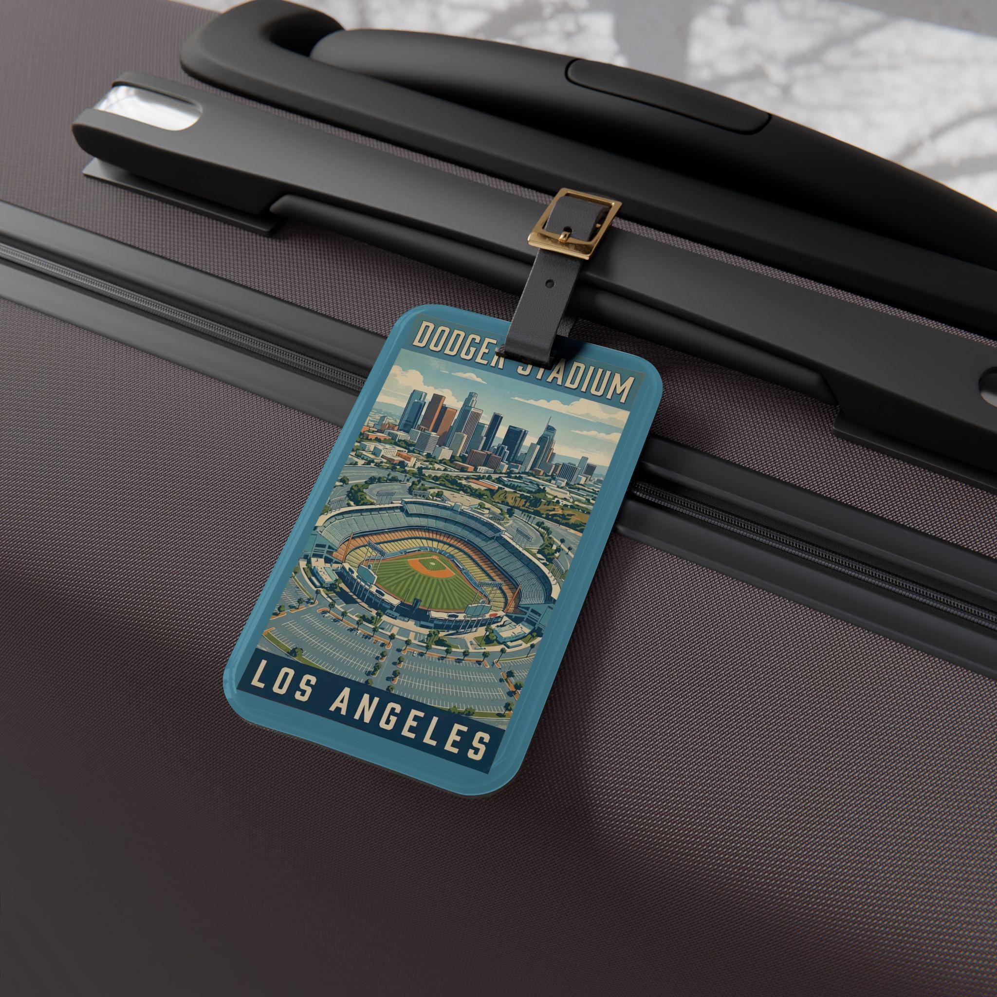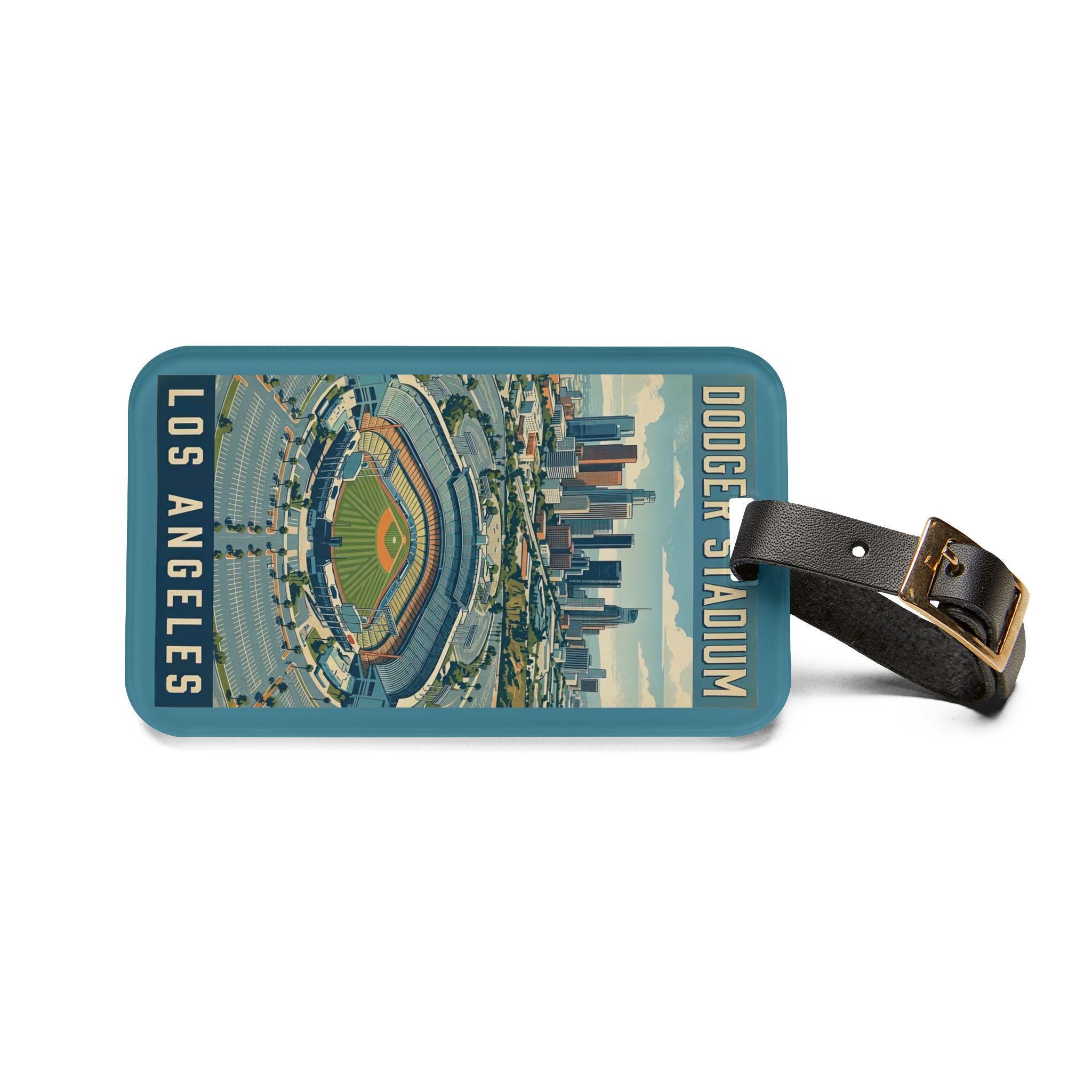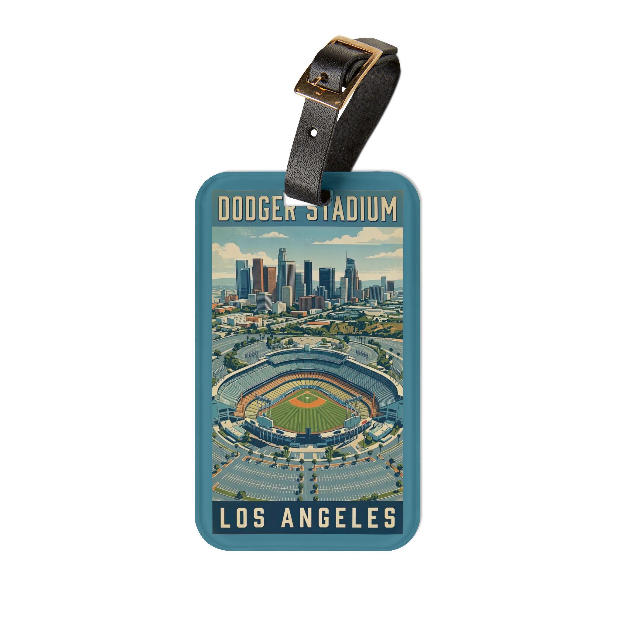 A small, bold luggage tag that channels the streamlined energy of WPA-era posters and the bright spirit of Dodger Stadium. It feels like a pocket-sized poster you can clip onto a bag — clean geometric shapes, sun-drenched blue, and a vintage-modern edge that makes your suitcase stand out at the carousel. For fans who live for LA baseball rituals, weekend road trips to Chavez Ravine, or those who collect sports ephemera, this tag slips into their routine: clipped on a worn weekender, peeking out of a commuter bag, or tucked onto a kid’s backpack before a ballgame. The glossy front keeps the art vivid, while the leather strap and rear card slot add practical, long-lasting details. It gives everyday travel a little of that stadium-side adrenaline without saying a word.