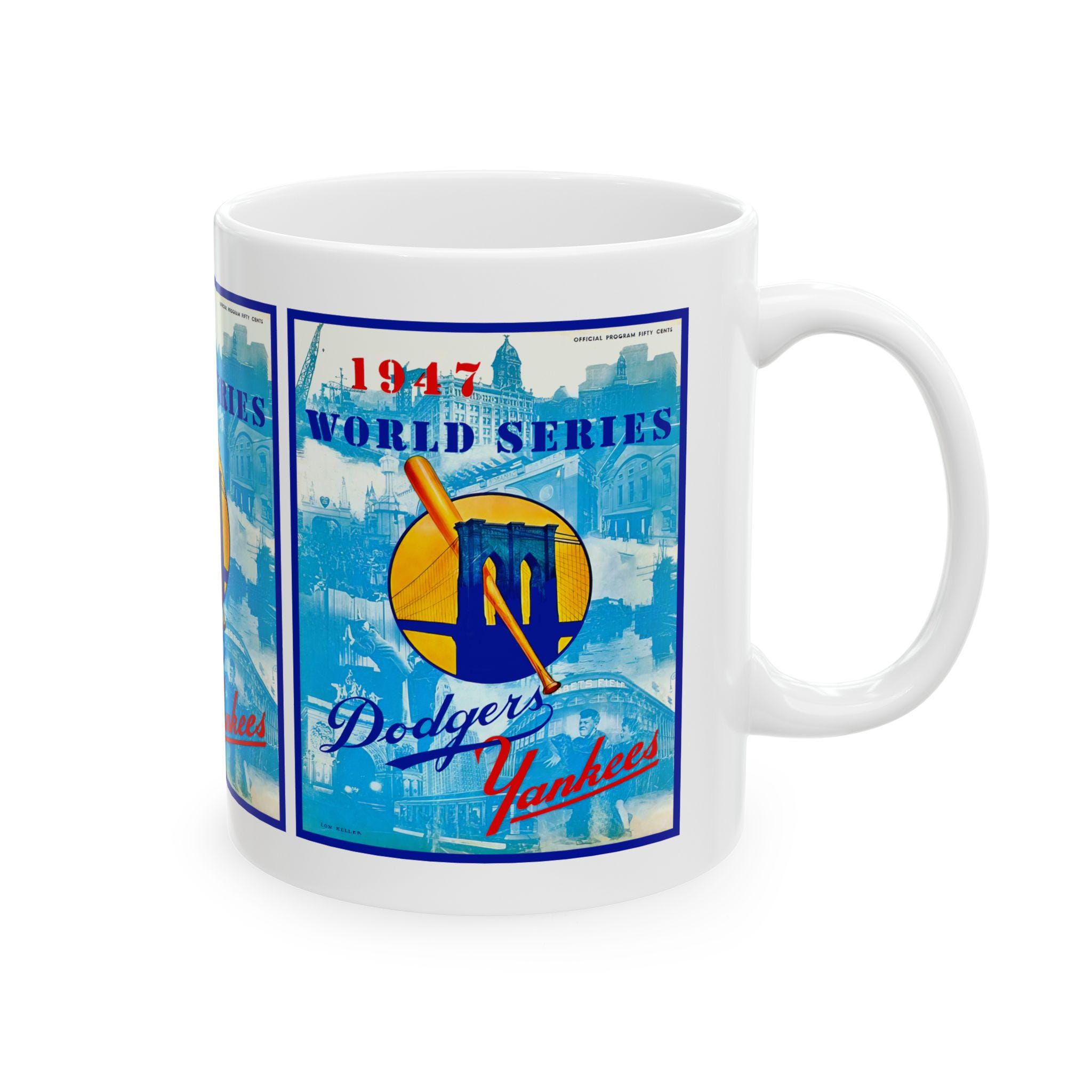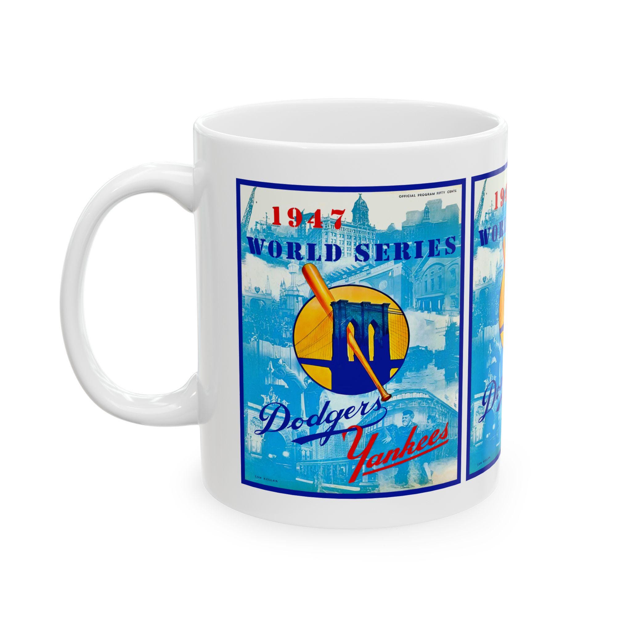 Carry a piece of baseball history into your morning routine. This ceramic mug celebrates the 1947 World Series showdown between Brooklyn and New York, evoking the crack of the bat, the rumble of the crowd, and the worn leather of a game-day glove. It feels right in the hands of someone who collects sports nostalgia or spends slow Sundays reminiscing over box scores and old radio broadcasts. Use it during quiet mornings of scorekeeping, while swapping stories with fellow fans, or on nights when you rewatch classic games. The glossy white ceramic and vibrant print keep the artwork sharp—this mug looks like it belongs on a shelf beside pennants and ticket stubs.