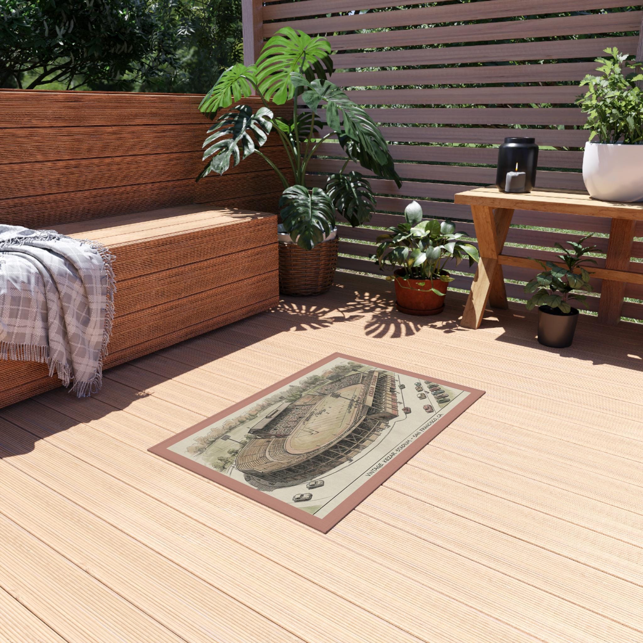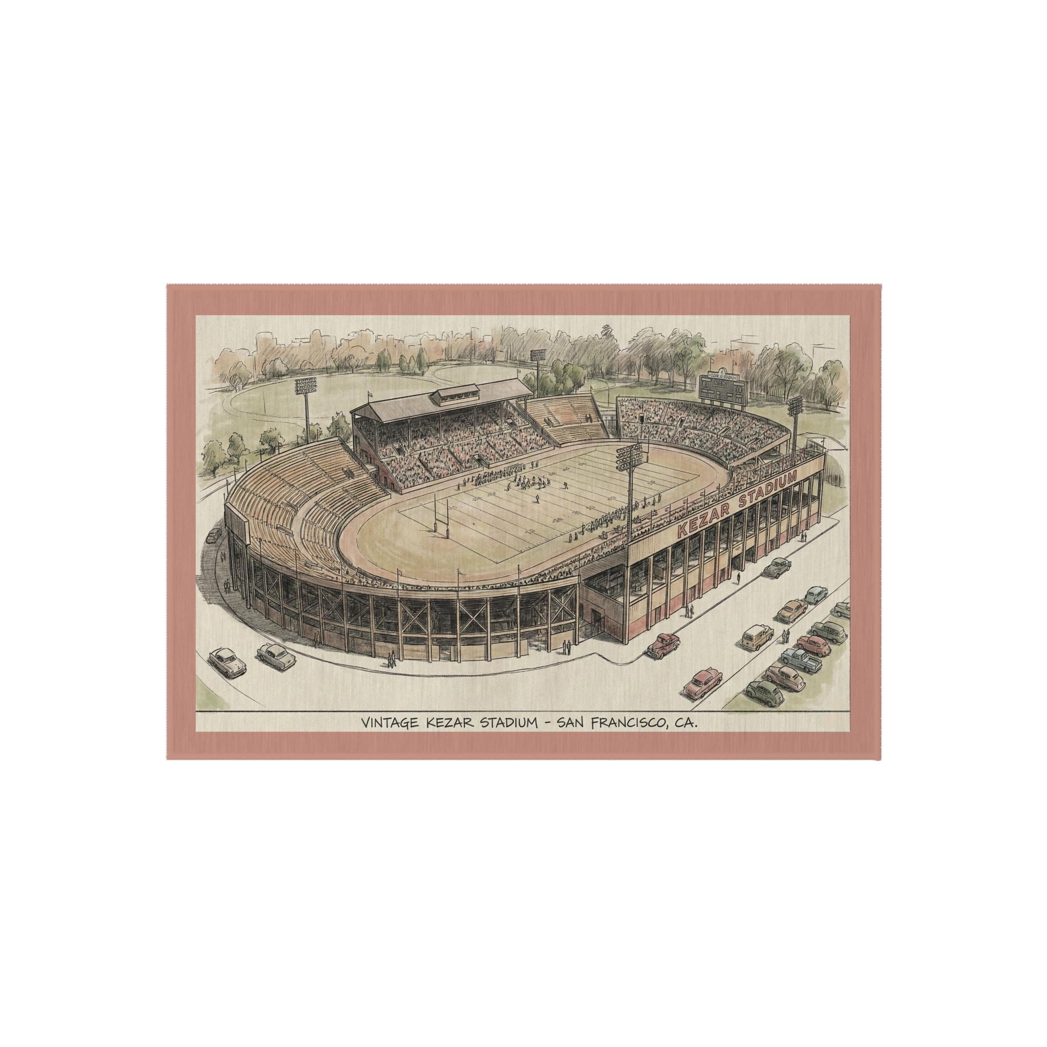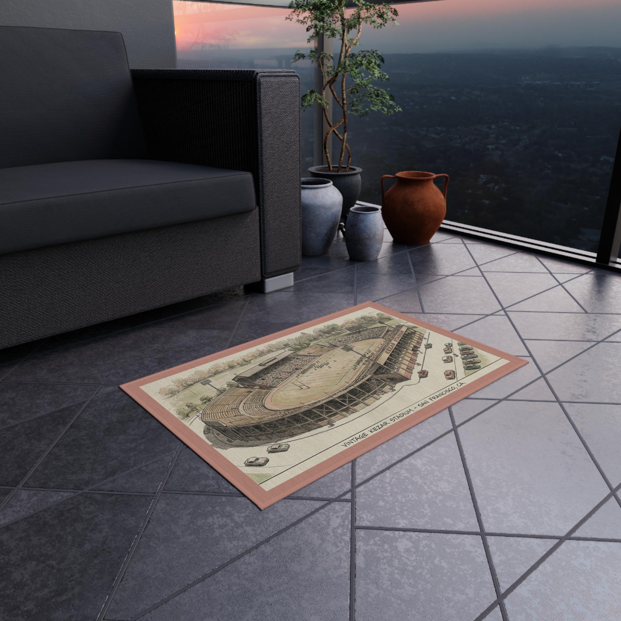 Bring a slice of San Francisco grit and stadium-day excitement to your porch, patio, or tailgate with this outdoor rug. The vintage Kezar Stadium motif wears its history proudly — faded banners, cracked concrete tones, and bold lettering that feels like bleacher sun on your face. Lay it down before the game, drape it across a picnic blanket, or use it to anchor an outdoor seating nook. The chenille pile is soft underfoot yet durable enough for shoes, while the non-slip backing keeps the scene steady through summer cookouts and rainy-day replays. Colors stay vivid like a well-loved jersey, and the hemmed edges keep the look tidy as the seasons pass.