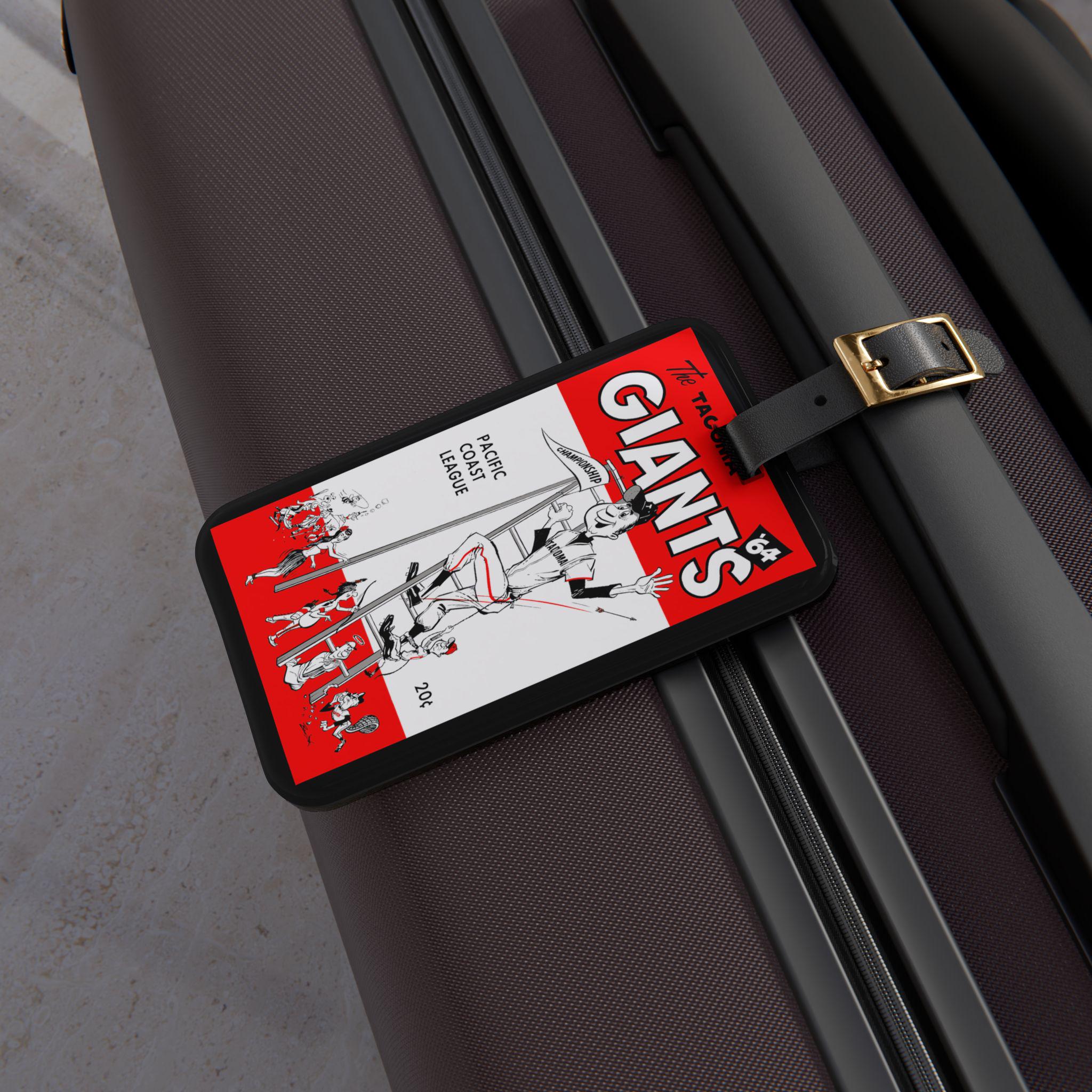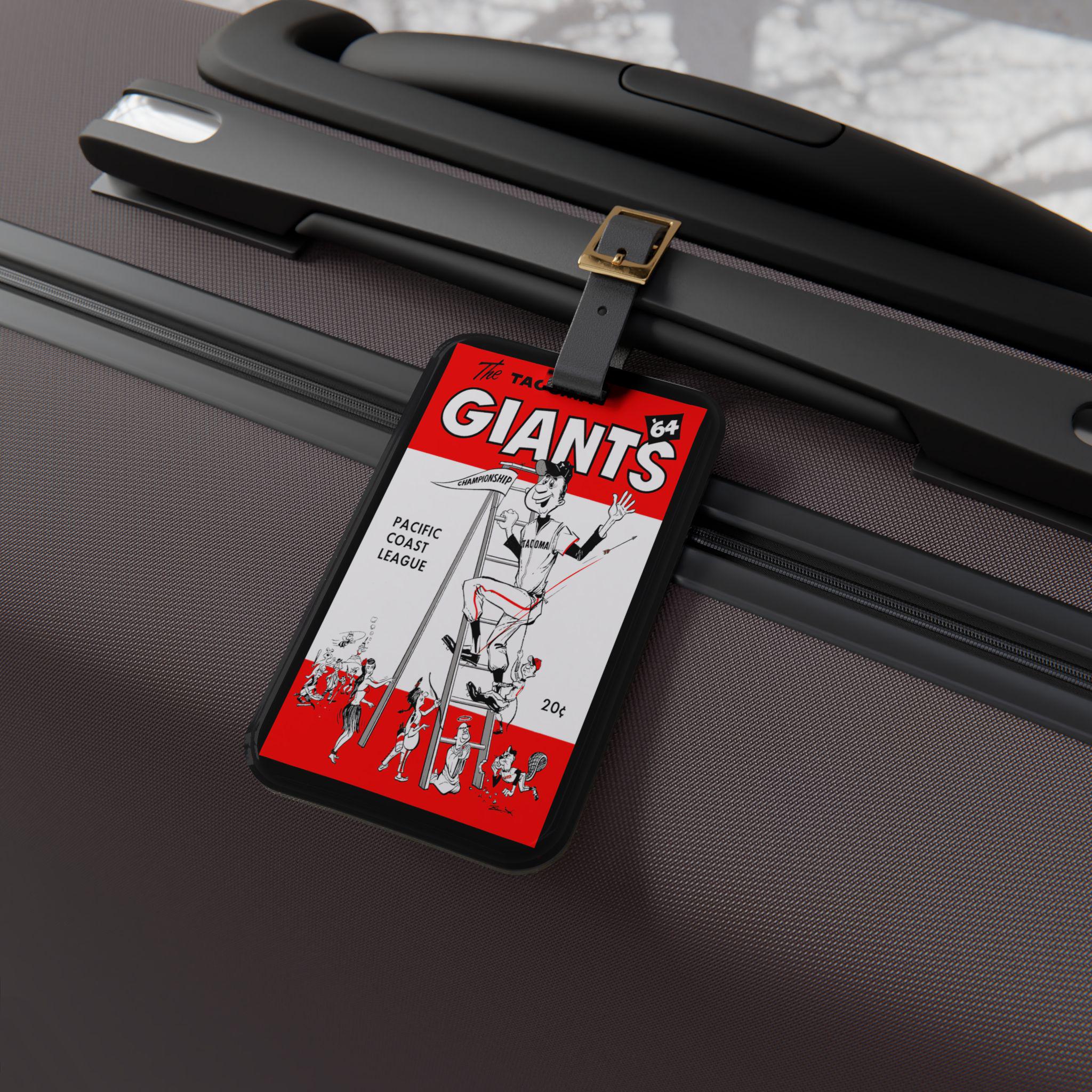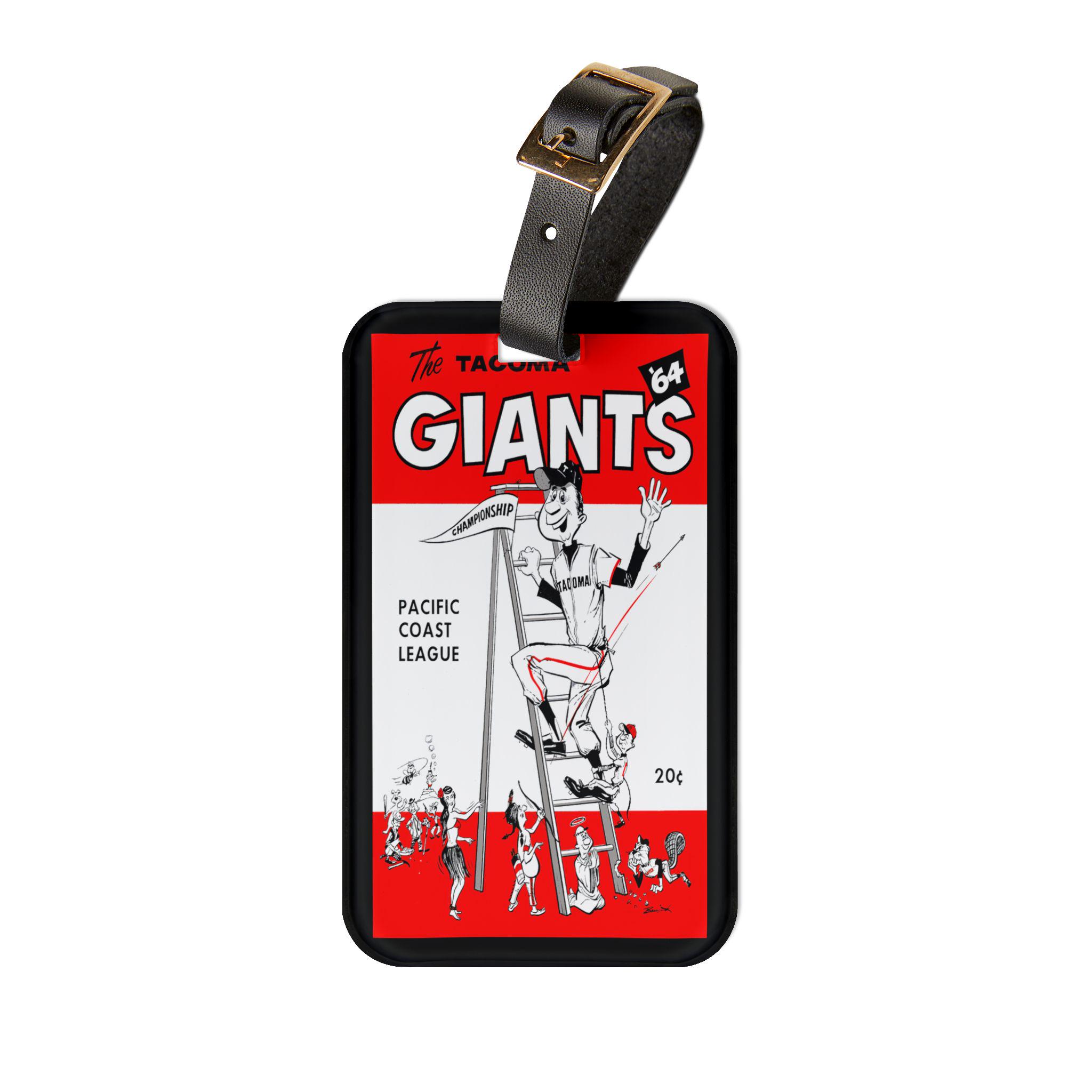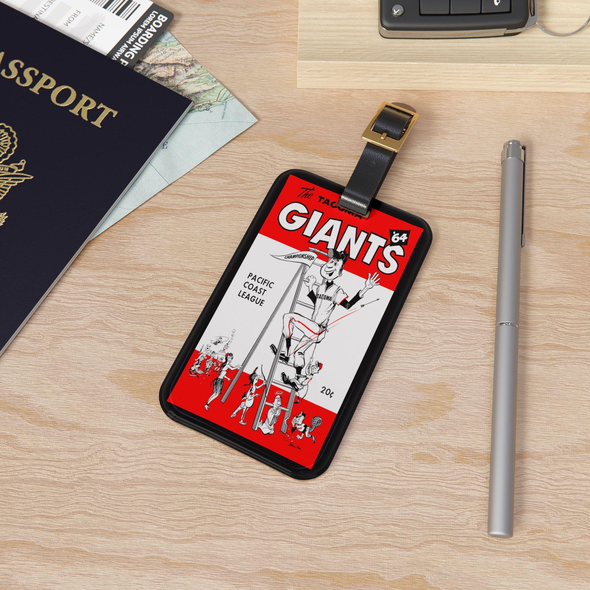 Carry a piece of baseball history with you. This luggage tag channels the gritty, sun-warmed energy of a 1964 Tacoma Giants pennant — bold numerals, vintage typography, and that deep, stadium-blue hue that brings back afternoons at the ballpark. It snaps onto your bag with a black leather strap and tucks a contact card into the rear pocket, so your gear looks like it belongs to someone who keeps score, remembers double plays, and collects stories as easily as tickets. Put it on your duffel for road trips to away games, clip it to a carry-on before a weekend back home, or let it live on the bag you take to morning batting practice. Small and solid, it reads like a nod to a specific team and season — the kind of detail other fans notice and appreciate.