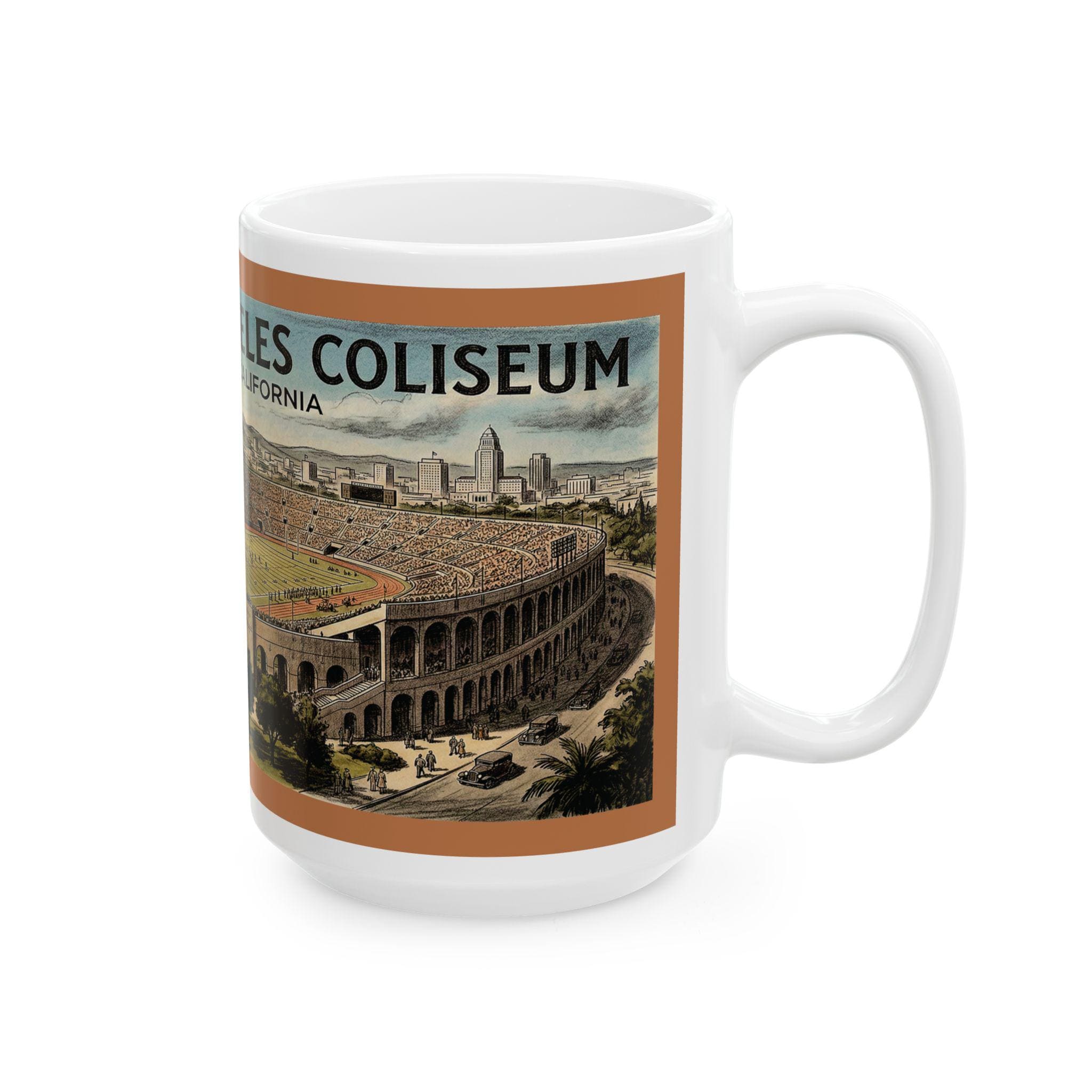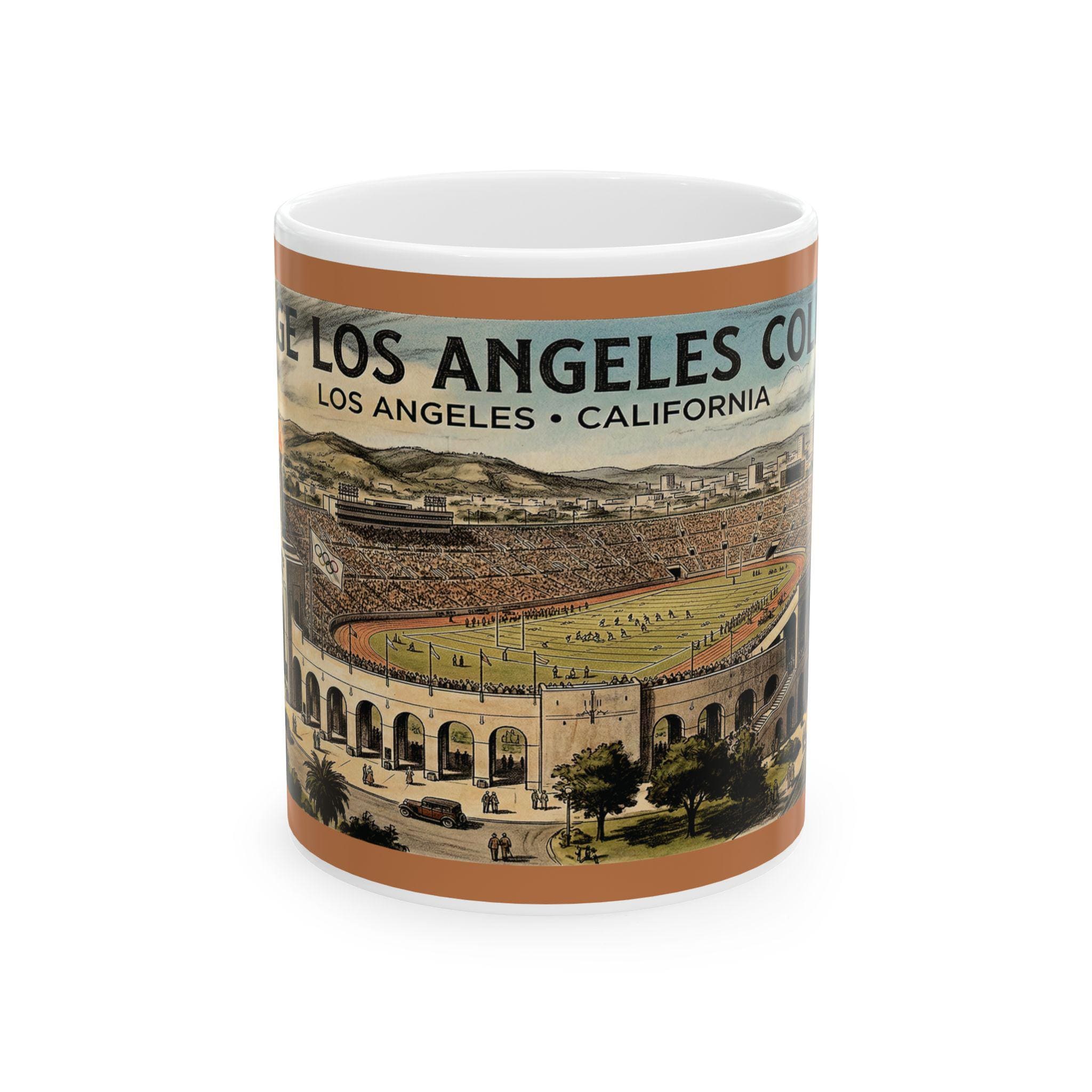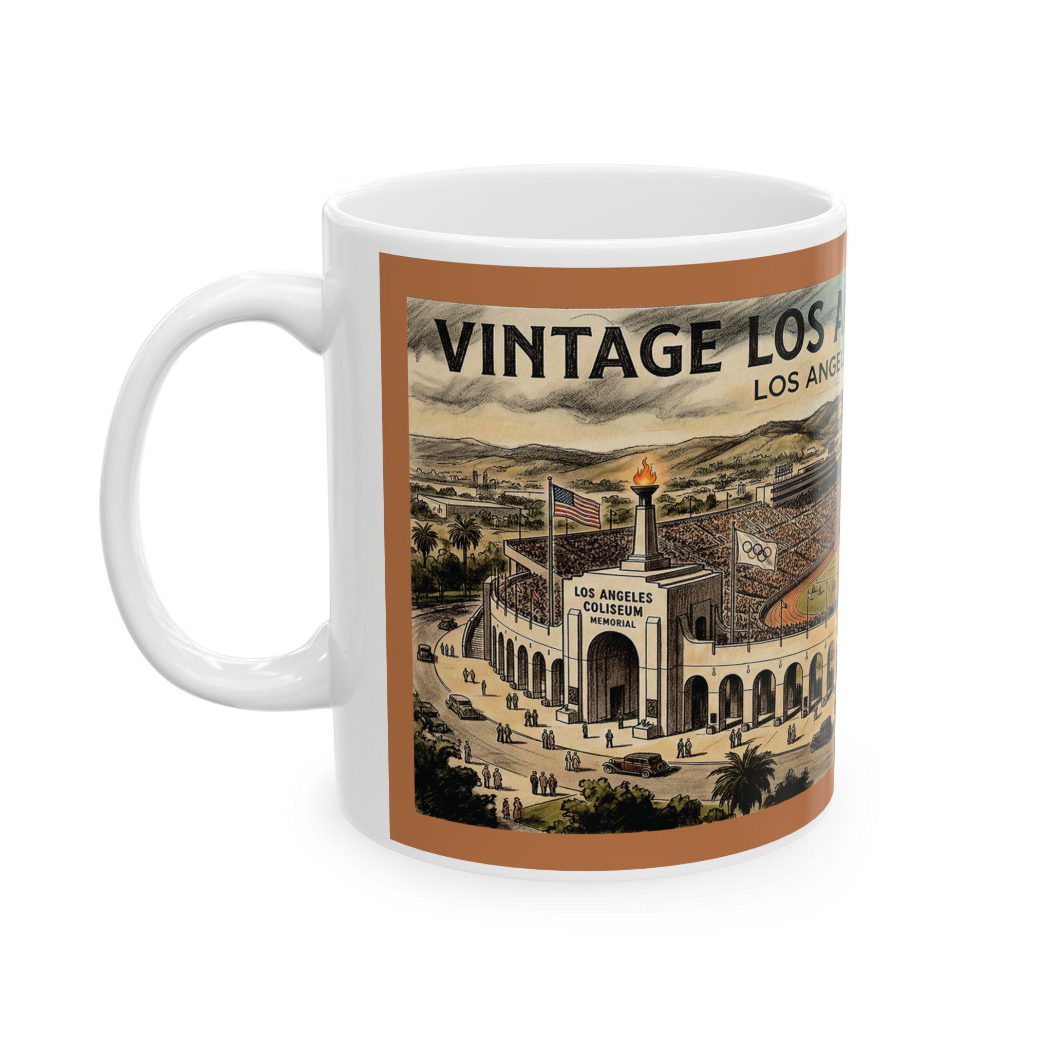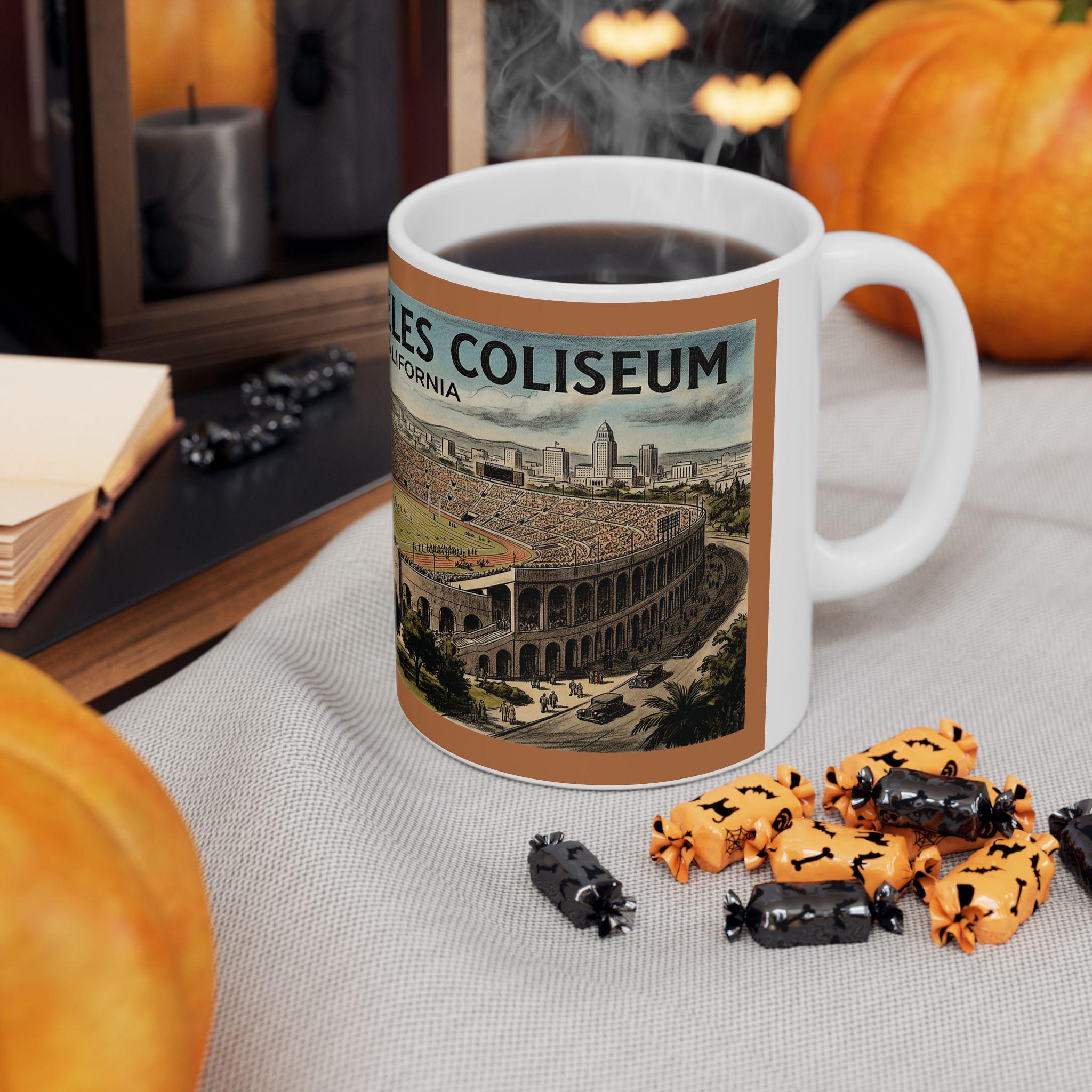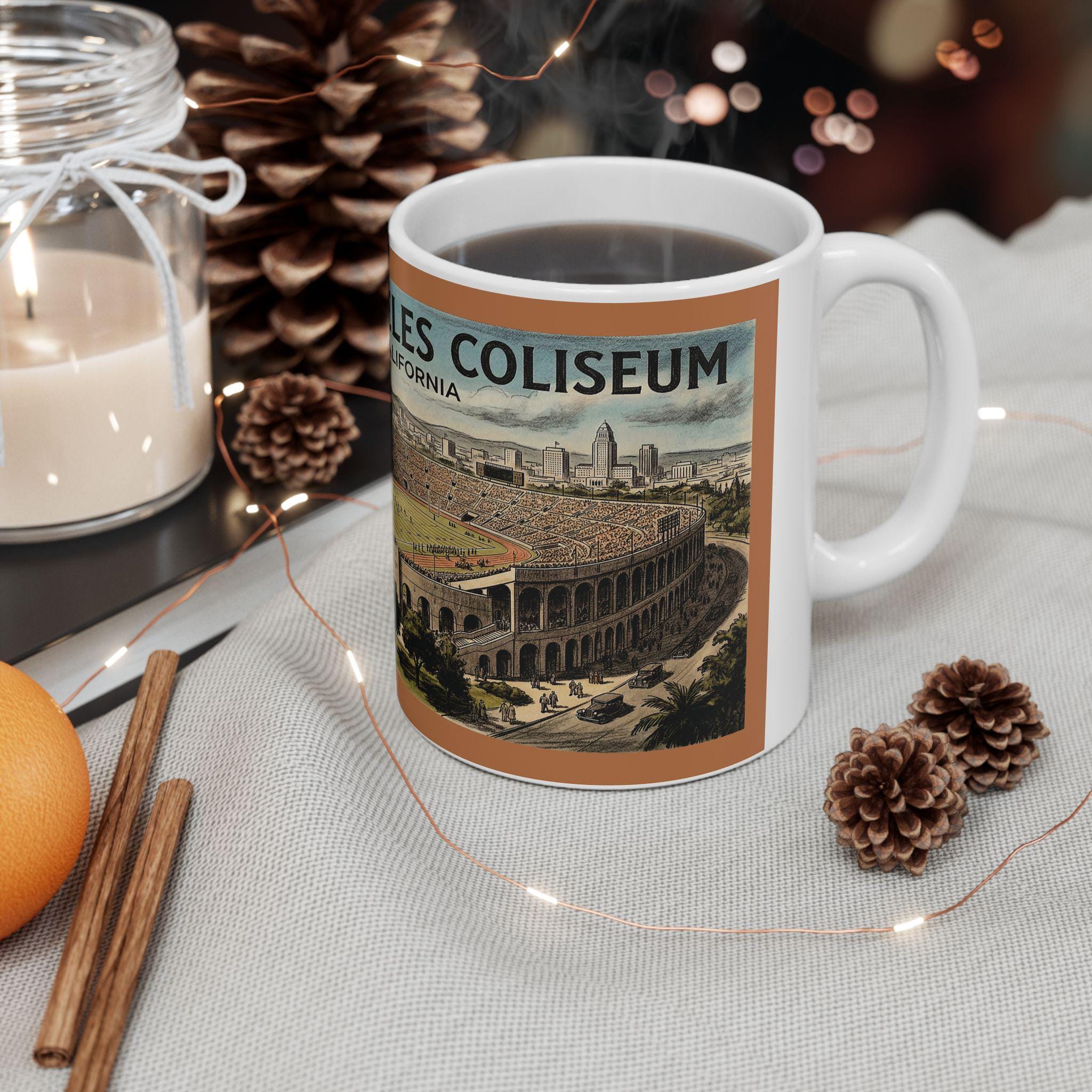 This glossy ceramic mug carries a hand-drawn, vintage-style illustration of the Los Angeles Coliseum — a quiet moment of city history cradled in your hands. Morning light catches the bright ink lines as steam rises, and the drawing turns a simple coffee ritual into a small act of remembering. It suits someone who loves urban architecture, old maps, and the layered stories of LA neighborhoods. Slip it into a weekend sketching session, set it down beside a stack of ticket stubs, or bring it to a low-key housewarming where conversation turns to landmarks and hometown memories. The illustration’s warm, worn-line aesthetic settles into whatever routine you already love, adding a bit of city character without shouting for attention.